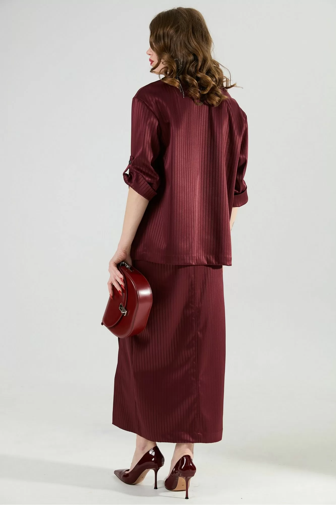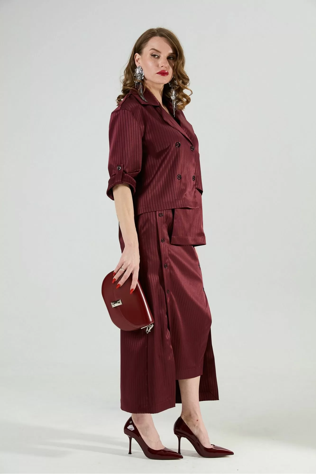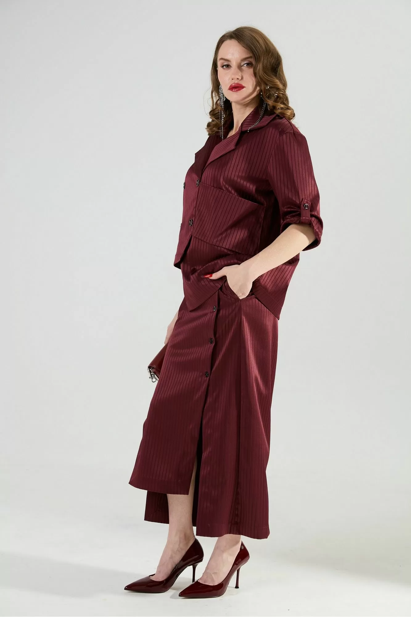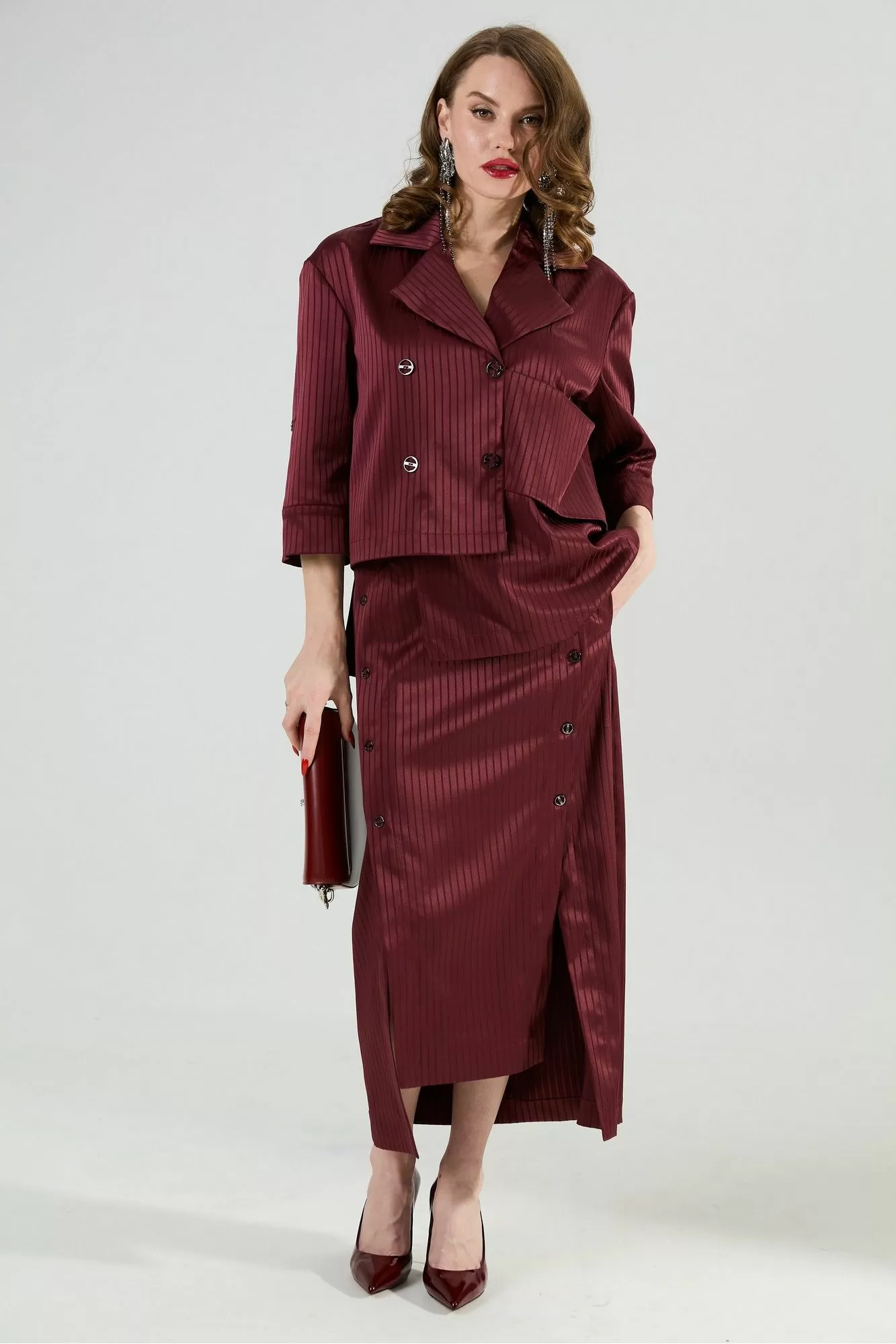 Юбка длиной миди, расклешенная к низу, с асимметричным низом. Пояс притачной, по спинке собран на резинку. Переднее полотнище состоит из трех частей. Правая часть скреплена отделочной строчкой и кнопками. В боковых швах изделия расположены карманы. По спинке изделия идёт средний шов и две вытачки для удачной посадки по фигуре. Юбка без подкладки.