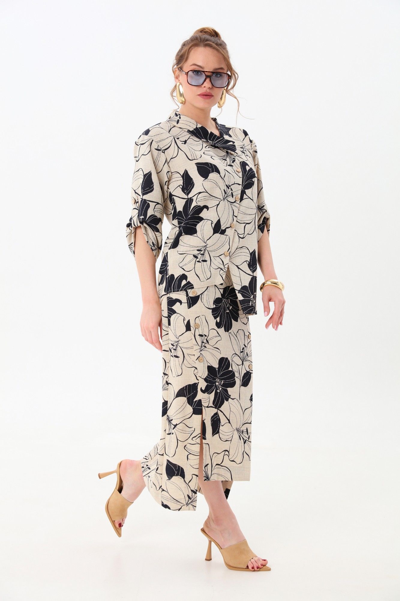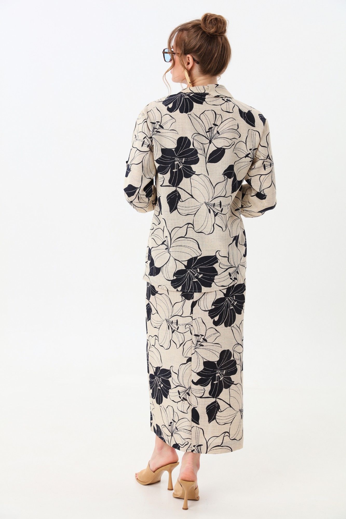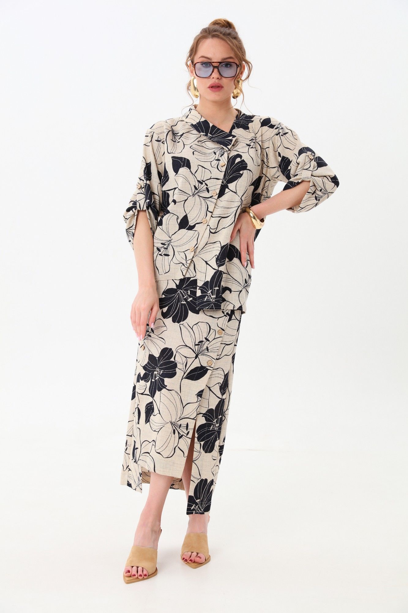 Костюм двухпредметный: состоит из жакета и юбки. Жакет рубашечного типа прямого силуэта с асимметричным низом. Рукав втачной со спущенной линией плеча, фиксируется на пату. Застежка центральная на петли и пуговицы, смещённая по косой. Воротник отложной на стойке до половины спинки.Юбка длиной миди, расклешенная к низу, с асимметричным низом. Пояс притачной, по спинке собран на резинку. Переднее полотнище состоит из трех частей. Правая часть скреплена отделочной строчкой и кнопками. В боковых швах изделия расположены карманы. По спинке изделия идёт средний шов и две вытачки для удачной посадки по фигуре. Юбка без подкладки.