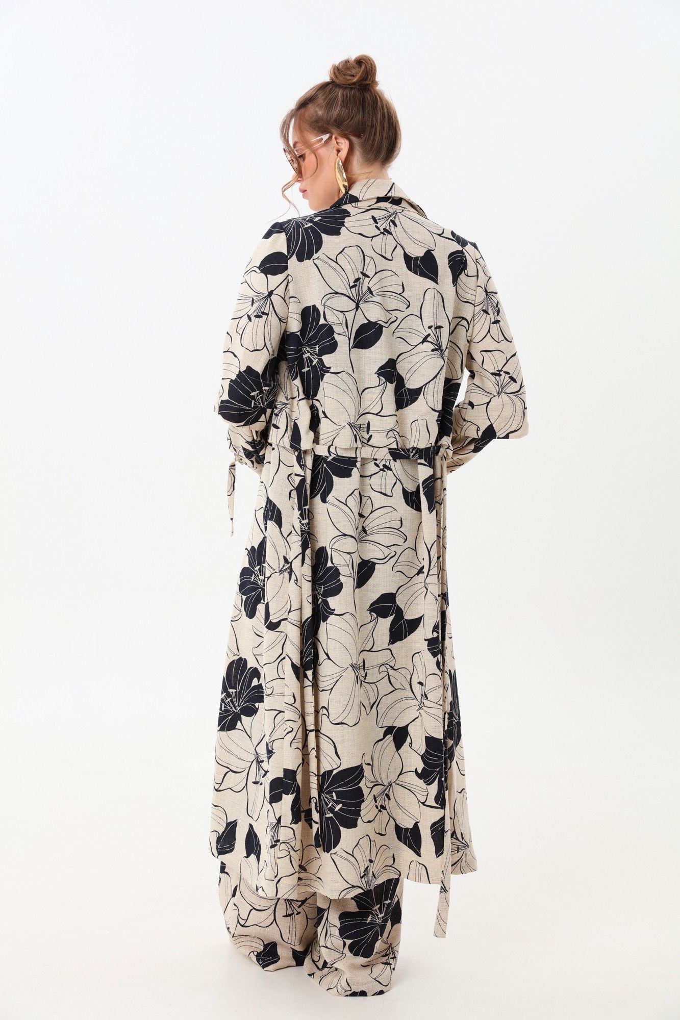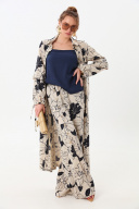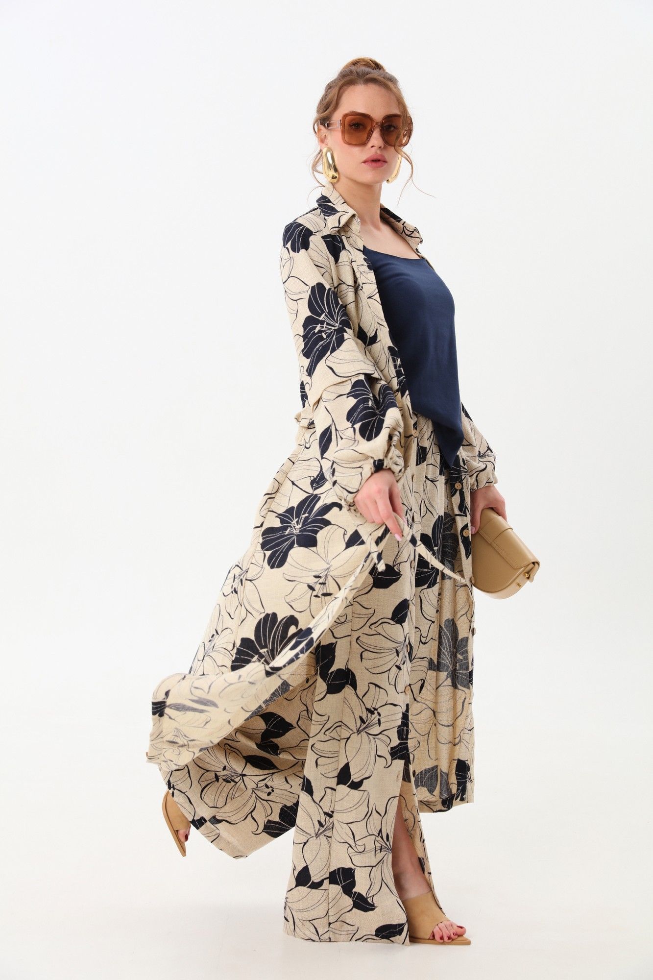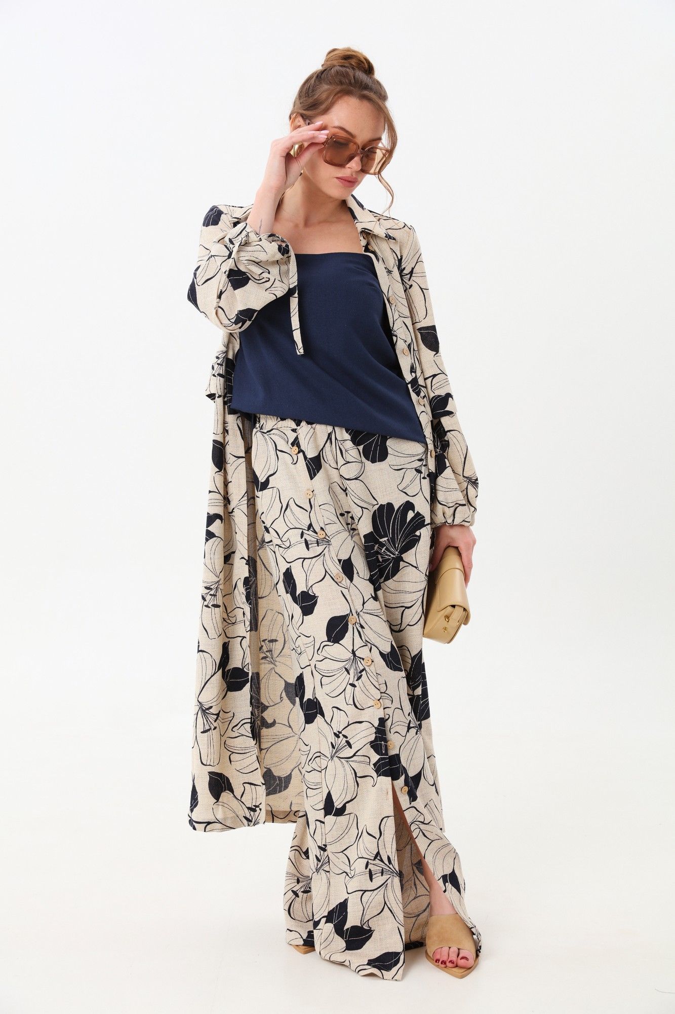 Костюм трехпредметный: состоит из кардигана-платья, брюк и топа. Платье-кардиган макси с центральной отрезной застёжкой на потайную планку на петли и пуговицы.По переду и спинке цельнокроеные складки на уровне талии. Рукав втачной,одношовный рубашечноно типа. По низу рукава пробиты петли и вставлена завязка для фиксации сборки . Воротник рубашечный стояче отложной. В комплект к изделию идёт пояс из основной ткани для максимально комфортного регулирования объёма. Брюки свободного кроя, верхний срез представлен широкой резинкой, с карманами. По центру правой брючины расположена планка с функционирующими петлями и пуговицами. Топ на тонких регулируемых бретелях.