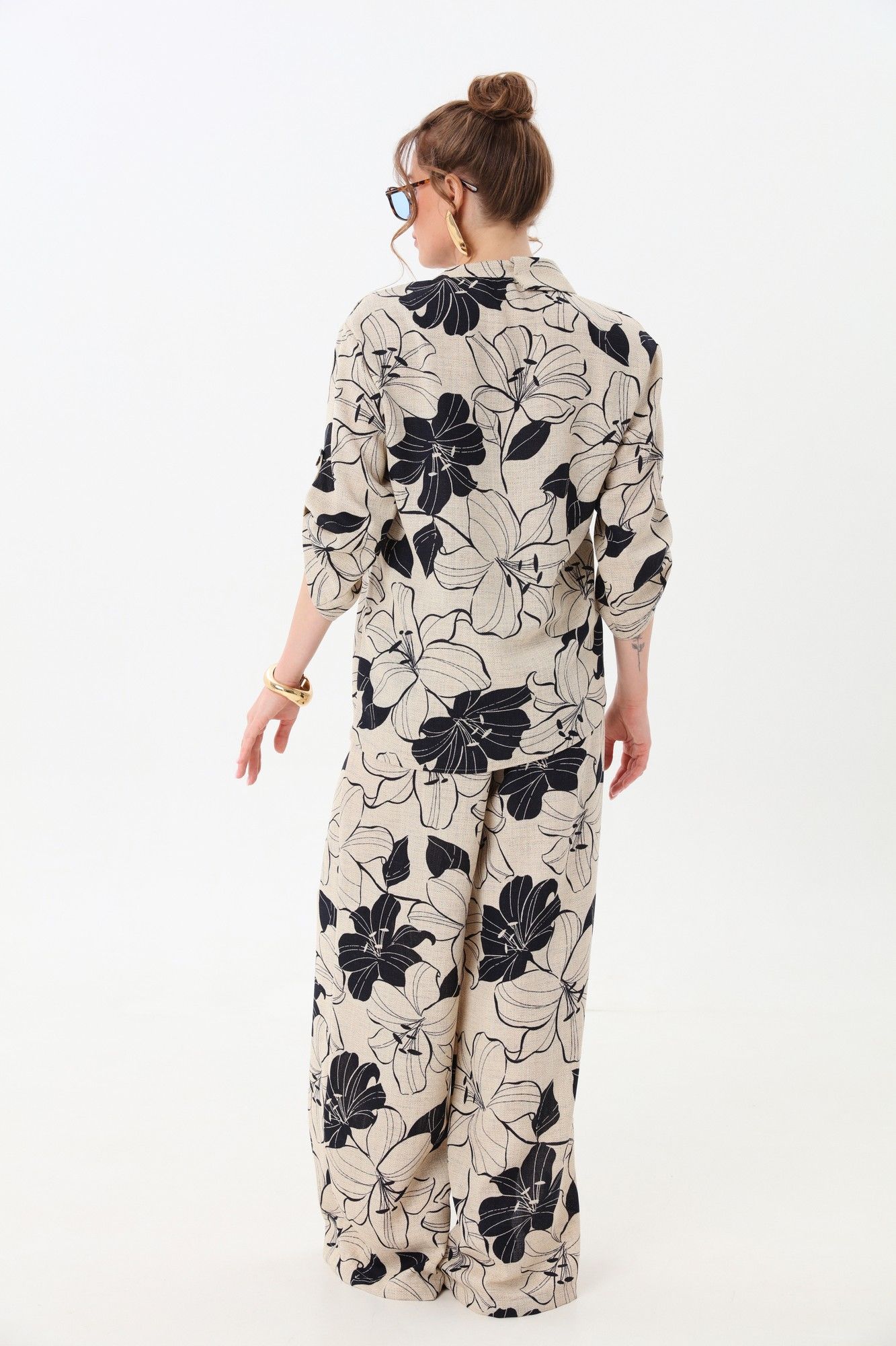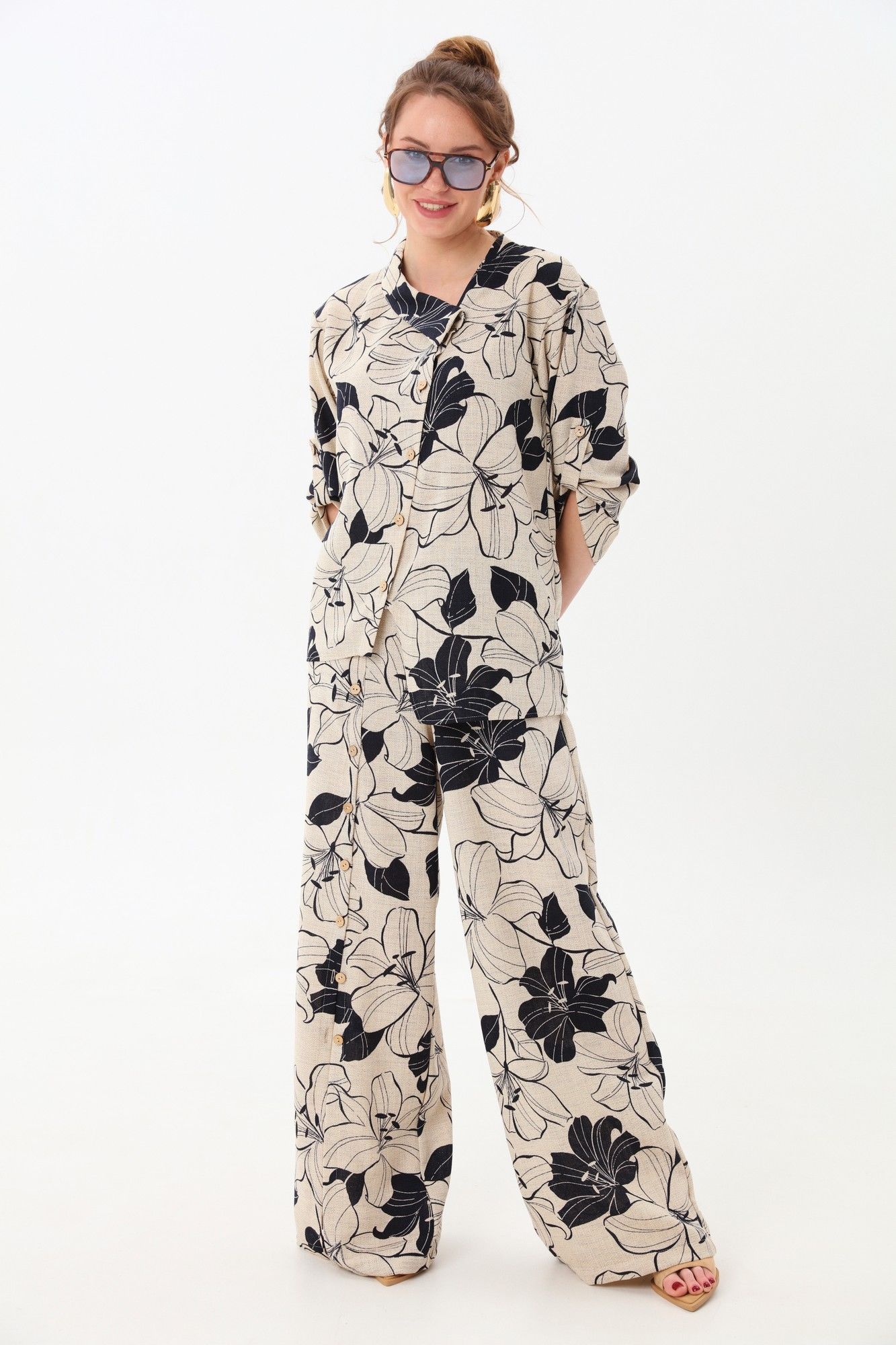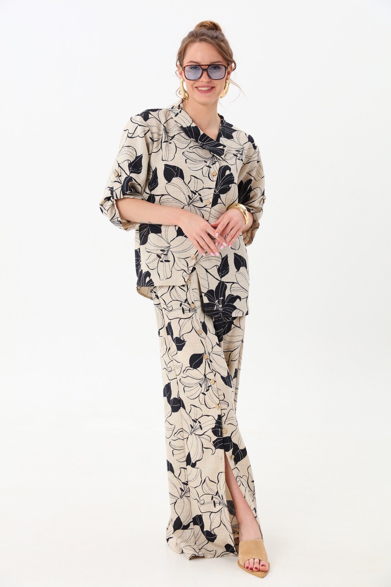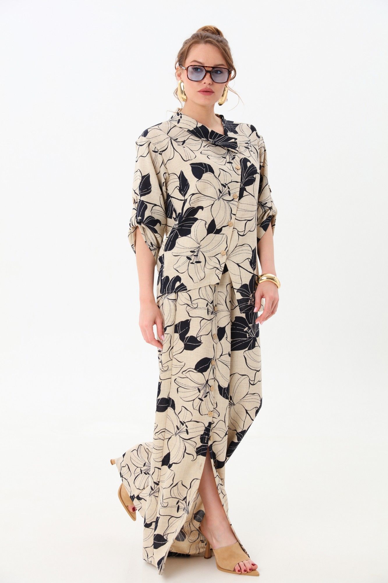 Костюм двухпредметный: состоит из жакета и брюк. Жакет рубашечного типа прямого силуэта с асимметричным низом. Рукав втачной со спущенной линией плеча, фиксируется на пату. Застежка центральная на петли и пуговицы, смещённая по косой. Воротник отложной на стойке до половины спинки. Брюки свободного кроя, верхний срез представлен широкой резинкой, с карманами. По центру правой брючины расположена планка с функционирующими петлями и пуговицами.