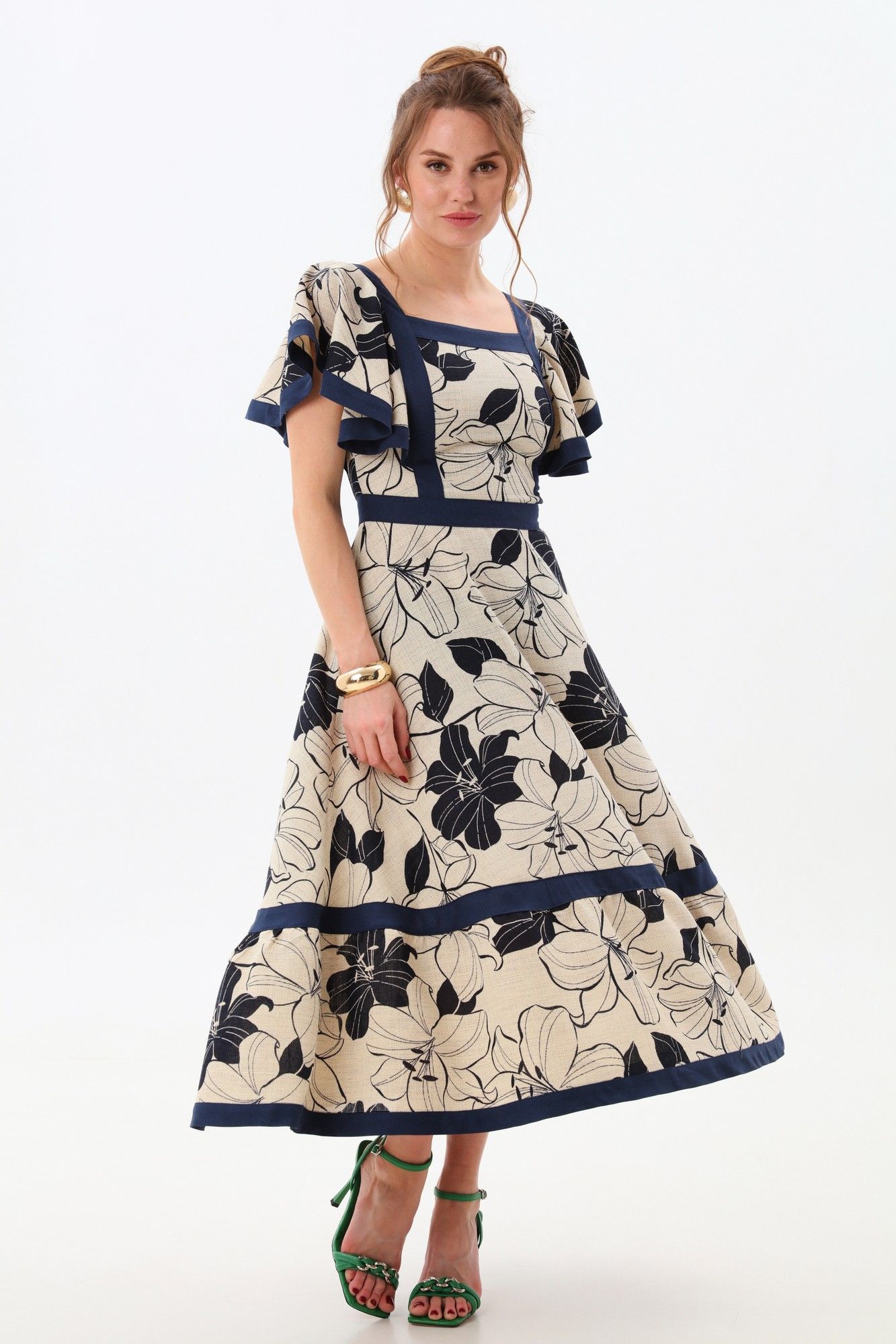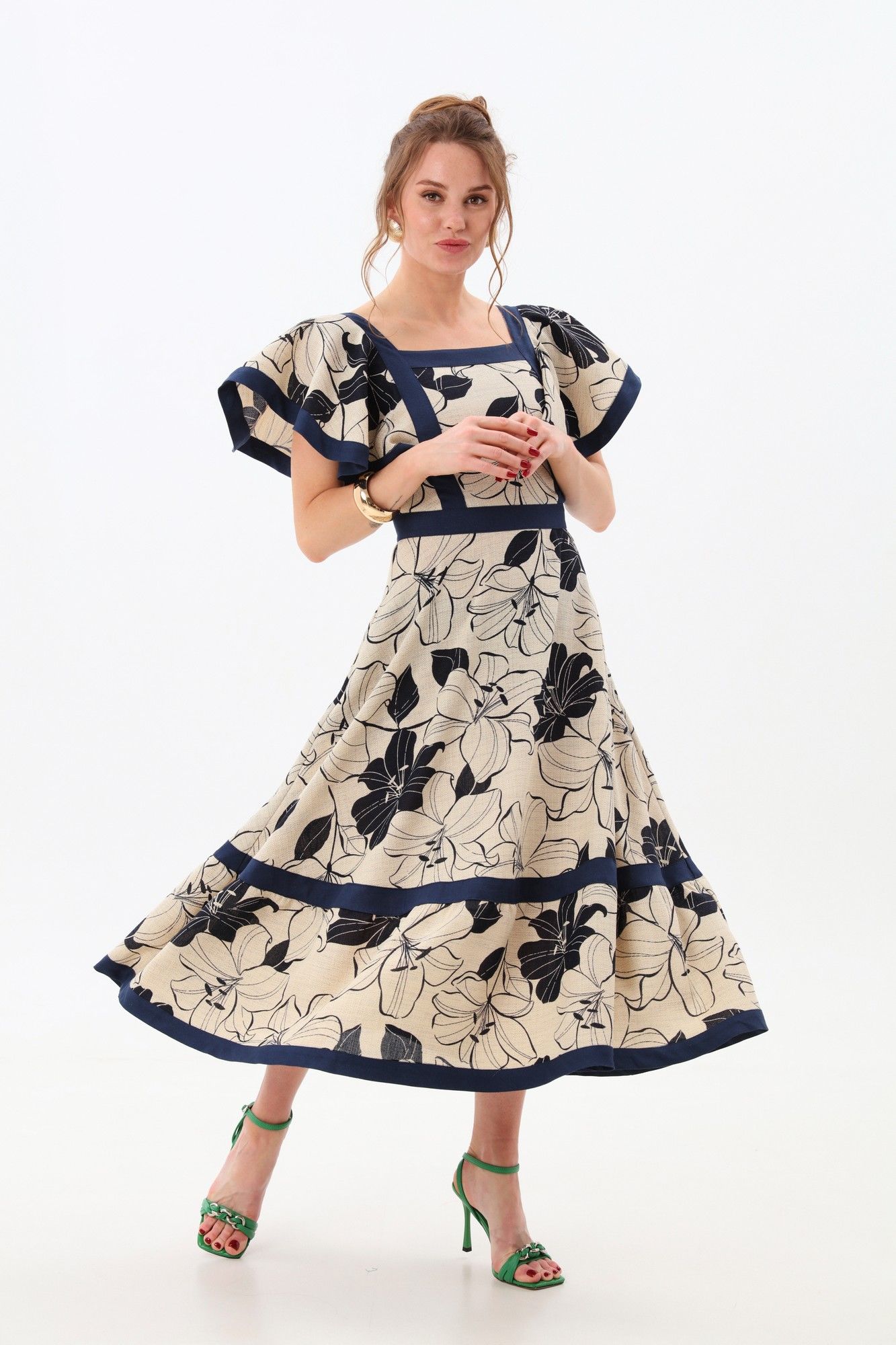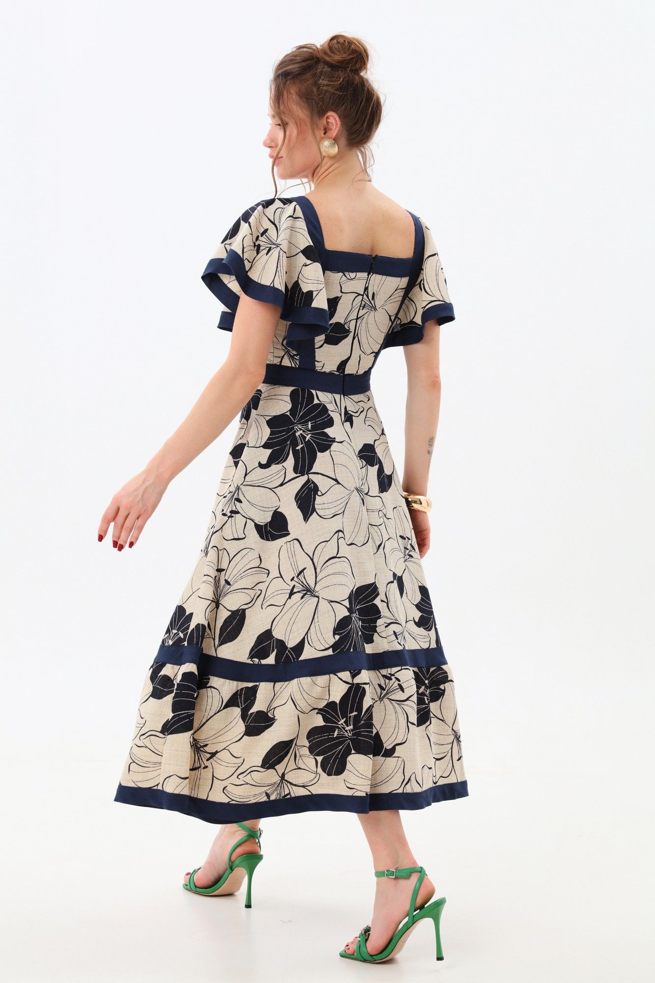 Платье прилегающего силуэта отрезное по линии талии с расклешенной юбкой. Линия горловины фигурная, обработанная широкими вставками из отделочной ткани. По переду и спинке по рельефам вставлены крылышки и настрочены вставки из отделочной ткани. Пояс отрезной из отделочной ткани. Юбка состоит из двух частей. Верхняя и нижняя части юбки скреплены вставкой из отделочной детали. Изделие с потайной застёжкой на молнию по спинке.