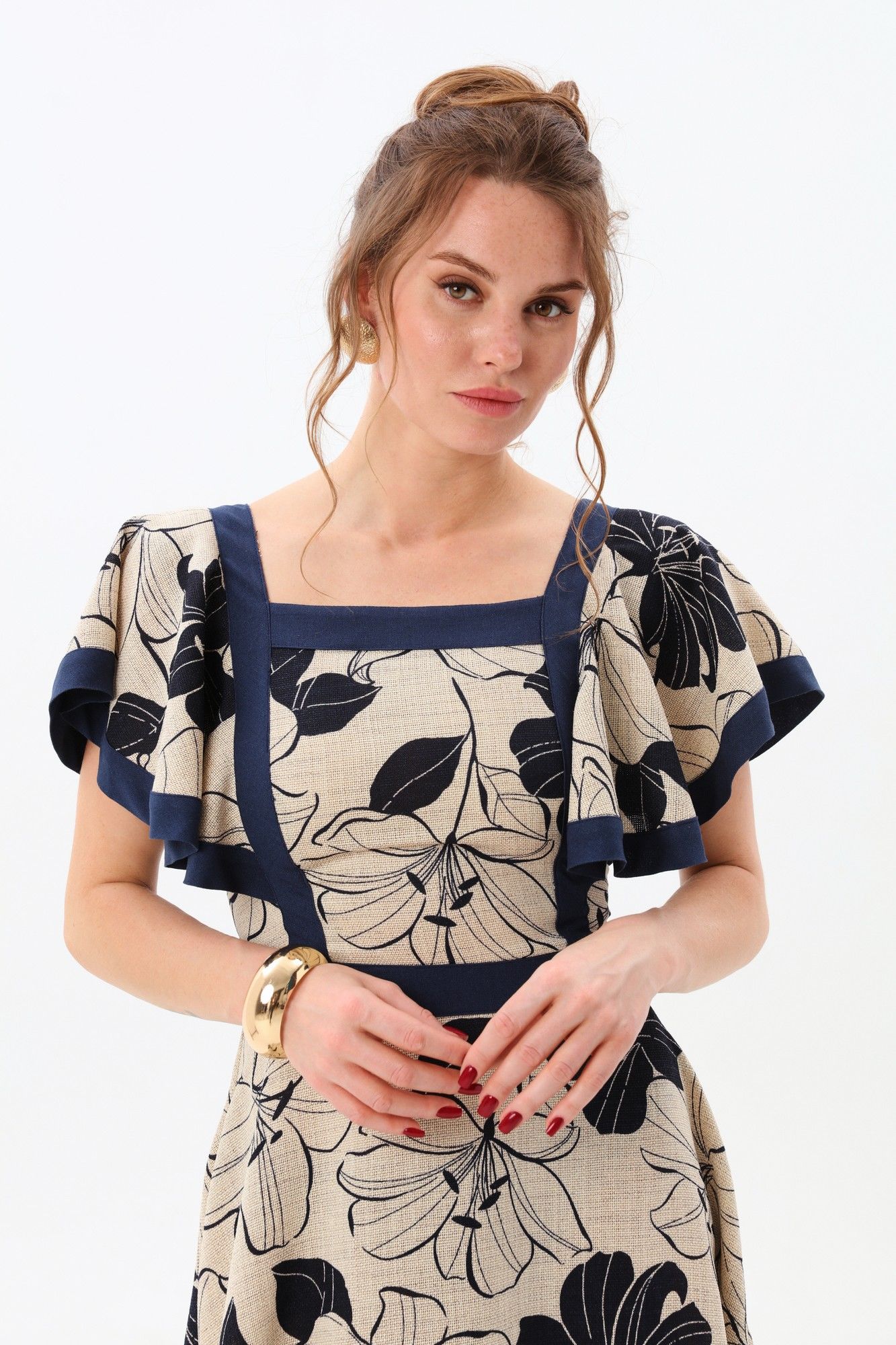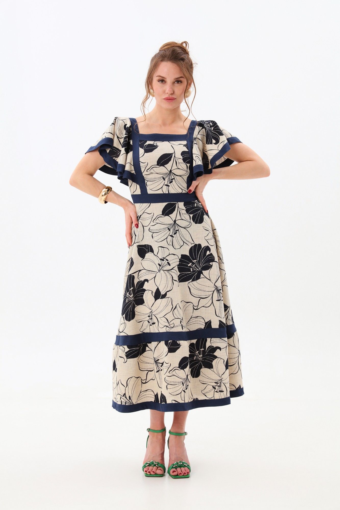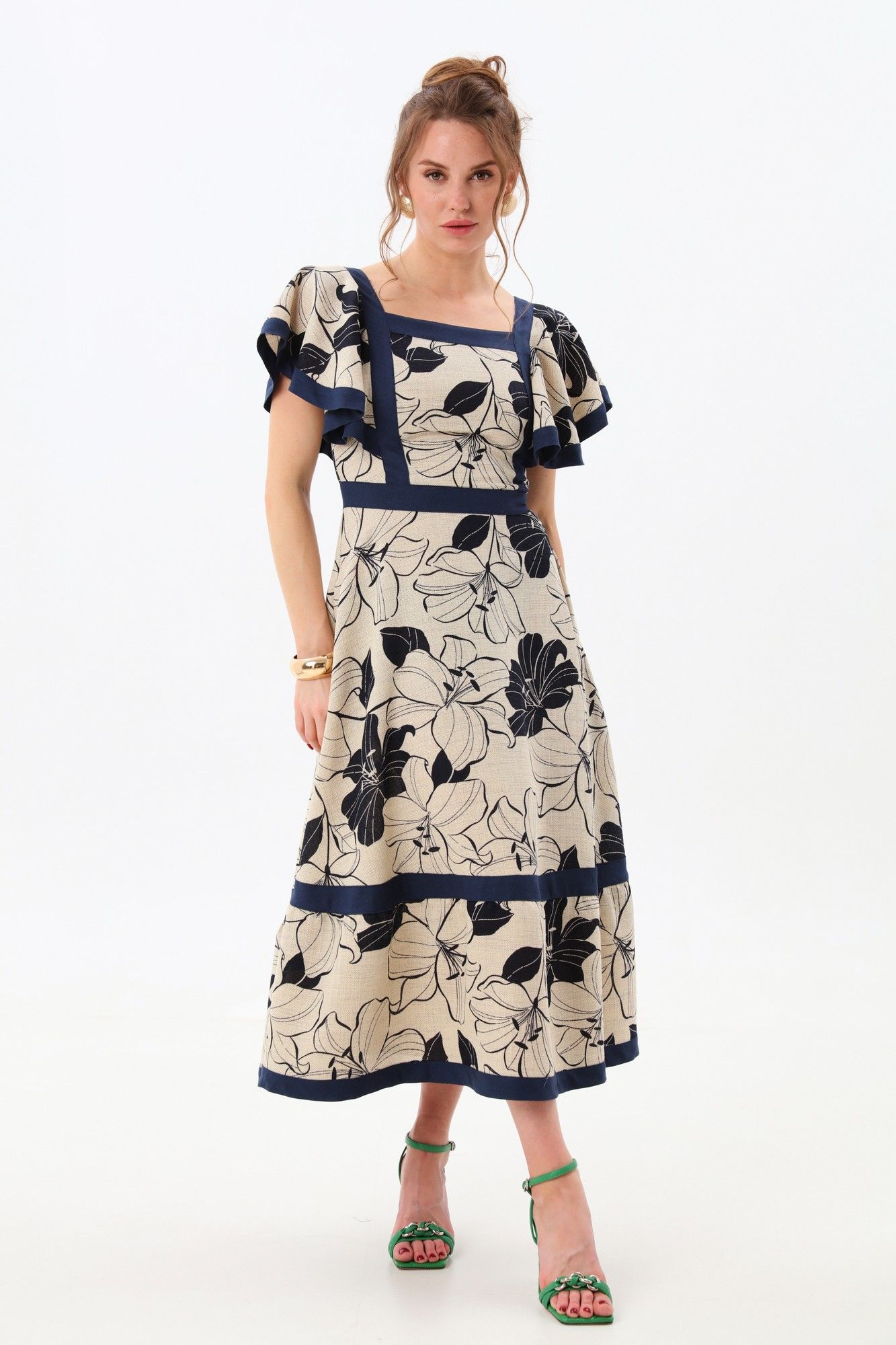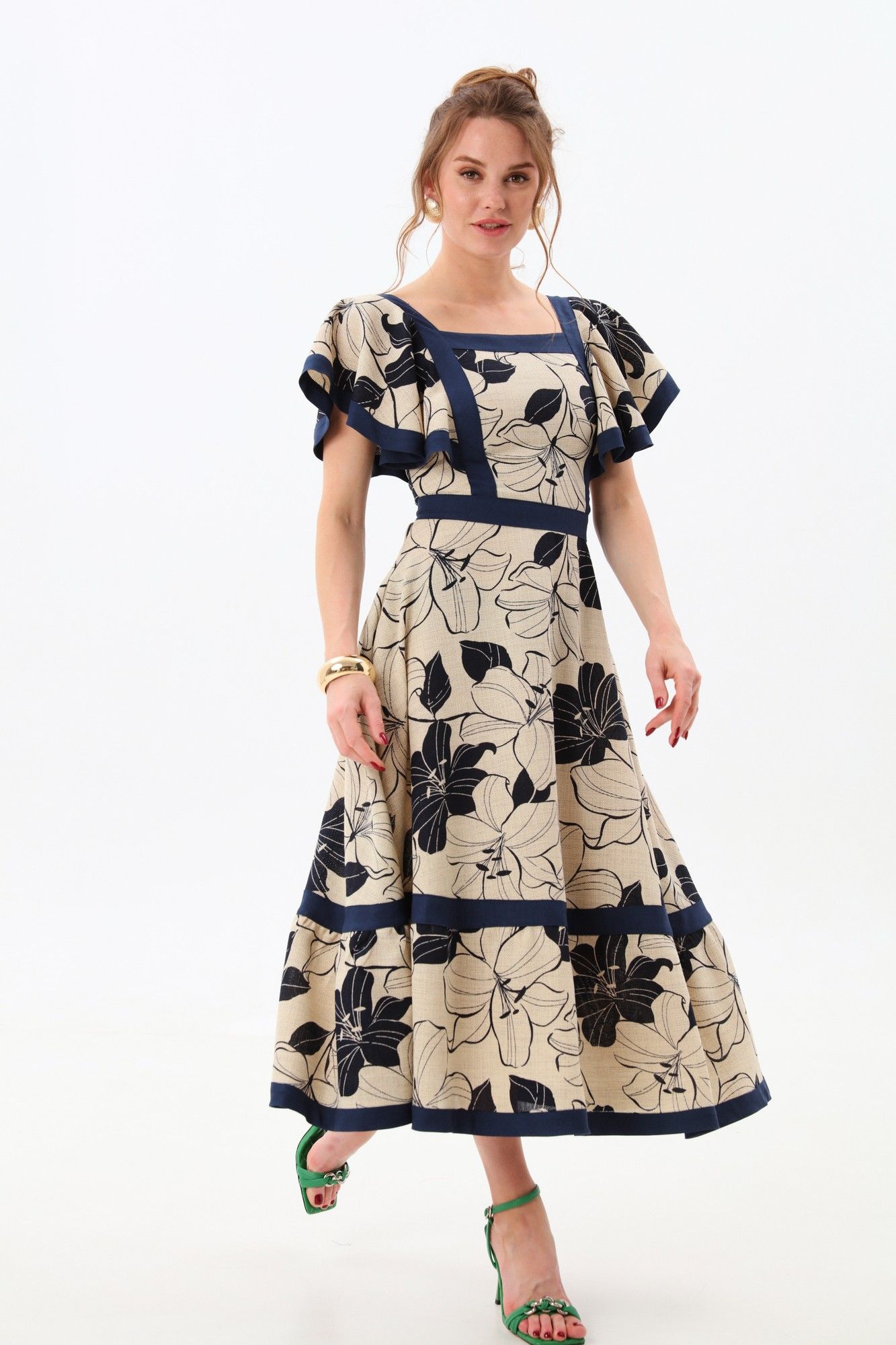 Платье прилегающего силуэта отрезное по линии талии с расклешенной юбкой. Линия горловины фигурная, обработанная широкими вставками из отделочной ткани. По переду и спинке по рельефам вставлены крылышки и настрочены вставки из отделочной ткани. Пояс отрезной из отделочной ткани. Юбка состоит из двух частей. Верхняя и нижняя части юбки скреплены вставкой из отделочной детали. Изделие с потайной застёжкой на молнию по спинке.