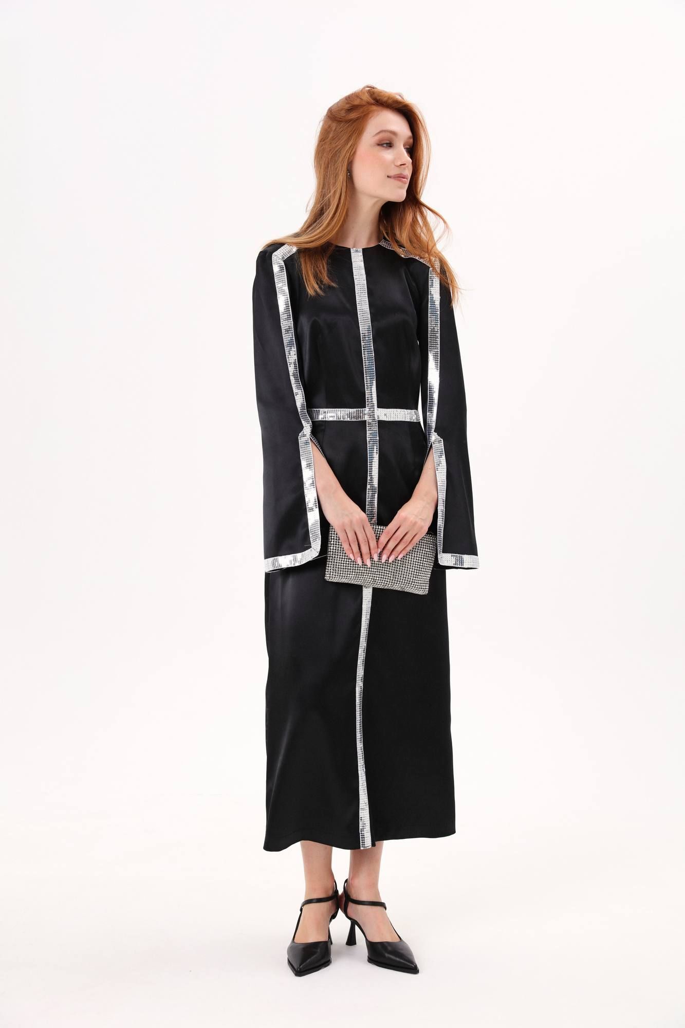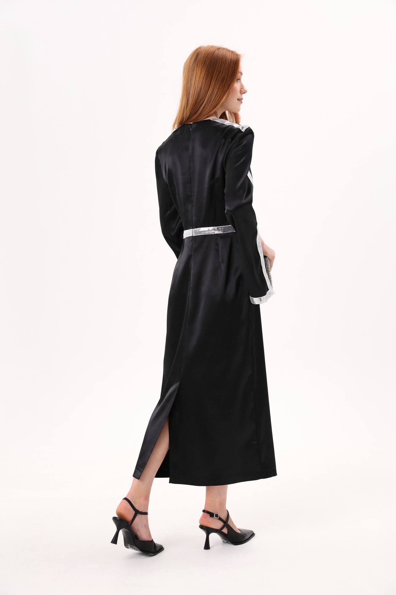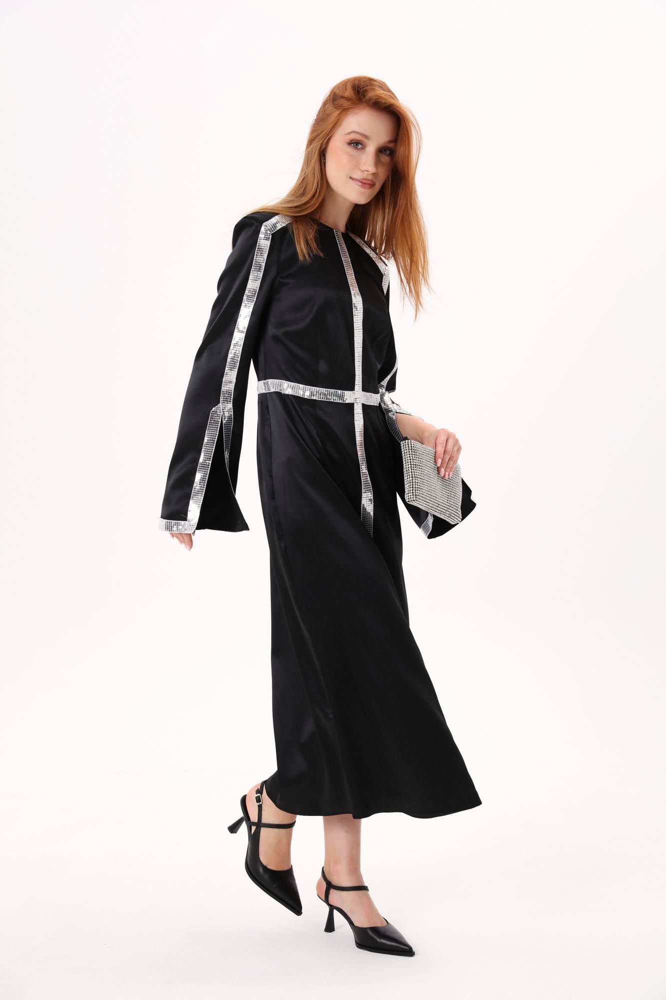 Платье длиной миди полуприлегающего силуэта отрезное по линии талии. Верхняя часть переда со средним швом и вытачкой , нагрудная вытачка объединена с талиевой вытачкой. Нижняя часть переда со средним швом и талиевыми вытачками. Вытачки верхней и нижней частей переда расположены на одной оси. Верхняя часть спинки со средним швом и талиевой вытачкой. Нижняя часть спинки со средним швом, талиевой вытачкой. Рукав втачной двухшовный. В шве по переднему перекату располагается разрез. Вырез горловины круглой формы, обработан обтачками. Застежка в среднем шве спинки на потайную тесьму-молнию. Платье декорировано тесьмой из пайеток.