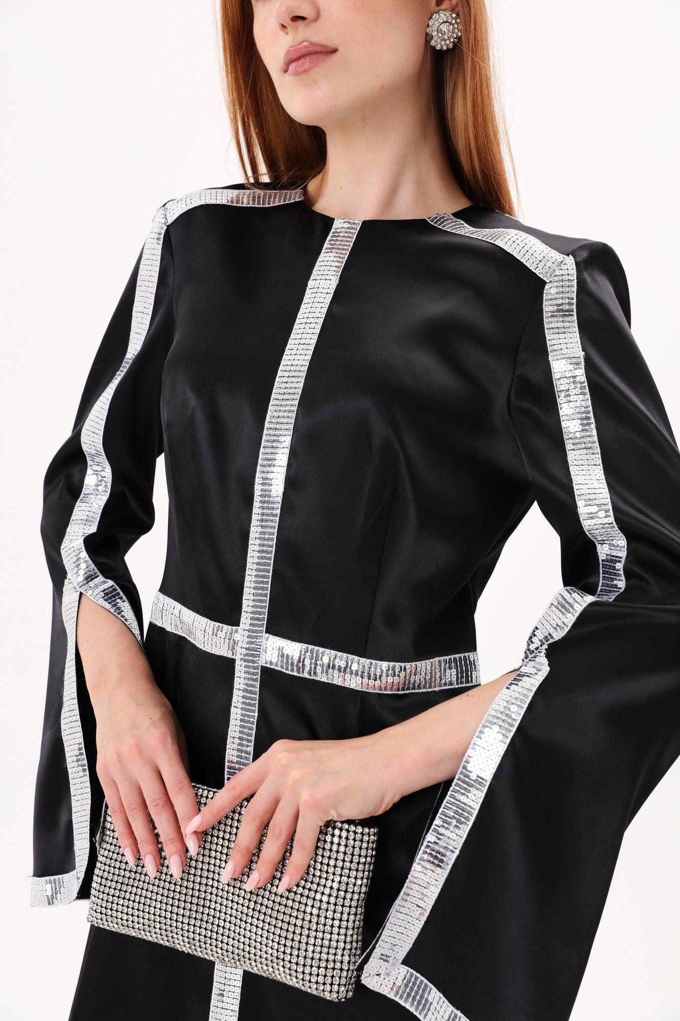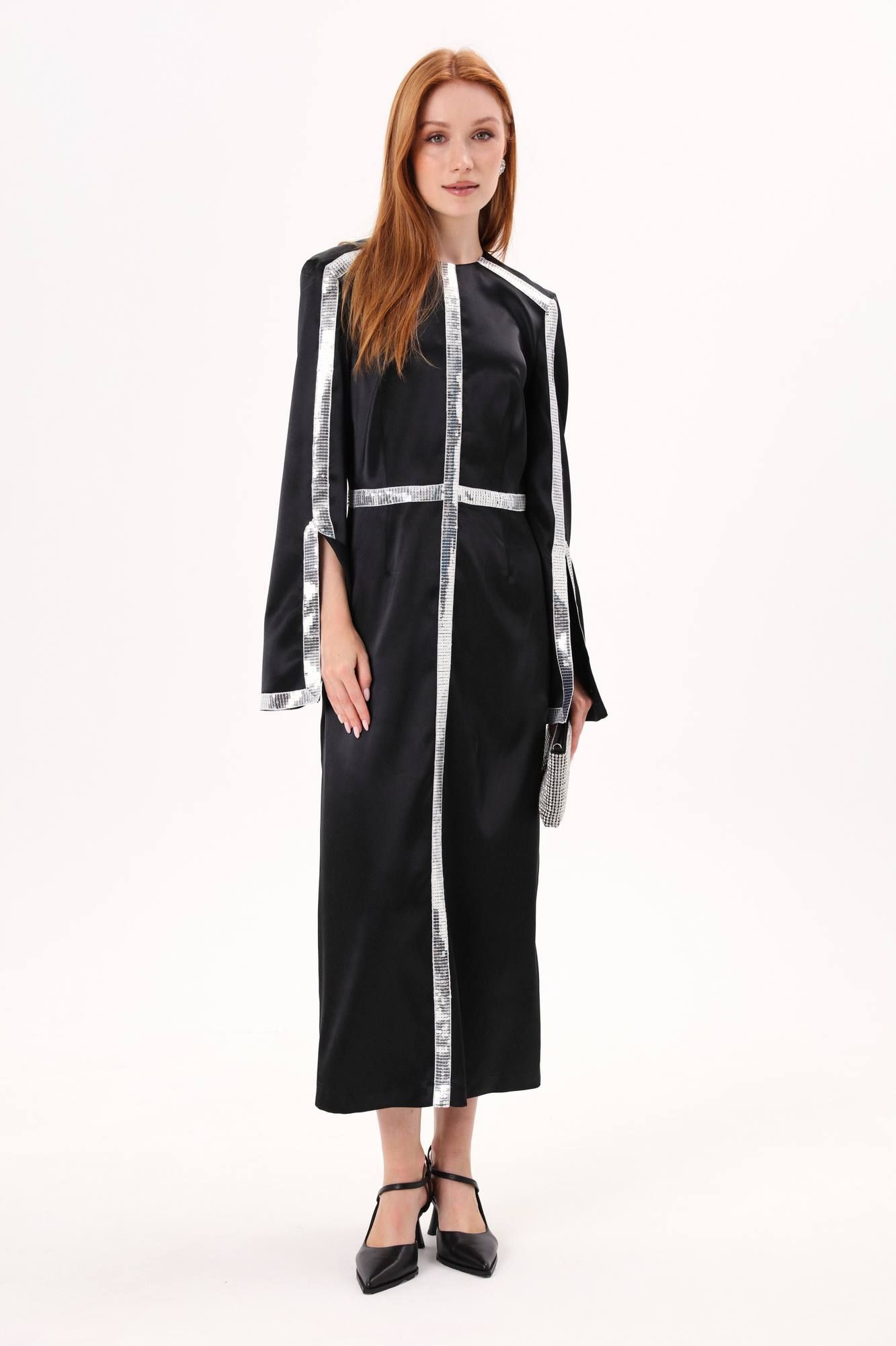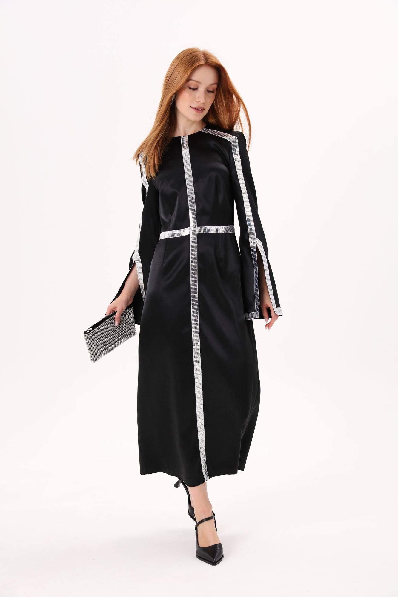 Платье длиной миди полуприлегающего силуэта отрезное по линии талии. Верхняя часть переда со средним швом и вытачкой , нагрудная вытачка объединена с талиевой вытачкой. Нижняя часть переда со средним швом и талиевыми вытачками. Вытачки верхней и нижней частей переда расположены на одной оси. Верхняя часть спинки со средним швом и талиевой вытачкой. Нижняя часть спинки со средним швом, талиевой вытачкой. Рукав втачной двухшовный. В шве по переднему перекату располагается разрез. Вырез горловины круглой формы, обработан обтачками. Застежка в среднем шве спинки на потайную тесьму-молнию. Платье декорировано тесьмой из пайеток.