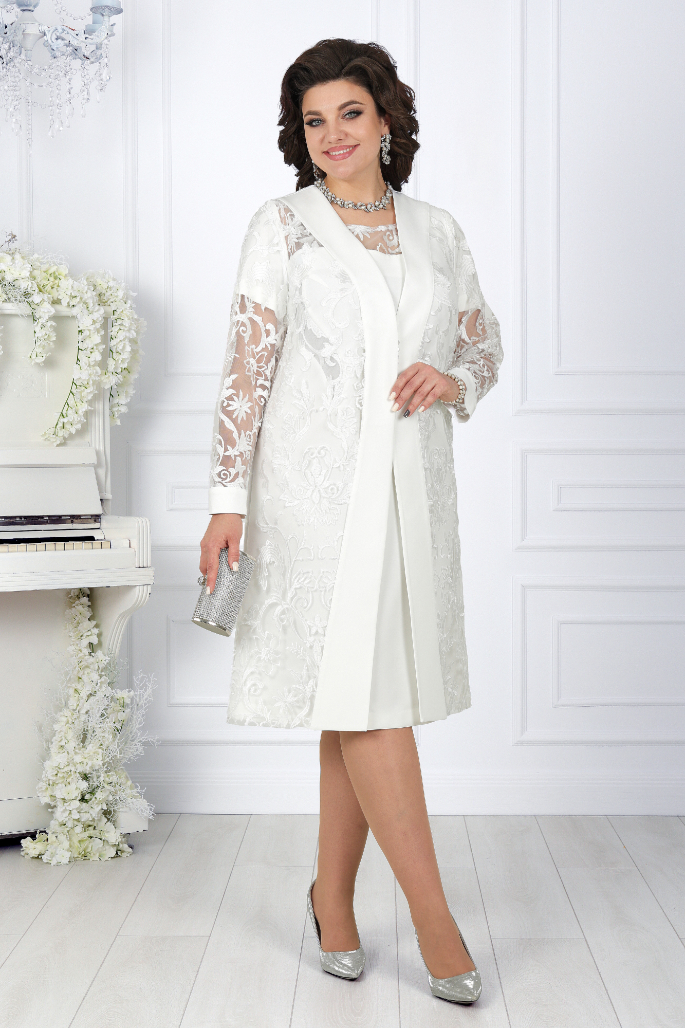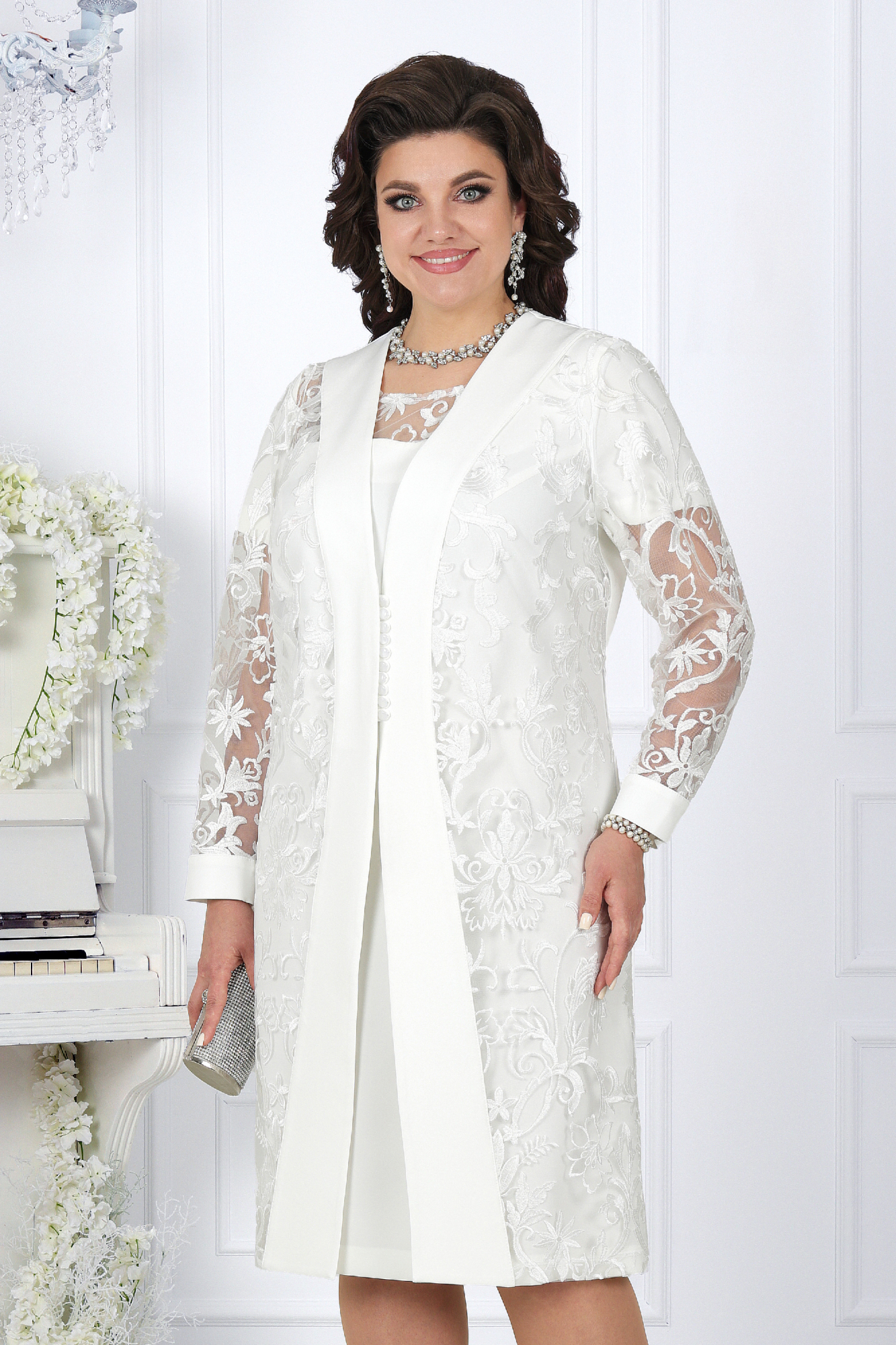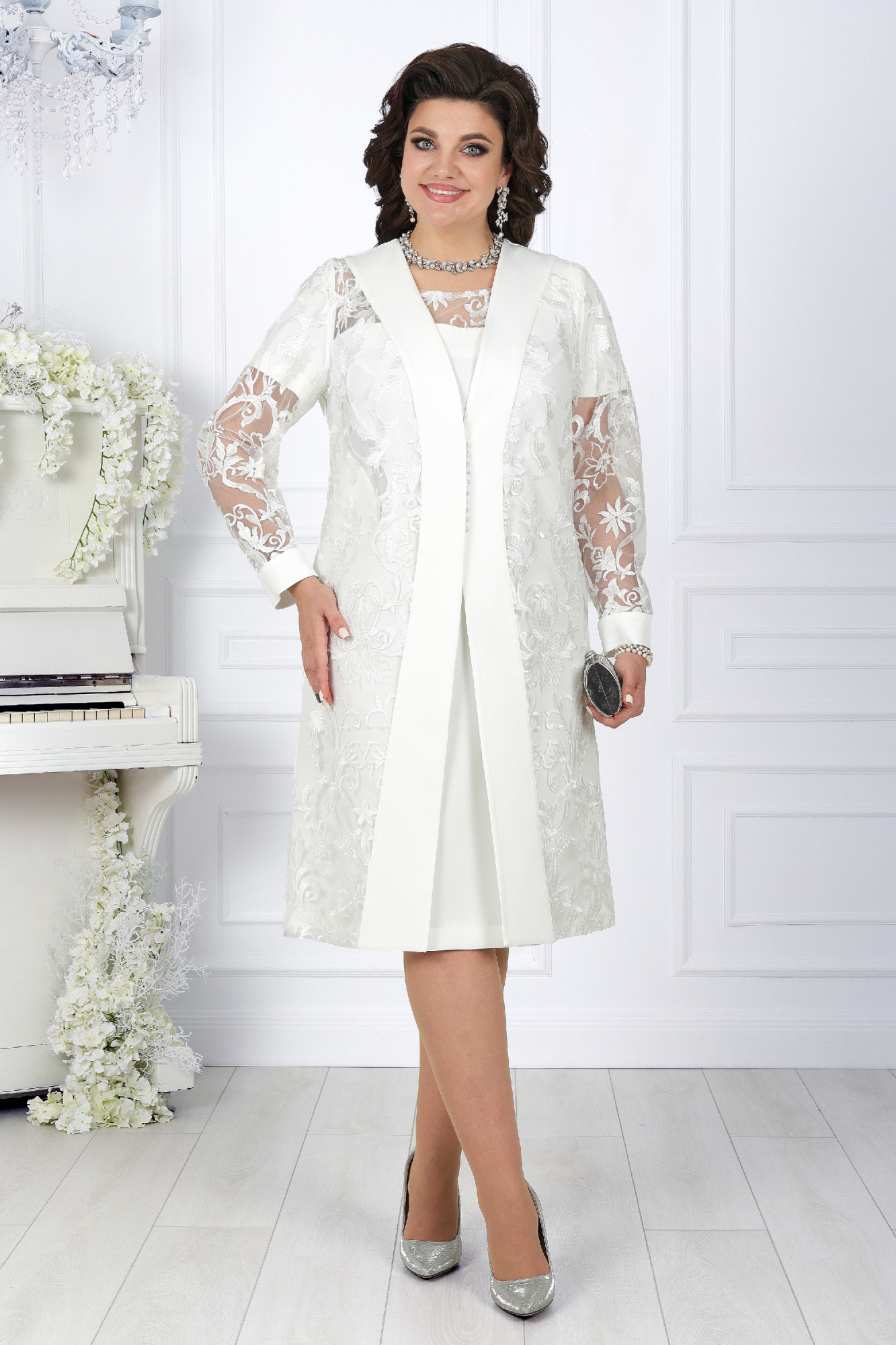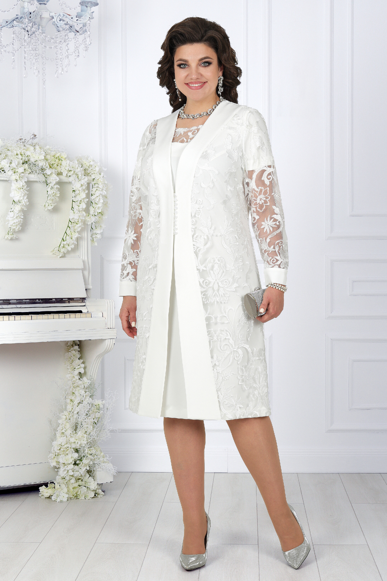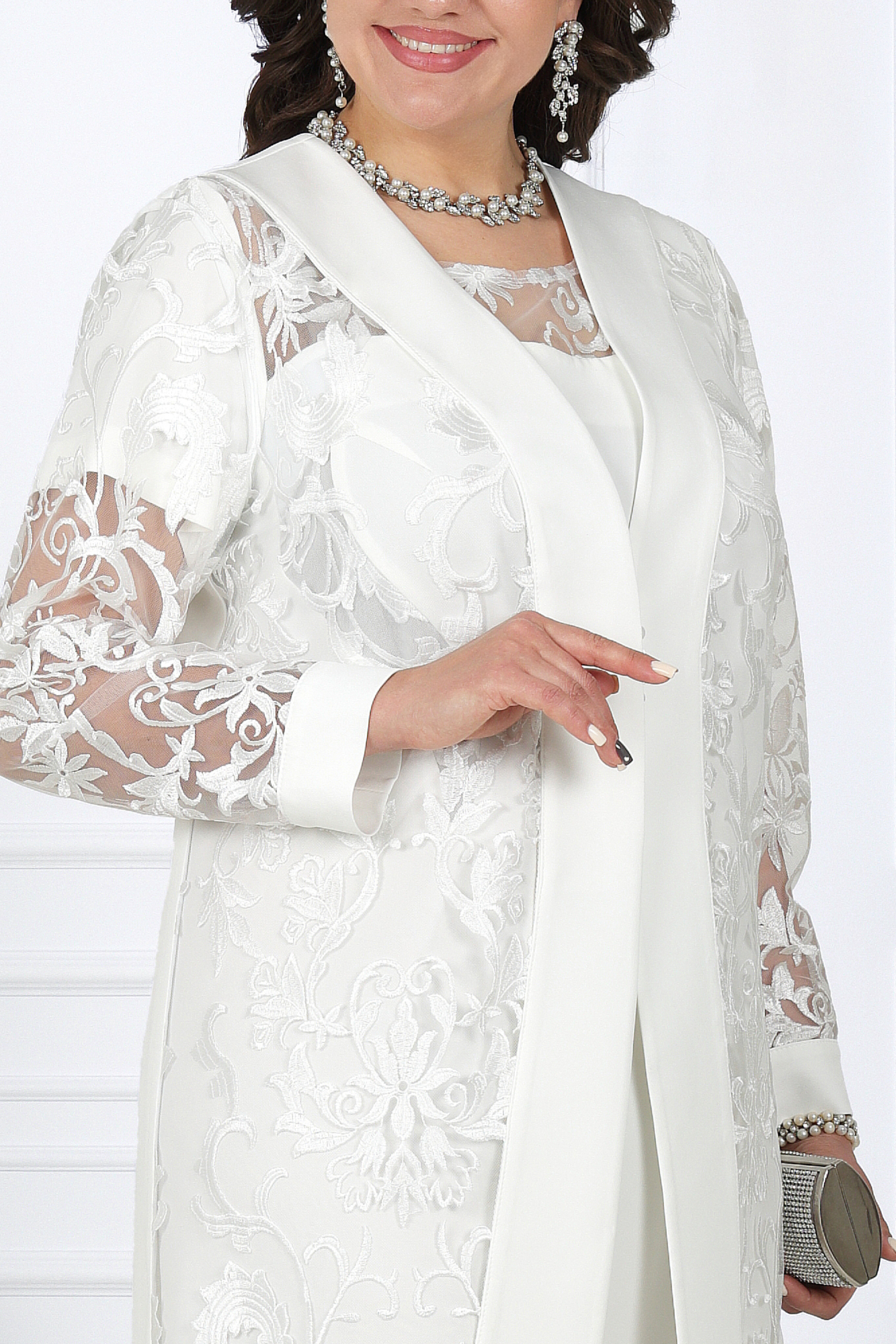 5988 Комплект женский Представляем вашему вниманию вечерний женский костюм от NINELE - истинное воплощение изящества. Этот наряд собрал в себе лучшие модные свадебные тенденции: сочетание костюмной ткани с изысканным кружевом придает образу особую изысканность и стиль. Костюм идеально подойдет для свадебного торжества, вечернего мероприятия или другого особого случая, где вы захотите выглядеть неповторимо и элегантно. Особенностью данного костюма является кружевной кардиган, выполненный из кружева и основной ткани. Такой дизайн элегантно формирует правильный силуэт фигуры, подчеркивая ее достоинства. Комплект женский, 2-х предметный, состоящий из платья и кардигана, выполненных из костюмно-плательной ткани в сочетании с гипюром. Платье женское полуприлегающего силуэта, расширенное к низу, длиной по среднему шву спинки 103 см. Перед с фигурной кокеткой из гипюра, идущей от середины левого плеча и уходящей в правую пройму, с декоративной деталью по правой стороне, идущей от кокетки вниз до линии талии. Длина платья - 103 см. (48-52 р-р.), 104,5 см (54-60 р-р.).Декоративная деталь 2-х слойная: верхний слой из гипюра, нижний из трикотажной подкладки. Перед с нагрудными вытачками, идущими: левая- из проймы, правая от декоративной детали. Спинка с талиевыми вытачками, со средним швом, в верхней части которого обработана застежка на потайную тесьму-«молния». Горловина спинки округлая, обтачная. Горловина переда округлая, углубленная, срез обработан на плоскошовной машине. Рукава втачные, одношовные. Длина рукавов 21 см. Длина кардигана - 105 см. (48-52 р-р.), 106,5 см. (54-60 р-р).