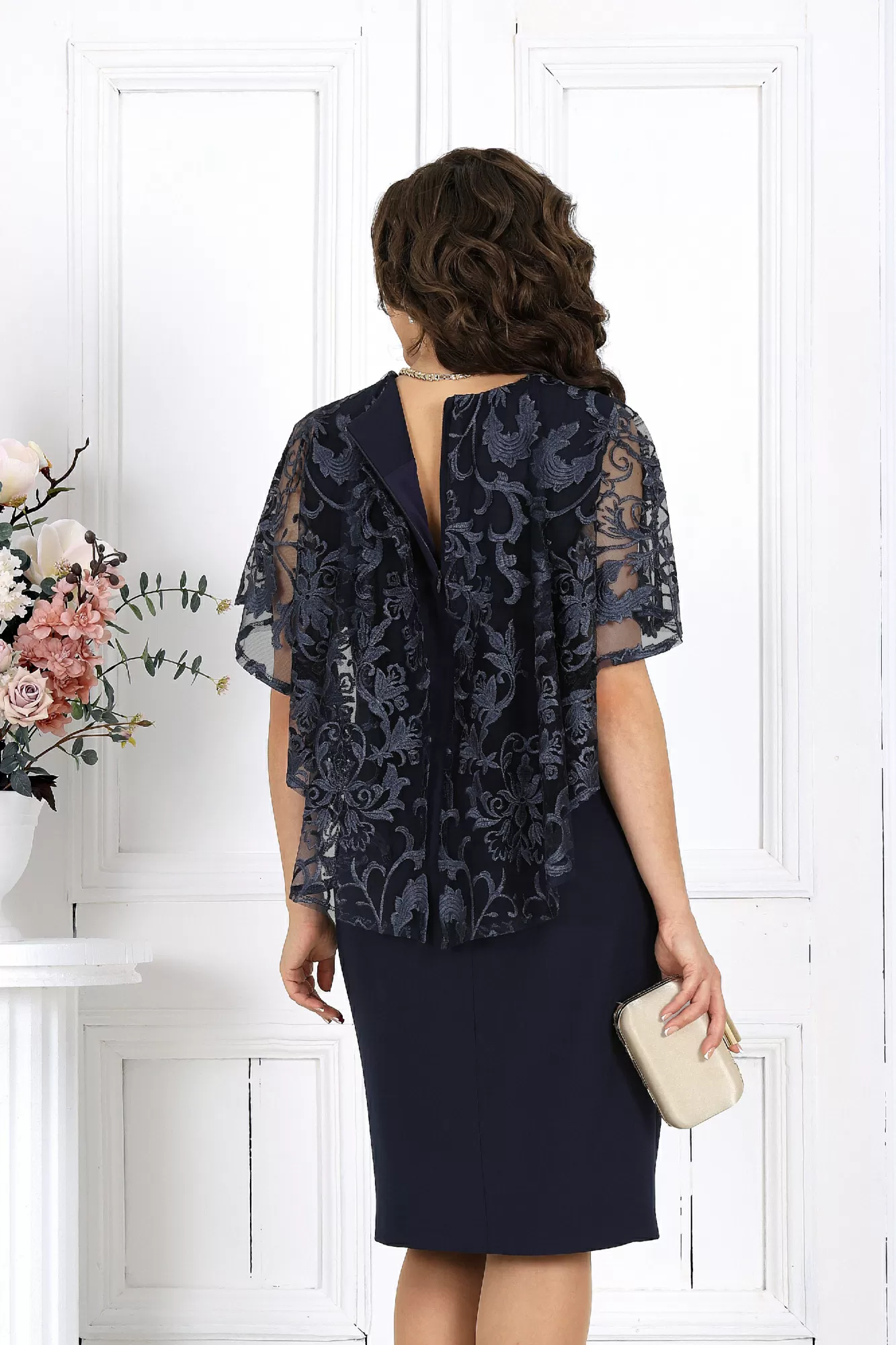 Платье женское, полуприлегающего силуэта, выполнено из костюмно-плательной ткани и гипюра. Модель на трикотажной подкладке, без рукавов и плечевых накладок. Перед отрезной по линии талии; на верхней части обработаны рельефы, направленные от пройм, на нижней – талиевая вытачка и рельефный шов с разрезом внизу. Лиф переда декорирован настрочной аппликацией. Спинка с талиевыми вытачками и средним швом, в верхней части которого обработана застежка на потайную тесьму-«молнию» (50см). Вырез горловины спинки округлый, по переду – углубленный, V-образный. В шов обтачивания горловины входит пелерина из гипюра, разъемная по середине переда и спинки; низ пелерины асимметричный, укороченный спереди. Длина платья – 104 см.