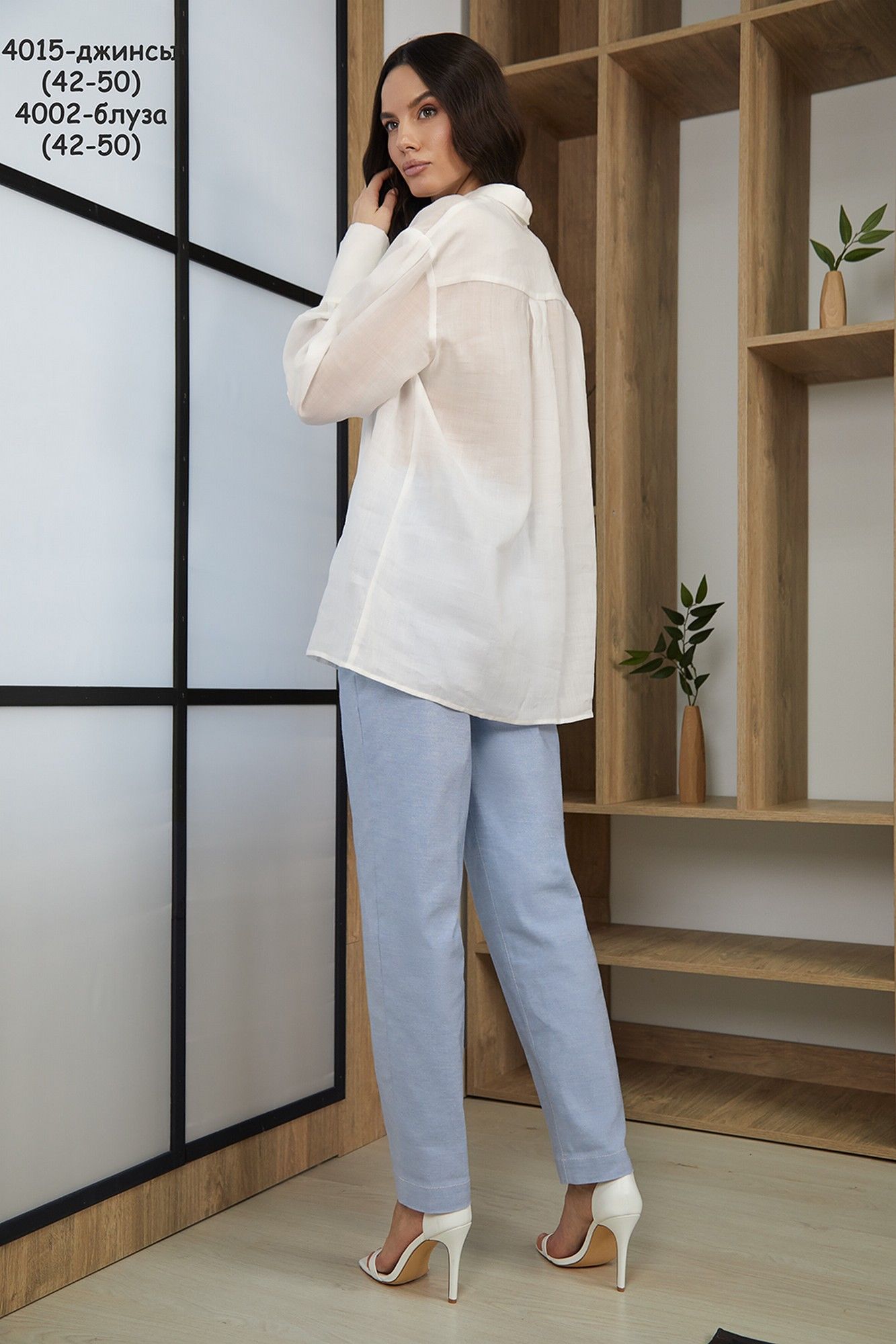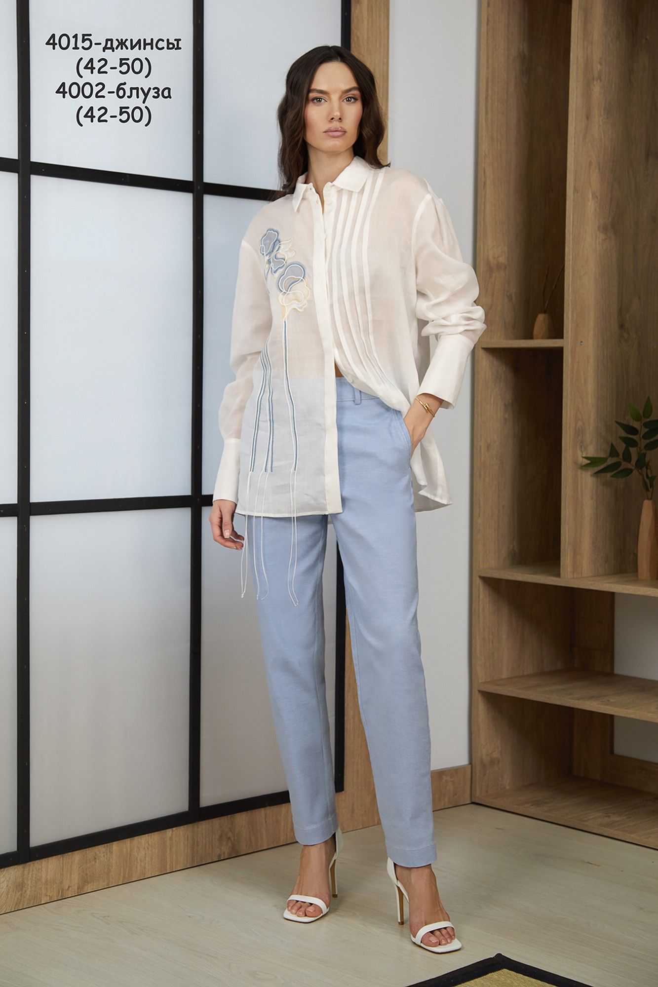 Цвет – “экрю” Легкая стильная блуза эксклюзивного дизайна, прямого силуэта из тонкого льна(рами). Центральная супатная застежка на петли и пуговицы. На левой передней половинке изделия декоративные вертикальные защипы. Спущенная линия плеча, свободный рукав, снизу на притачной широкой манжете. Спинка с отрезной кокеткой и небольшой сборкой. Рубашечный воротник. Дизайнерская вышивка с элементами аппликации по переду изделия.