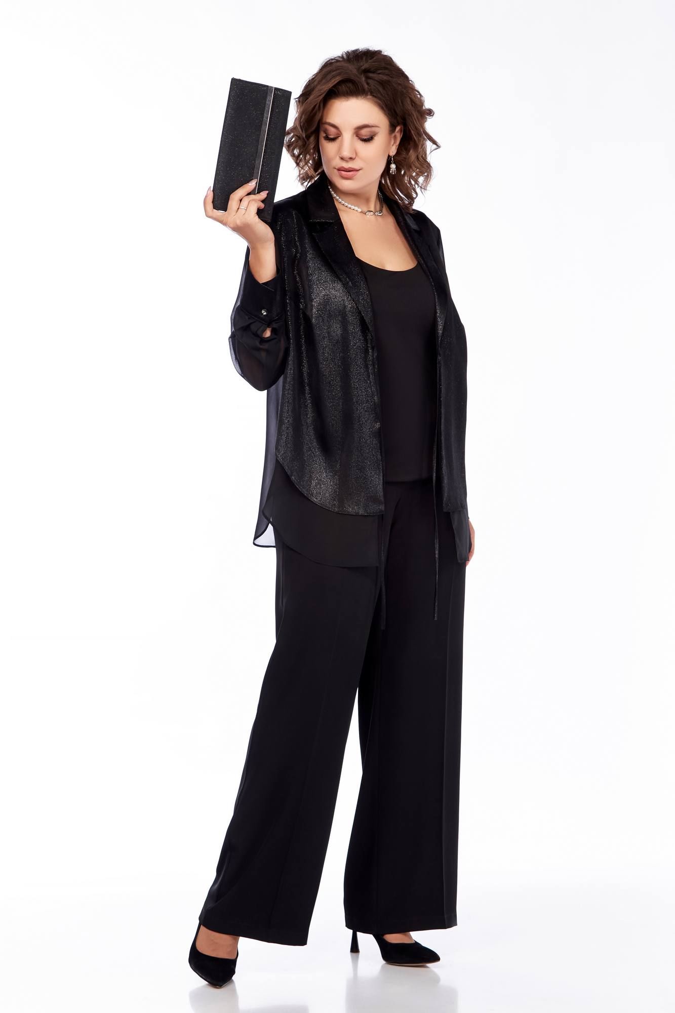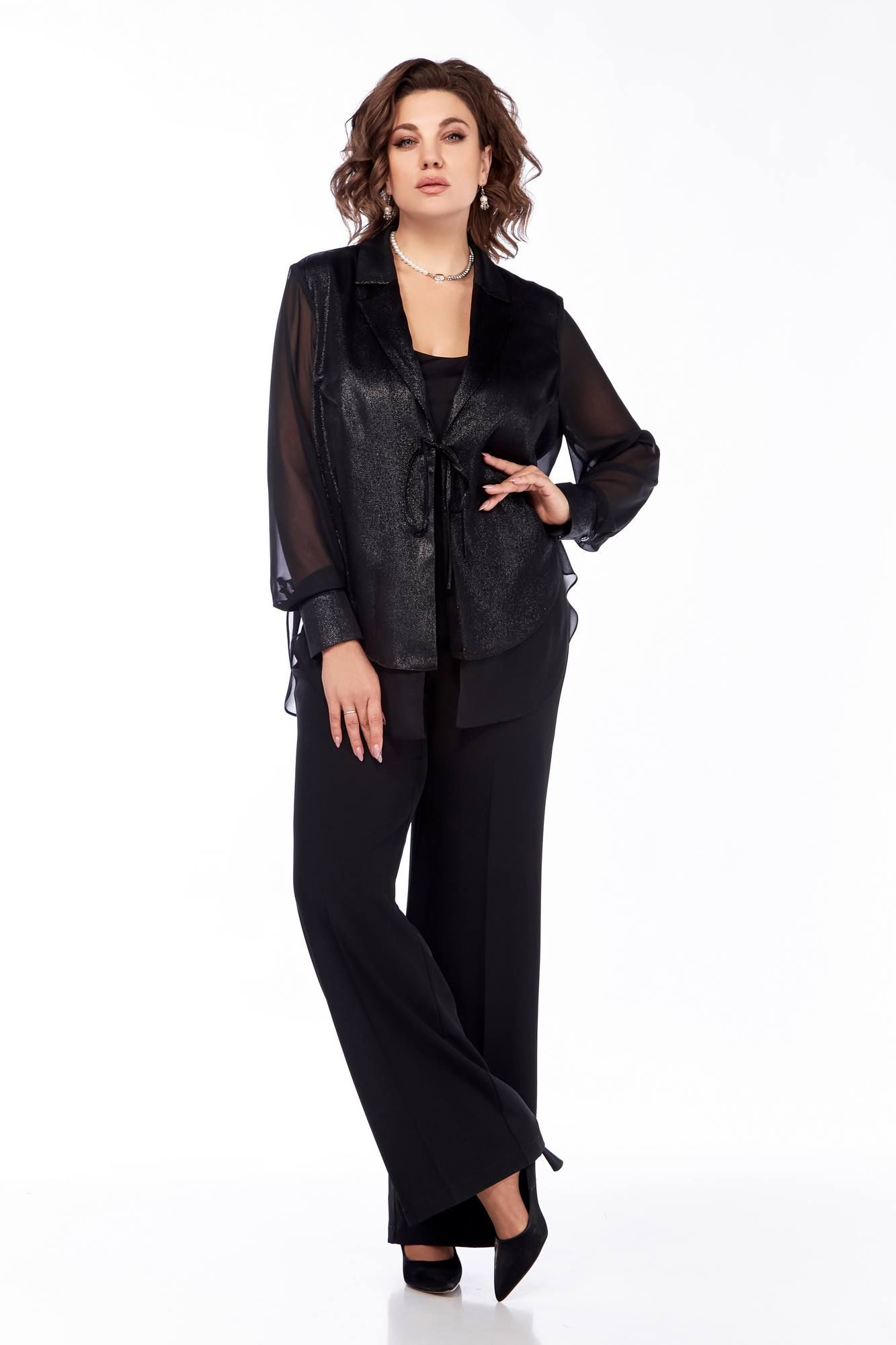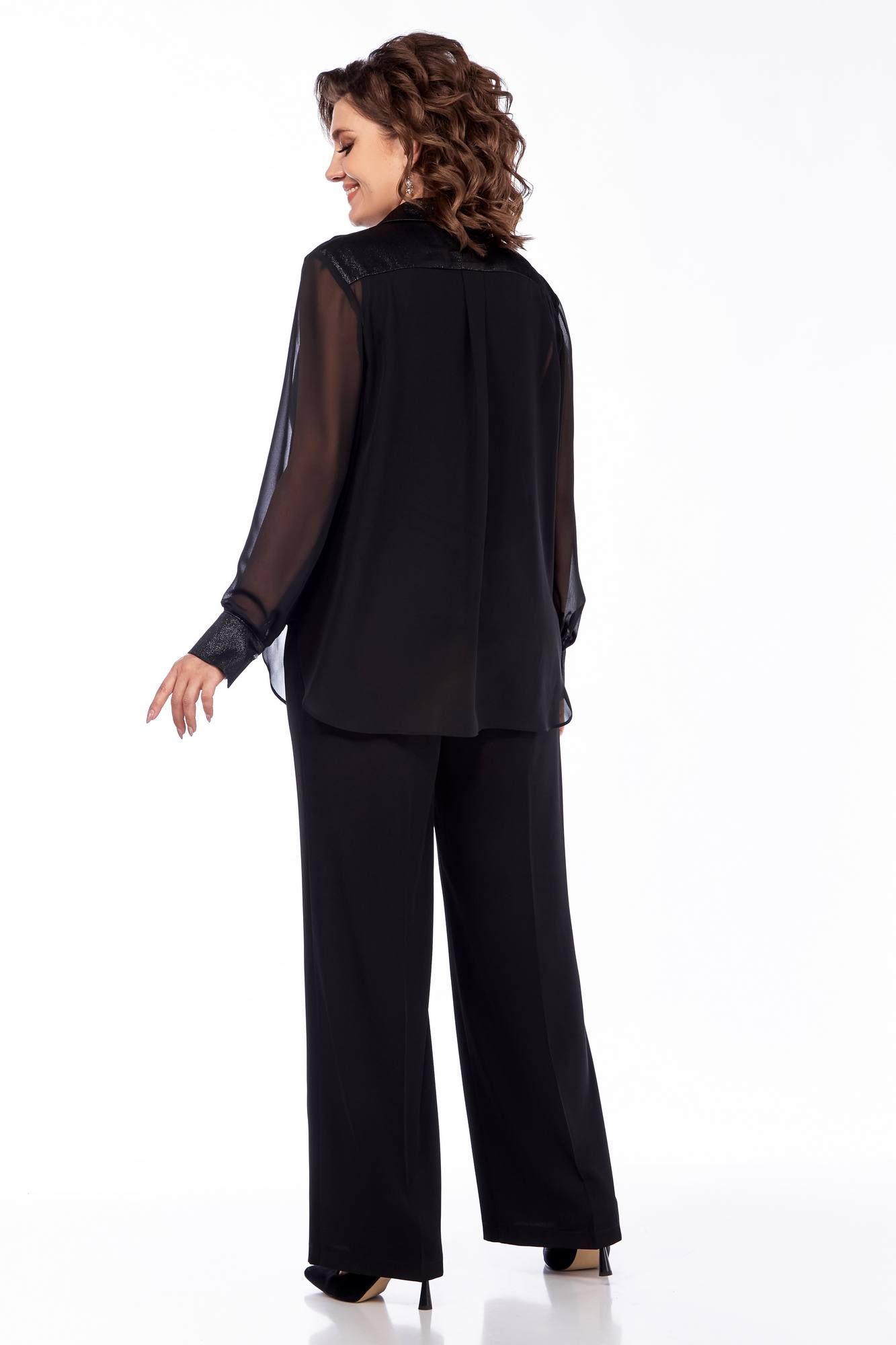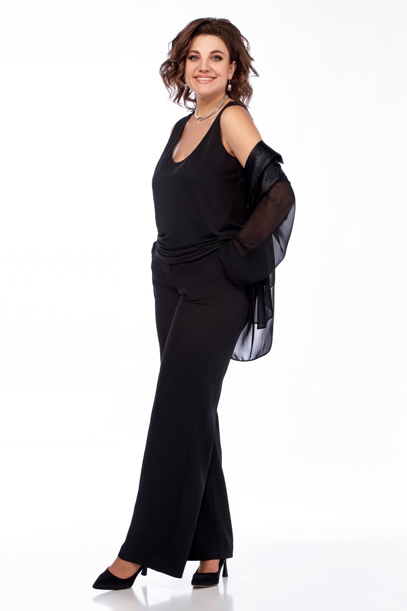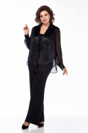 Нарядный трехпредметный комплект. Блузка полуприлегающего силуэта, комбинированная из двух блузочных полупрозрачных тканей, воротник пиджачного типа, застегивается на завязку, низ блузки фигурный. По спинке отрезная кокетка, от которой заложена бантовая складка. Рукав втачной длинный, на манжете с застежкой на петлю и пуговицу. Топ без рукавов с округлым вырезом горловины. Брюки прямого силуэта, пояс на резинке по спинке застежка на молнию, петлю и пуговицу. Карманы от пояса к боковому шву. Длина блузки 75см, длина рукава 64см, длина топа 59см, длина брюк 112см.
