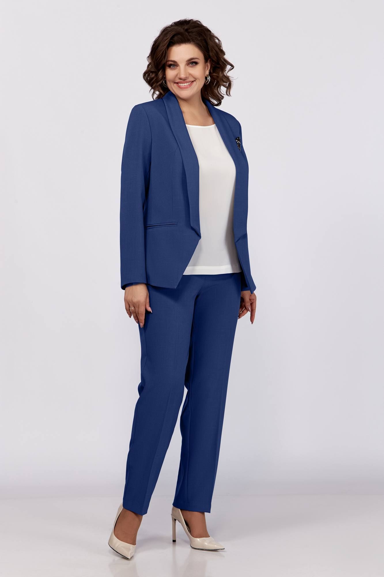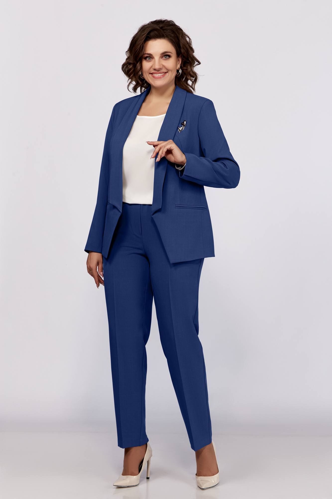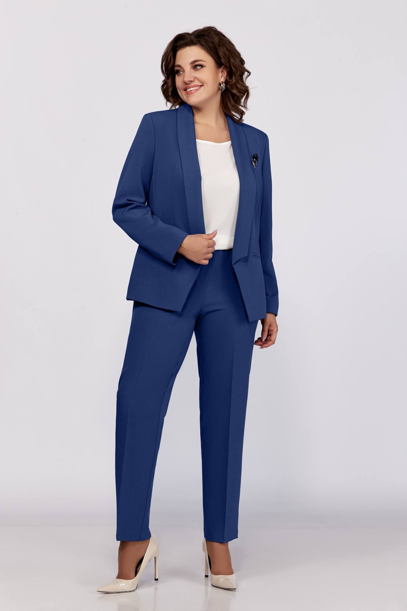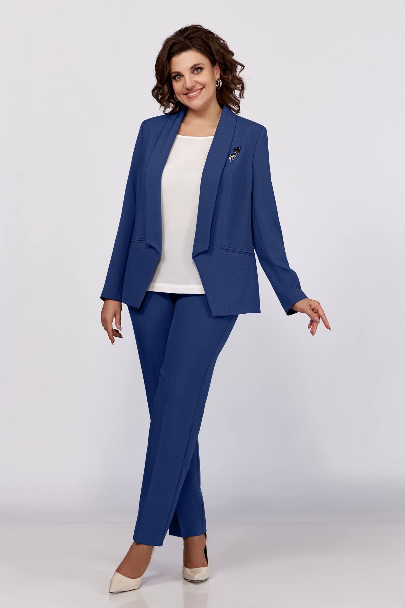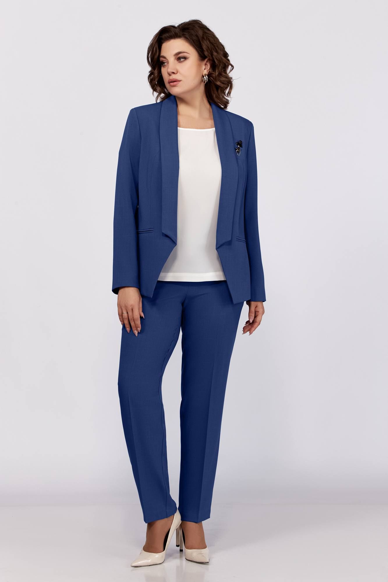Стильный комплект в офис и на праздник, состоит из жакета, блузки и брюк. Жакет полуприлегающего силуэта без застежки. Воротник апаш, карманы в рамку, рельефы. Спинка со средним швом. Рукав длинный, двухшовный с имитацией шлицы. Блузка прямого силуэта, со спущенной линией плеча, тонкими манжетами отвернутыми. Брюки зауженные к низу, без застежки, наоезинке, по переду и спинке заутюжены канты.