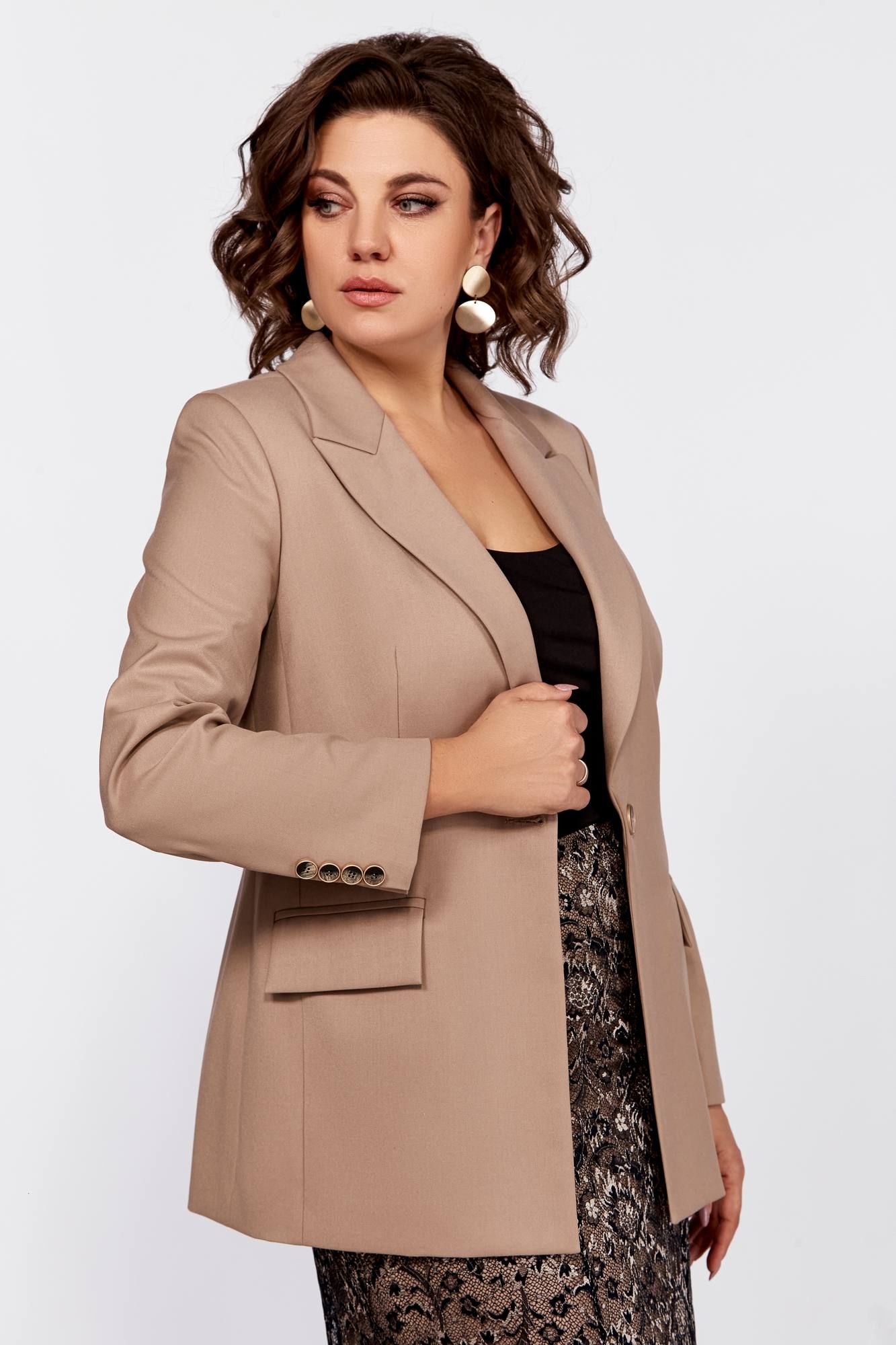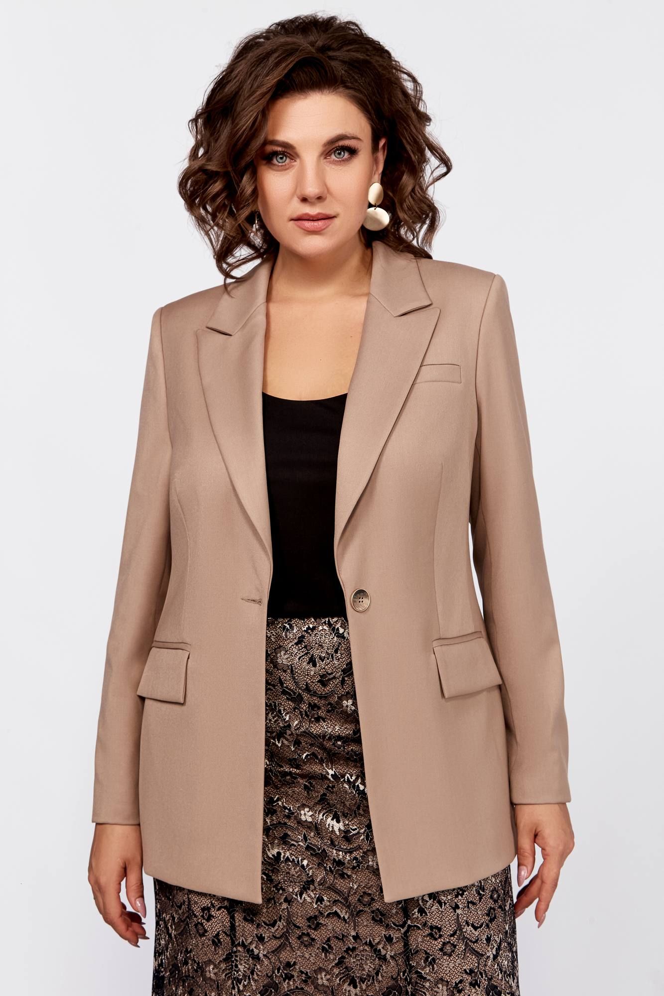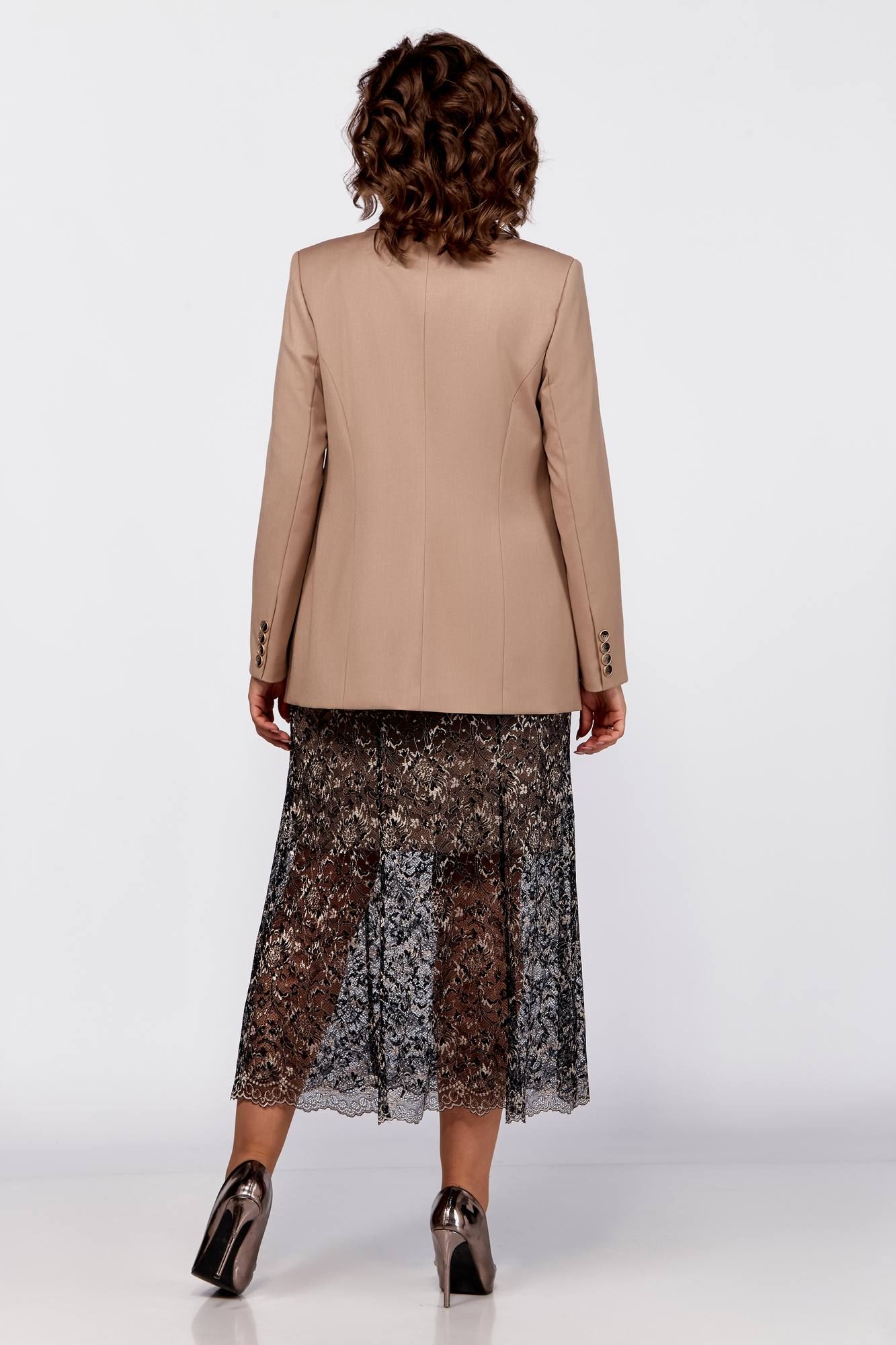 Нарядный комплект- жакет и юбка. Жакет из костюмной ткани премиум-качества, полуприлегающего силуэта, с втачными рукавами и застежкой на петлю и пуговицу. На полочке карманы с клапанами, рельефные швы, спинка со средним швом. Рукава двухшовные, по низу имитация шлиц с пуговицами. Юбка из гипюра полуприлегающего силуэта, расширенная к низу. Нижняя юбка до середины колена. Пояс притачной, застежка в боковом шве молнию и петля с пуговицей. Длина жакета 70см, длина рукава 62см, длина юбки 98см