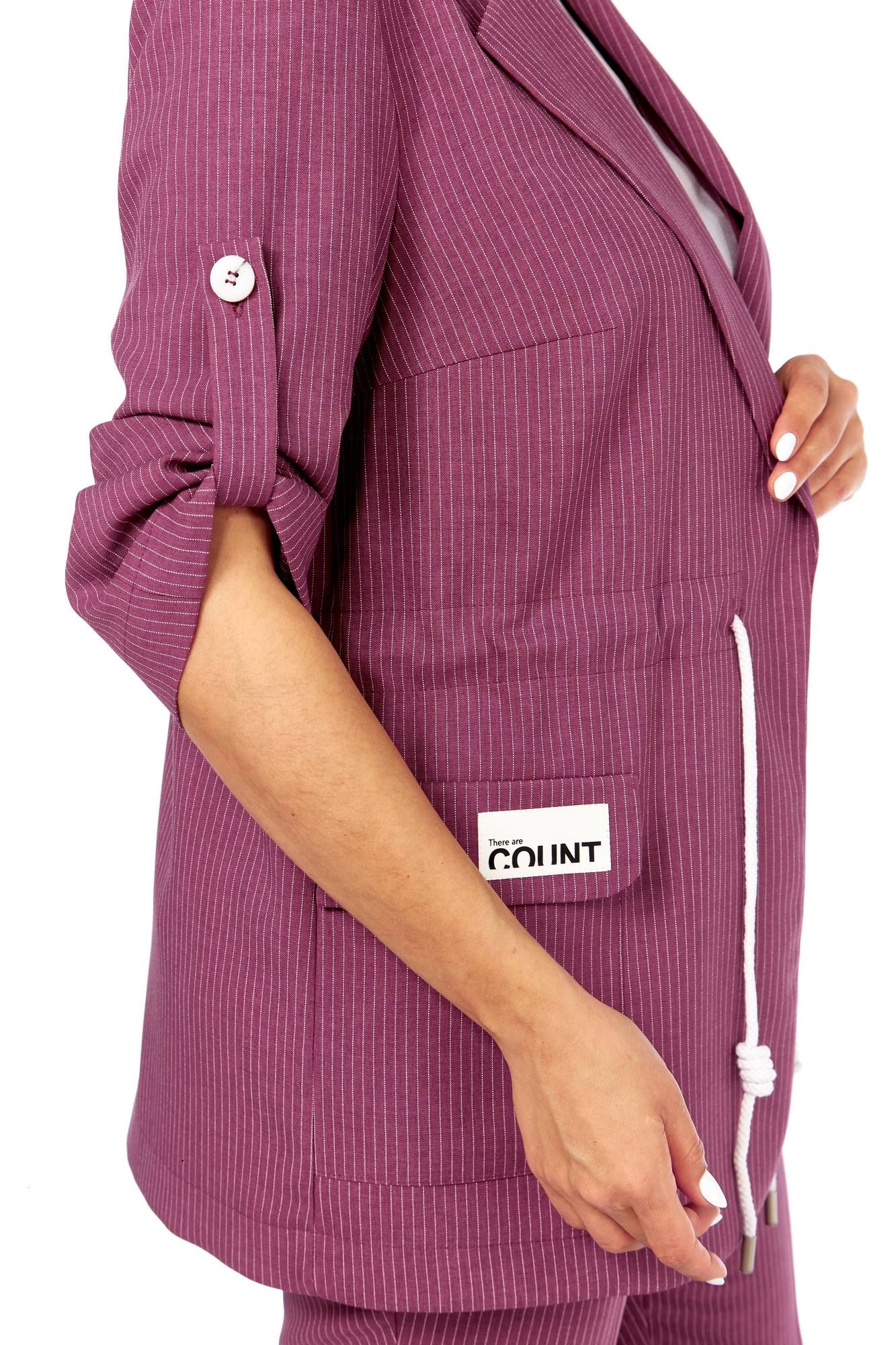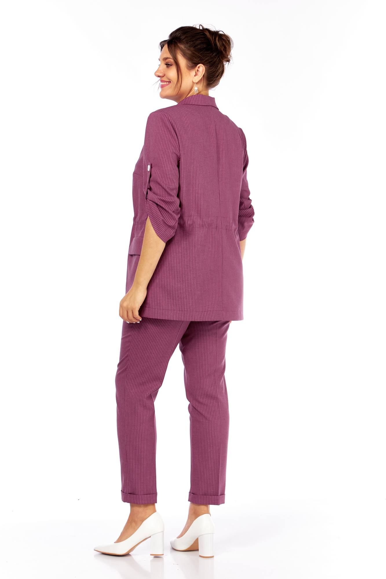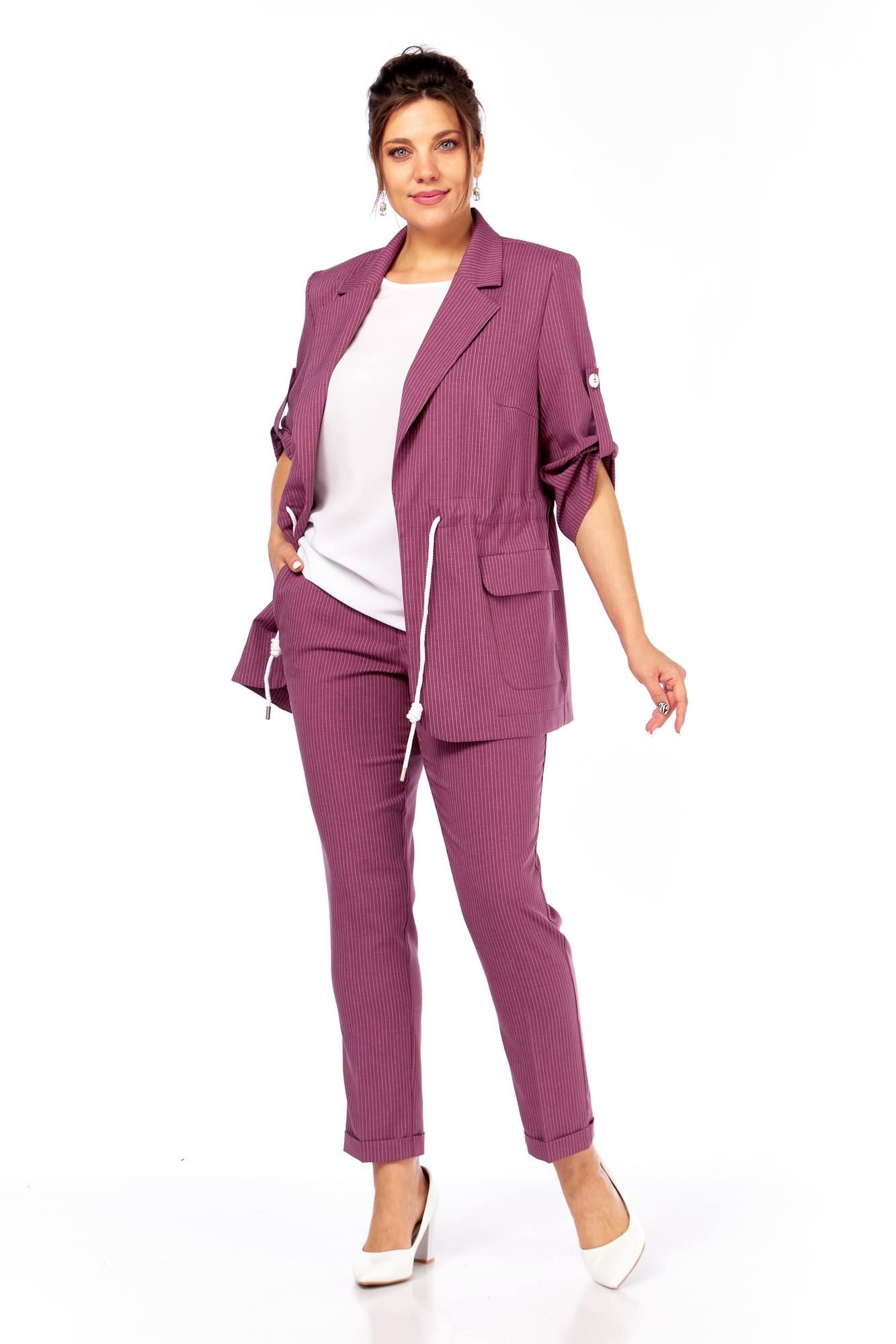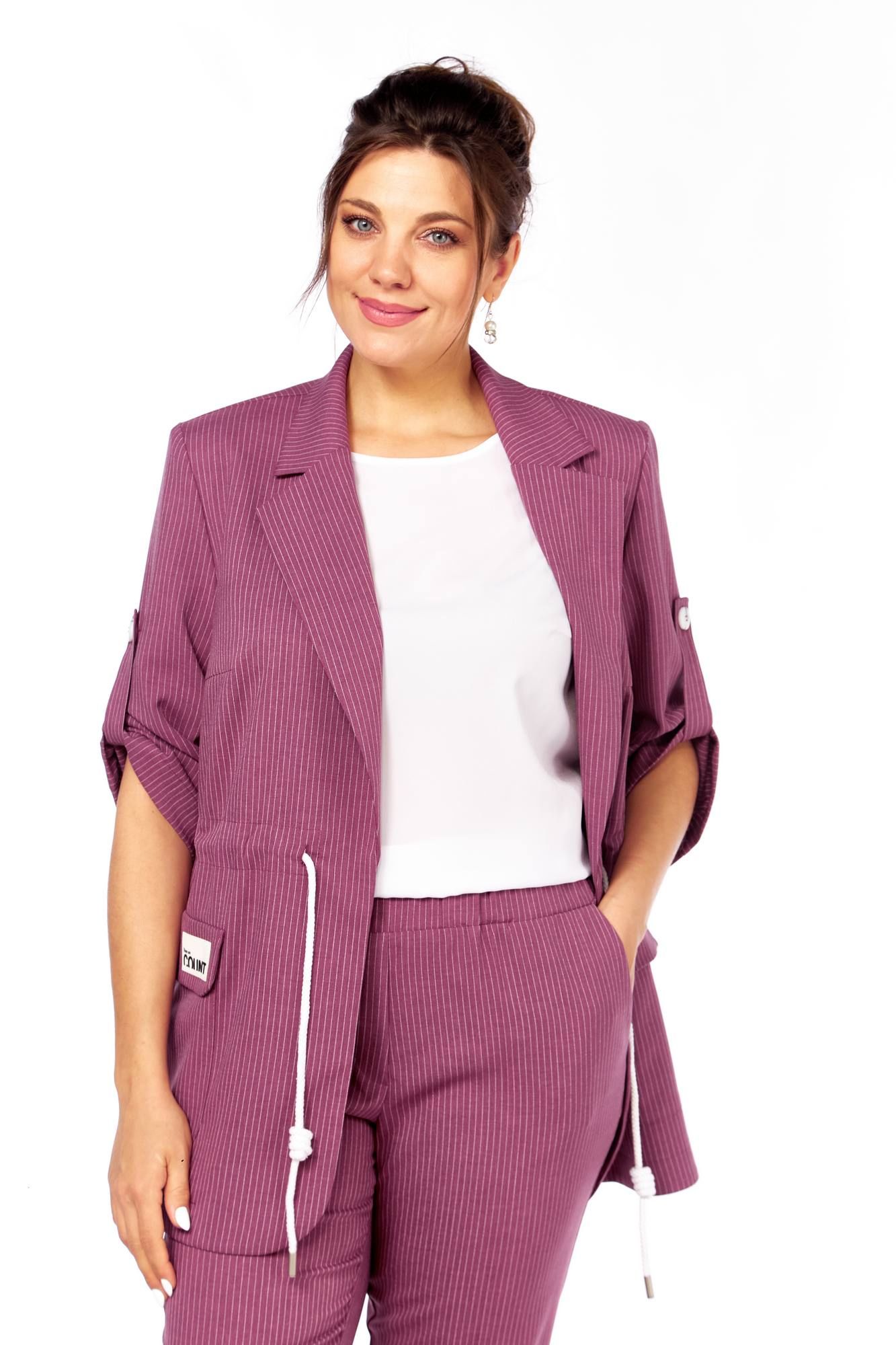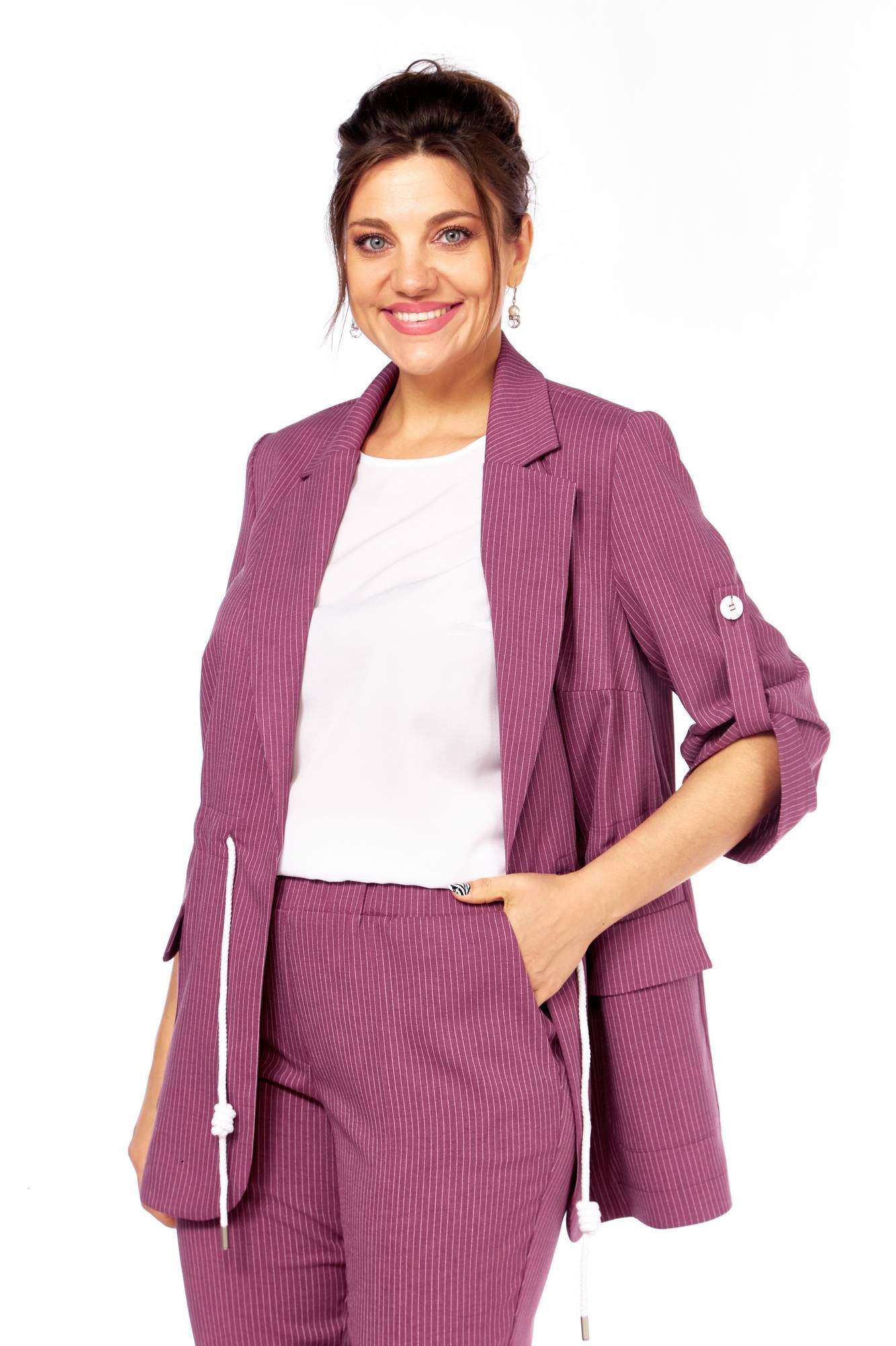 Летний комплект состоящий из жакета, брюк и блузы. Жакет прямого силуэта с пиджачным воротником, без подкладки и без застежки. По бокам накладные карманы с клапанами. На правом клапане декоративная нашивка. По талии кулиска. Рукава втачные, длиной три четверти с патами. Брюки прямые, зауженные к низу, с отворотом, пояс притачной на эластичной тесьме с кулиской, боковые карманы . Блуза прямого силуэта, рукав короткий. Длина блузы 73 см, длина жакета 74 см, длина рукава жакета 48 см, длина брюк 100 см 50 52 54 56 58 60 жакет ОГ 112 116 120 124 128 132 ОБ 116 120 124 128 132 136 брюки пояс 74 78 82 86 90 94 ОБ 118 122 126 130 134 138