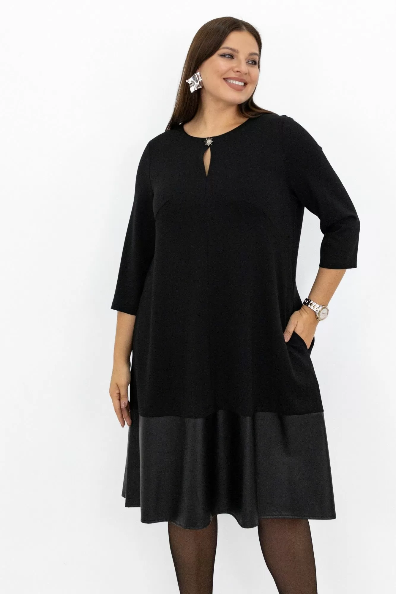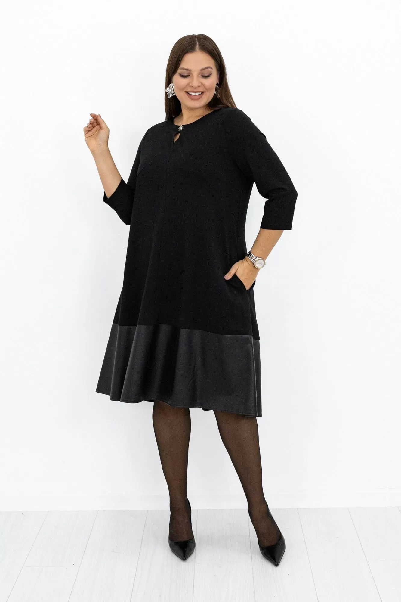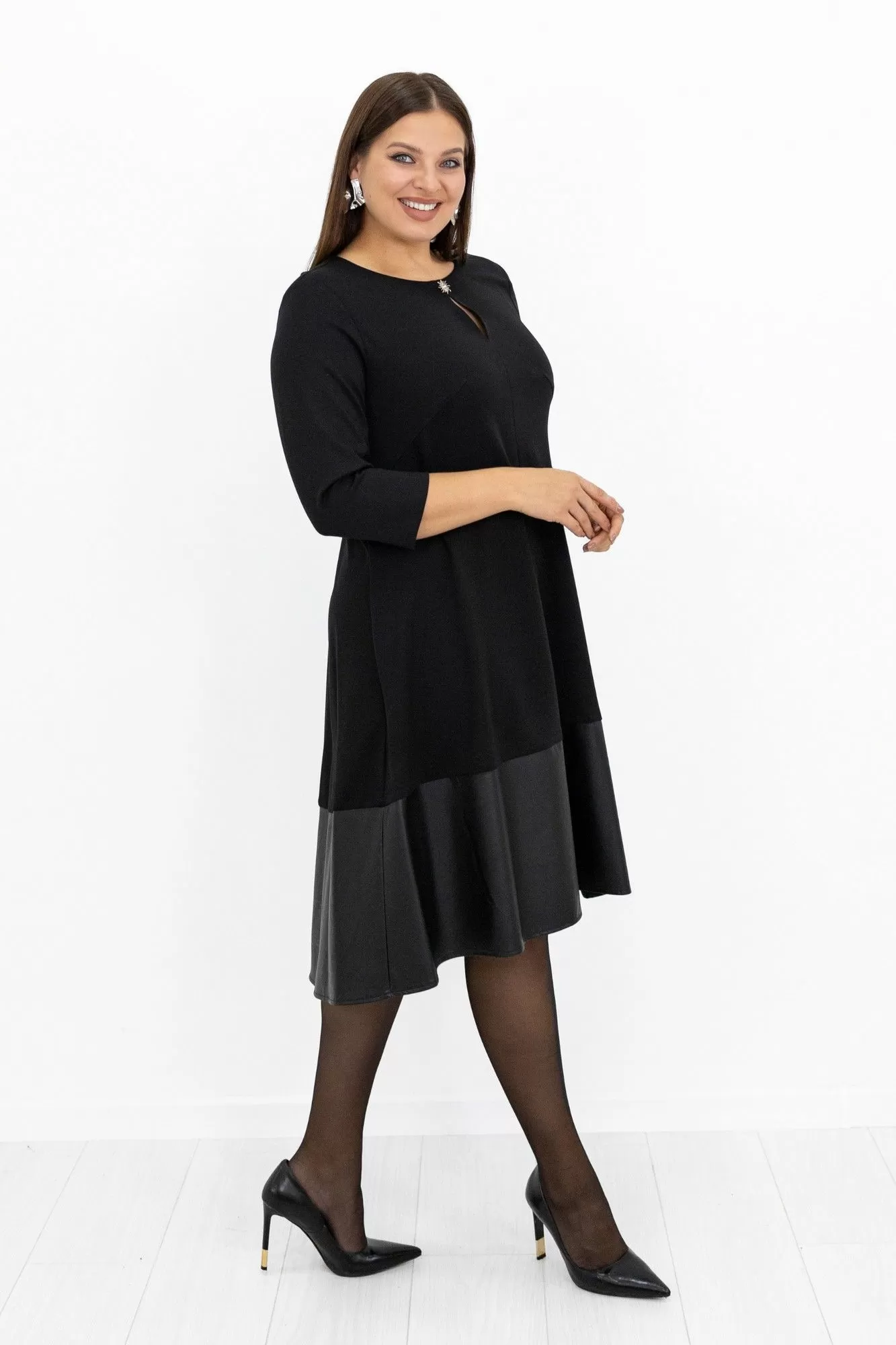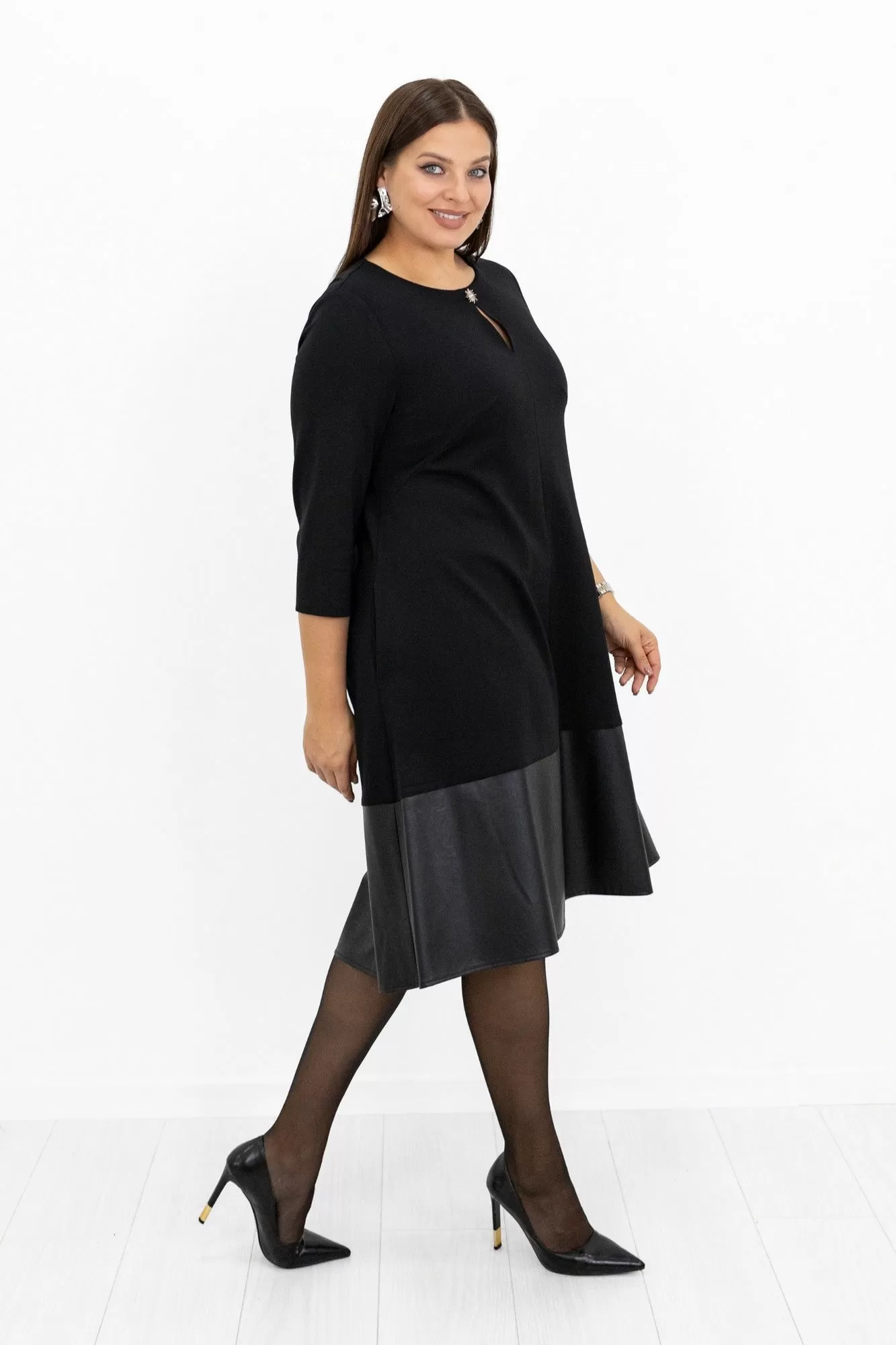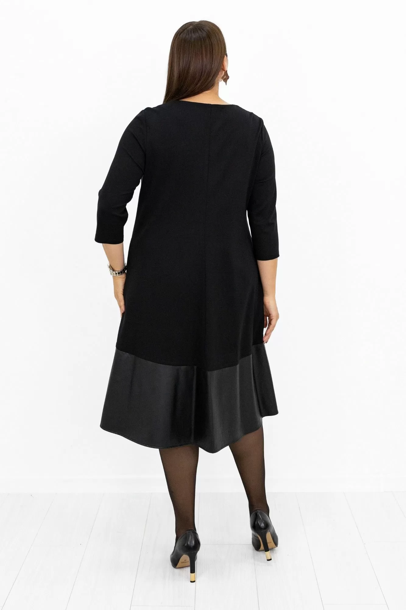 Платье женское, длиной миди. Силуэт трапеция. Модель выполнена из костюмно-плательного трикотажа с отделкой из искусственной кожи. Вырез горловины округлый. По переду средний шов с вырезом у горловины и декоративной пуговицей. Вытачки нагрудные из боковых швов. Волан притачной из искусственной кожи. Длина платья разноуровневая. Плавное скругление низа с удлинением по спинке. Рукав втачной,7/8 (длиной за локоть). Спинка со средним швом и воланом из искусственной кожи. Швы и строчки выполнены в он изделия.