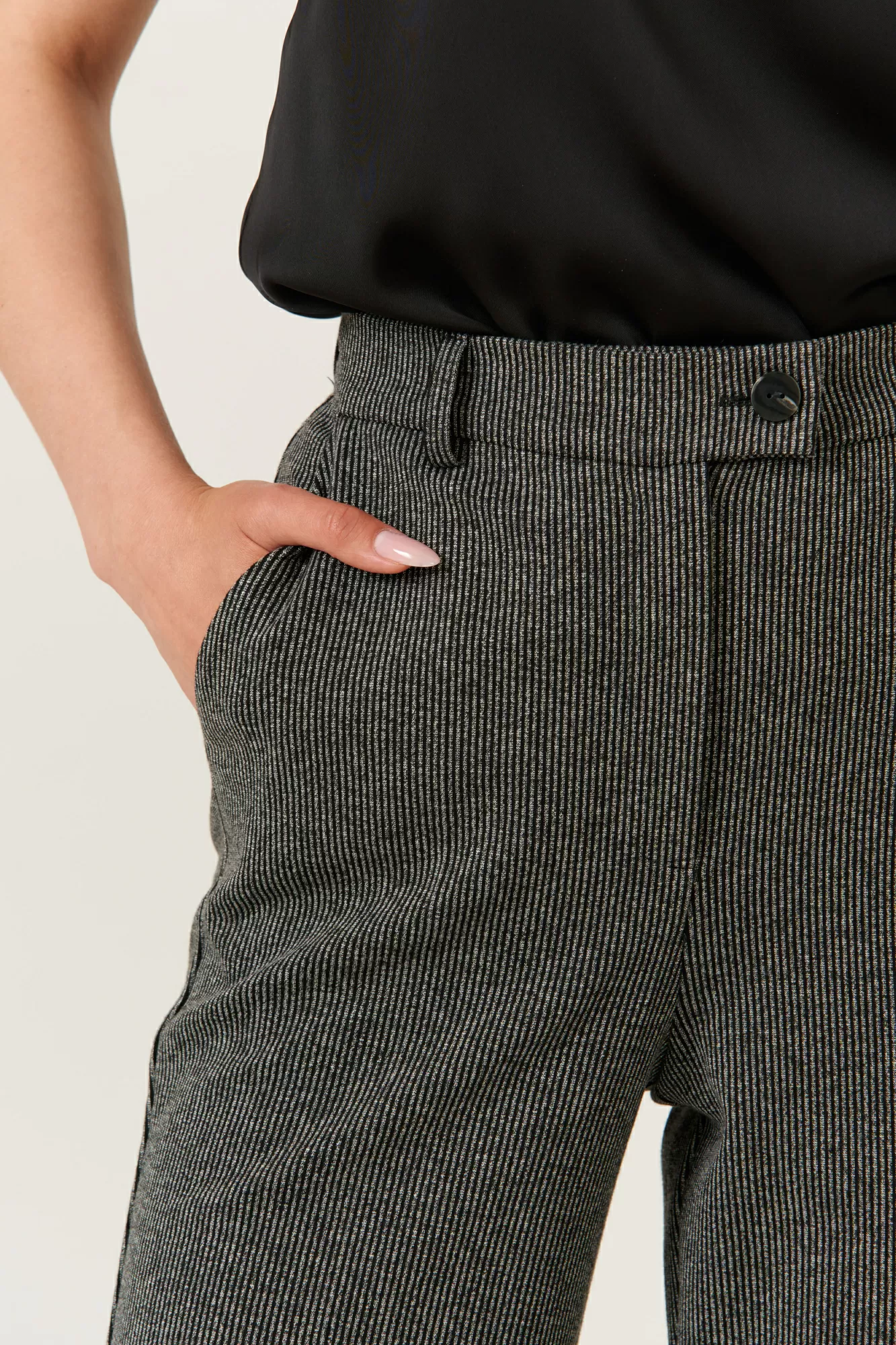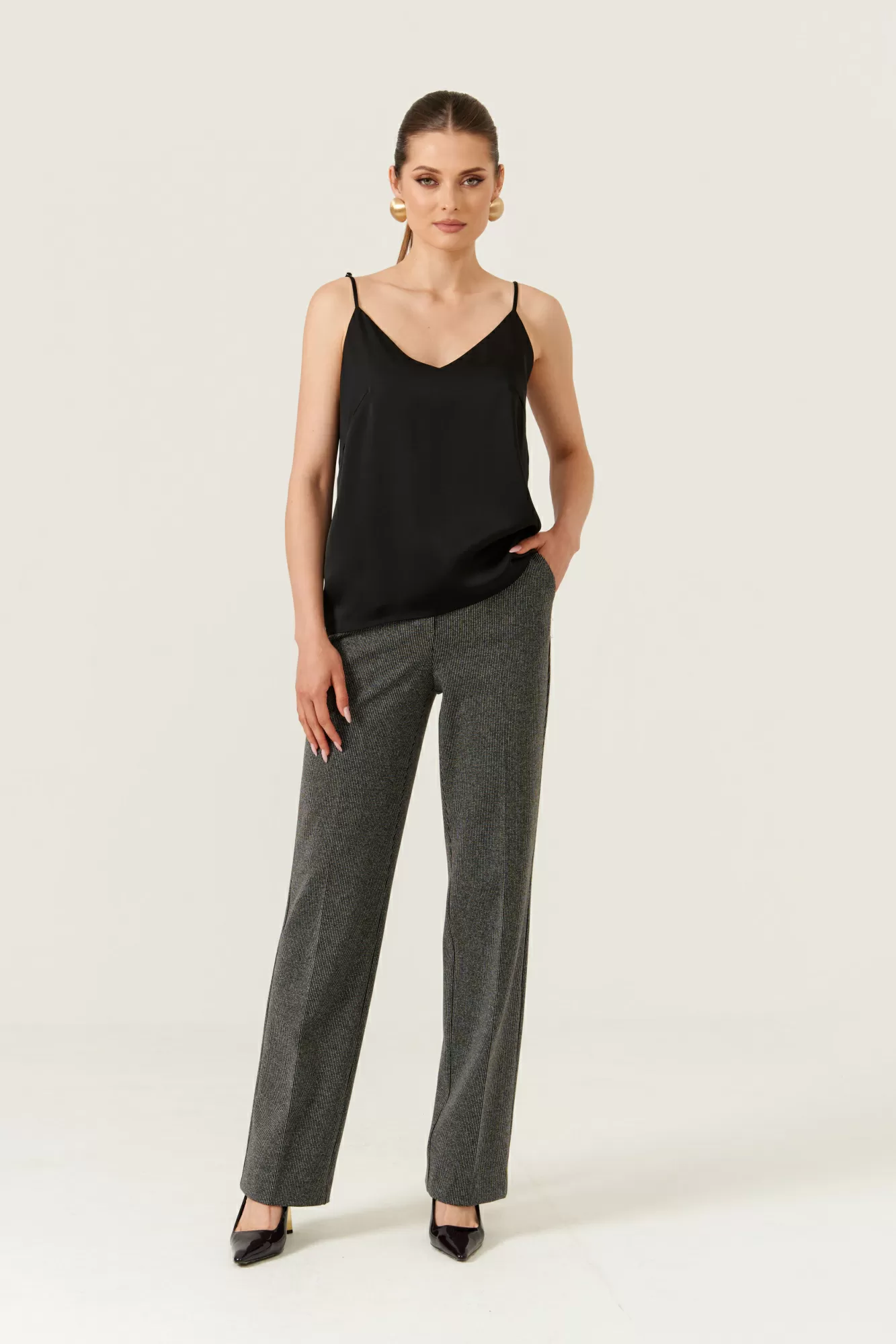 Брюки женские прямые из смесового трикотажного полотна. Верхний срез юбки обработан притачным поясом с застежкой на одну обметанную петлю и одну пуговицу, а также имеется застежка-молния в среднем шве брюк. Срез пояса обработан окантовкой. Пояс со шлёвками, что дает возможность носить брюки под ремень. Задняя часть брюк имеет две талиевые вытачки, а также два прорезных кармана в рамку с двумя обтачками. В боковых швах имеются карманы с подкройным бочком. Брюки отлично подойдут для разного рода мероприятий. Брюки серого оттенка отлично будут смотреться под любой образ и радовать вас каждый день. Данные брюки имеют идеальную посадку за счёт чего они превосходно будут сидеть на любой фигуре.