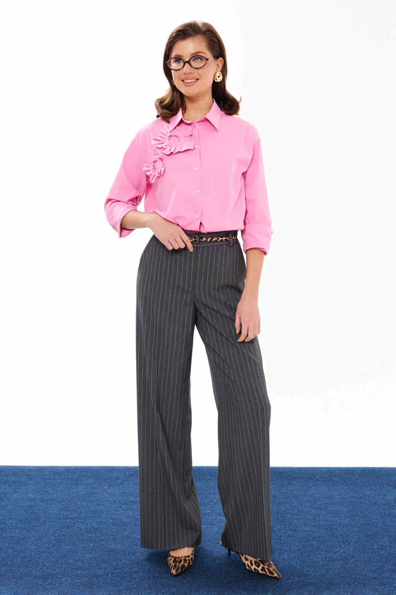 Брюки женские прямые из смесовой ткани для повседневной носки. Верхний срез брюк обработан притачным поясом, застежка на один крючок, а также имеется застежка на тесьму-молнию в среднем шве брюк. В брюках имеются шлевки, что дает возможность носить их под ремень. Задняя часть брюк имеет четыре талиевых вытачек. В брюках расположен в боковом шве карман с подкройным бочком. Отличный классический вариант брюк, которые будут гармонично смотреться под любые изделия.