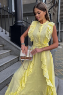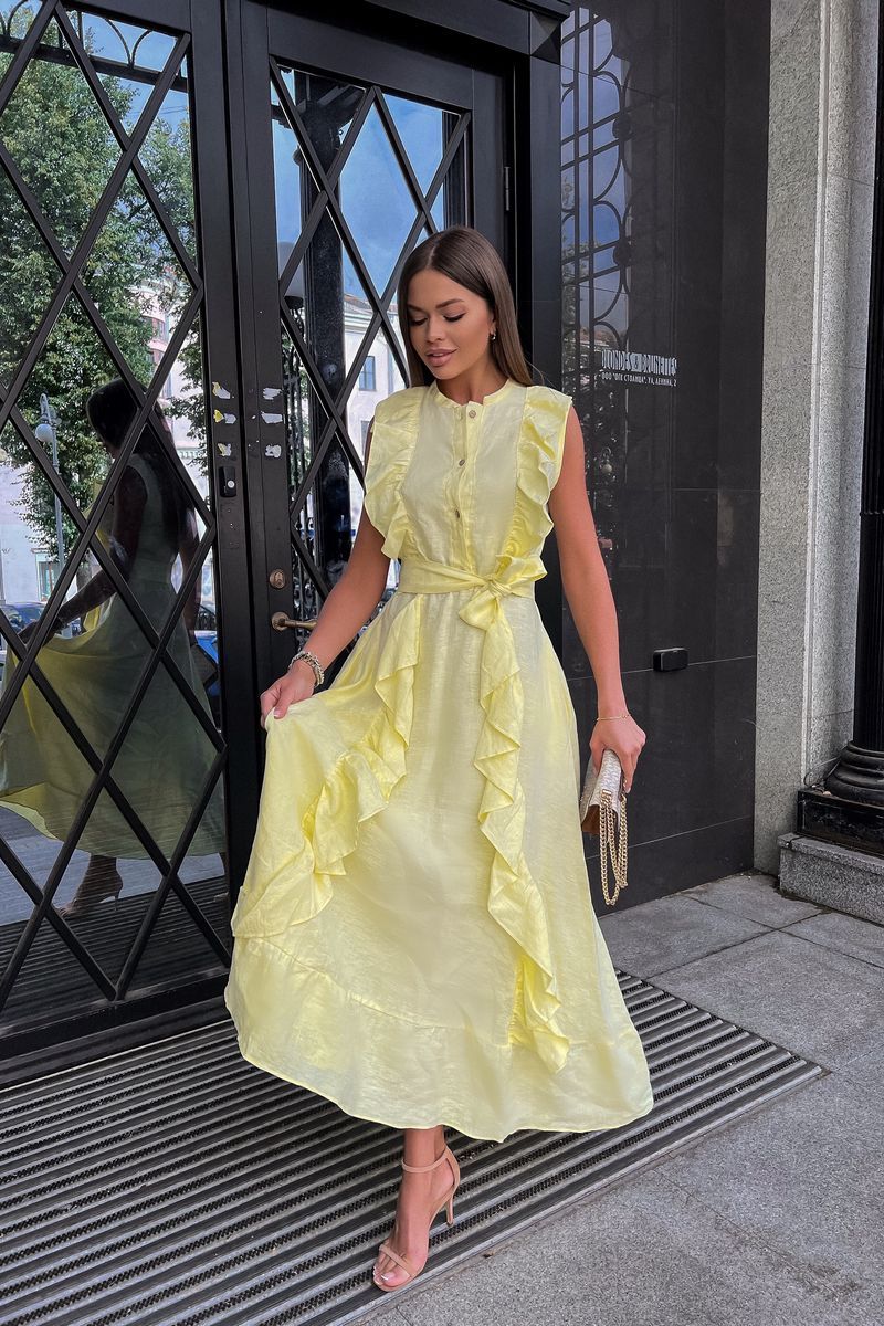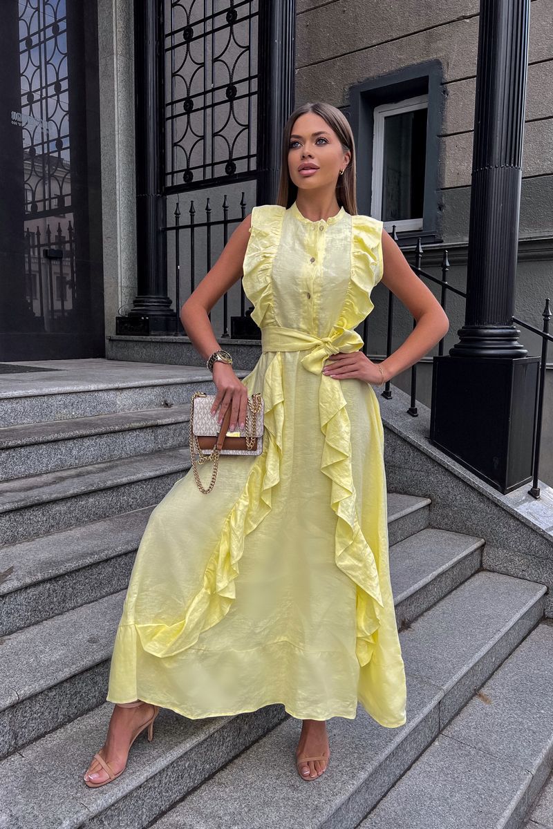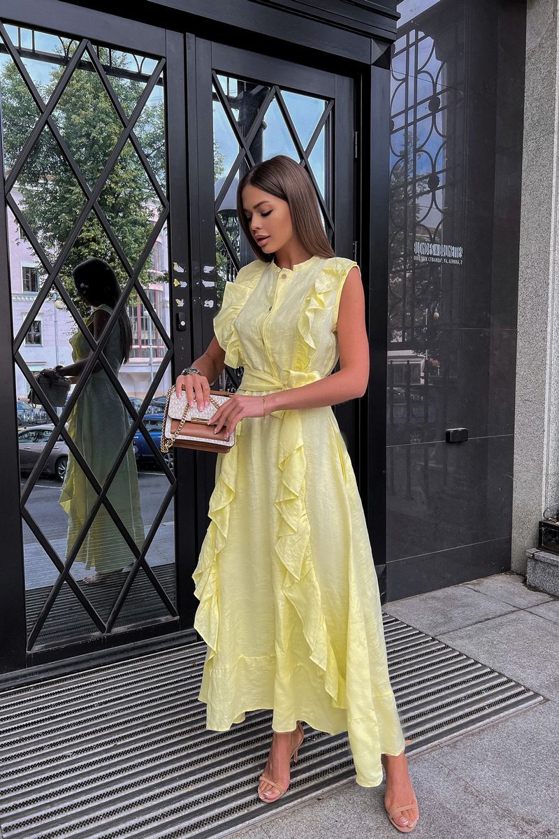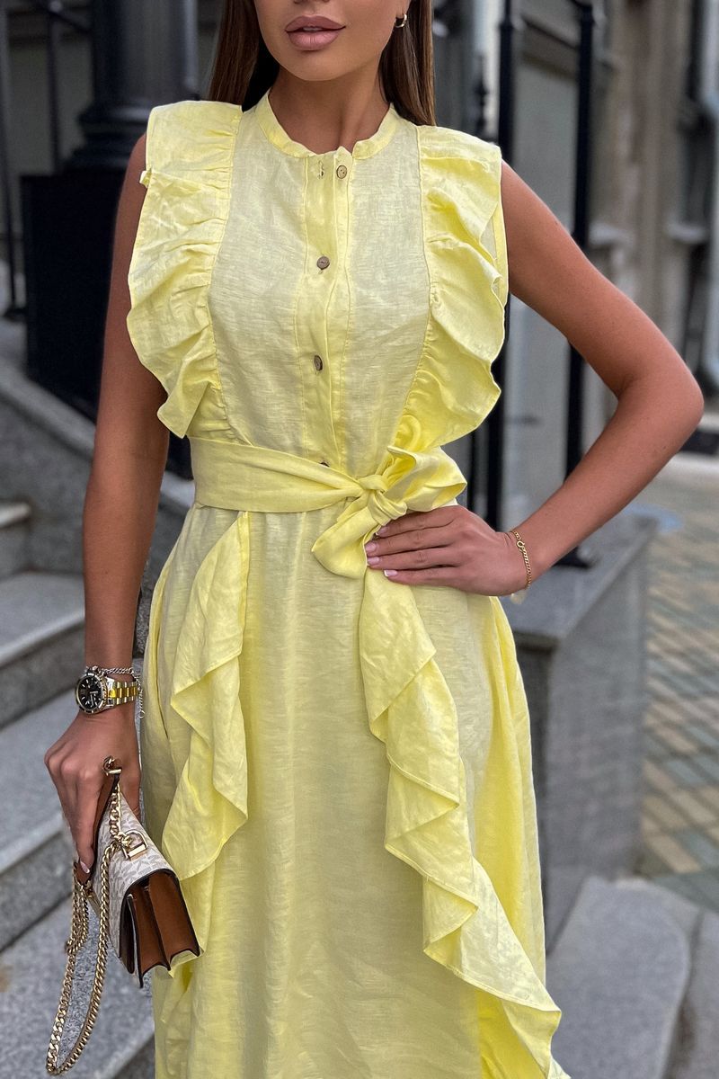 Льняное платье с воланами: самая романтичная Модель лета! Стильное, невероятно эффектное платье. Застегивается на пуговицы. Воздушность и легкость платью придают вертикальные воланы, что, к тому же, вытягивает силуэт. Низ платья, так же, декорирован воланом, придающим романтичности и особого шика. Элегантное, женственное, мгновенно приковывает взгляд к обладательнице – такое платье подойдет как для романтических прогулок, встреч с друзьями, так и для особых событий в вашей жизни, даря прекрасное настроение и возможность выглядеть на все 100%. Пояс в комплект с платьем