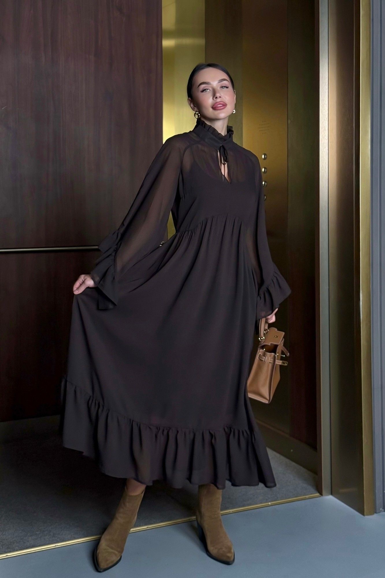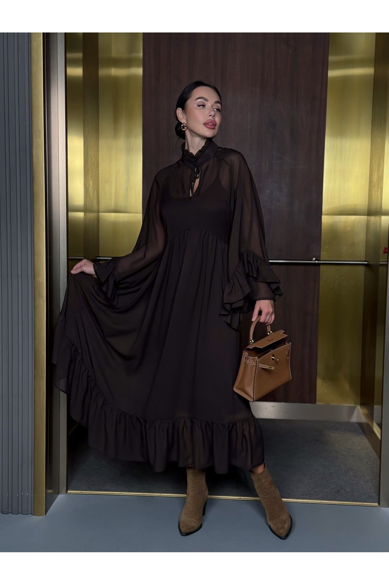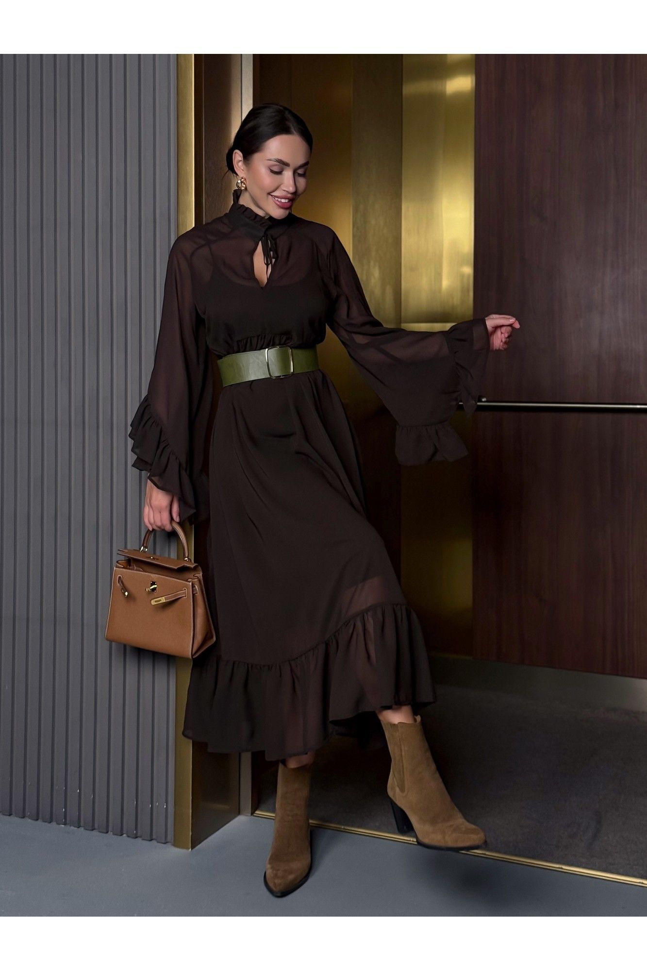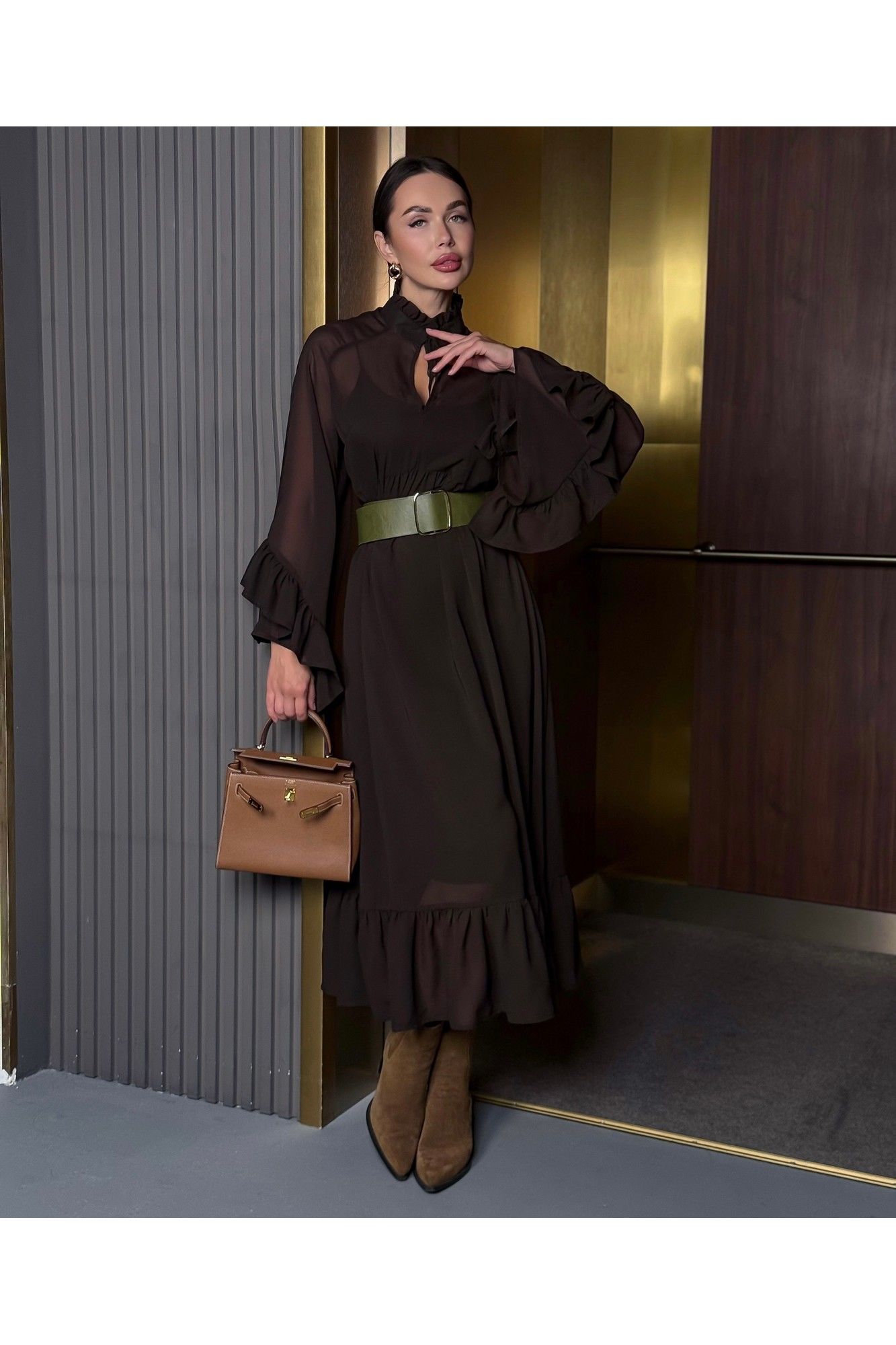 Уникальное платье, которое займет особое место в вашем гардеробе. Платье, с которым модно создать потрясающие варианты на каждый день и шикарные образы на вечер. Благодаря своему универсальному стилю и глубокому шоколадному цвету, платье подойдет для любого времени года. Сочетается как с теплыми аксессуарами осенью и зимой, так и с легкими дополнениями в весенние и летние дни. В комплекте нижнее платье-комбинация и верхнее платье шифоновое. Ремень идёт в комплекте с платьем. Можно носить с поясом и без него. Стиль: Богемный. Длина: Миди. Материал: Премиальный бархатный шифон. Цвет: Горький шоколад. Размер 42 Полуобхват по груди 49 см По талии 45 см Размер 44 Полуобхват по груди 51 см По талии 46 см Размер 46 Полуобхват по груди 52 см По талии 47 см Размер 48 Полуобхват по груди 54см По талии 50 см Размер 50 Полуобхват по груди 55 см По талии 52 см Размер 52 Полуобхват по груди 57 см По талии 53 см Размер 54 Полуобхват по груди 60 см По талии 53 см Длина 126 см.