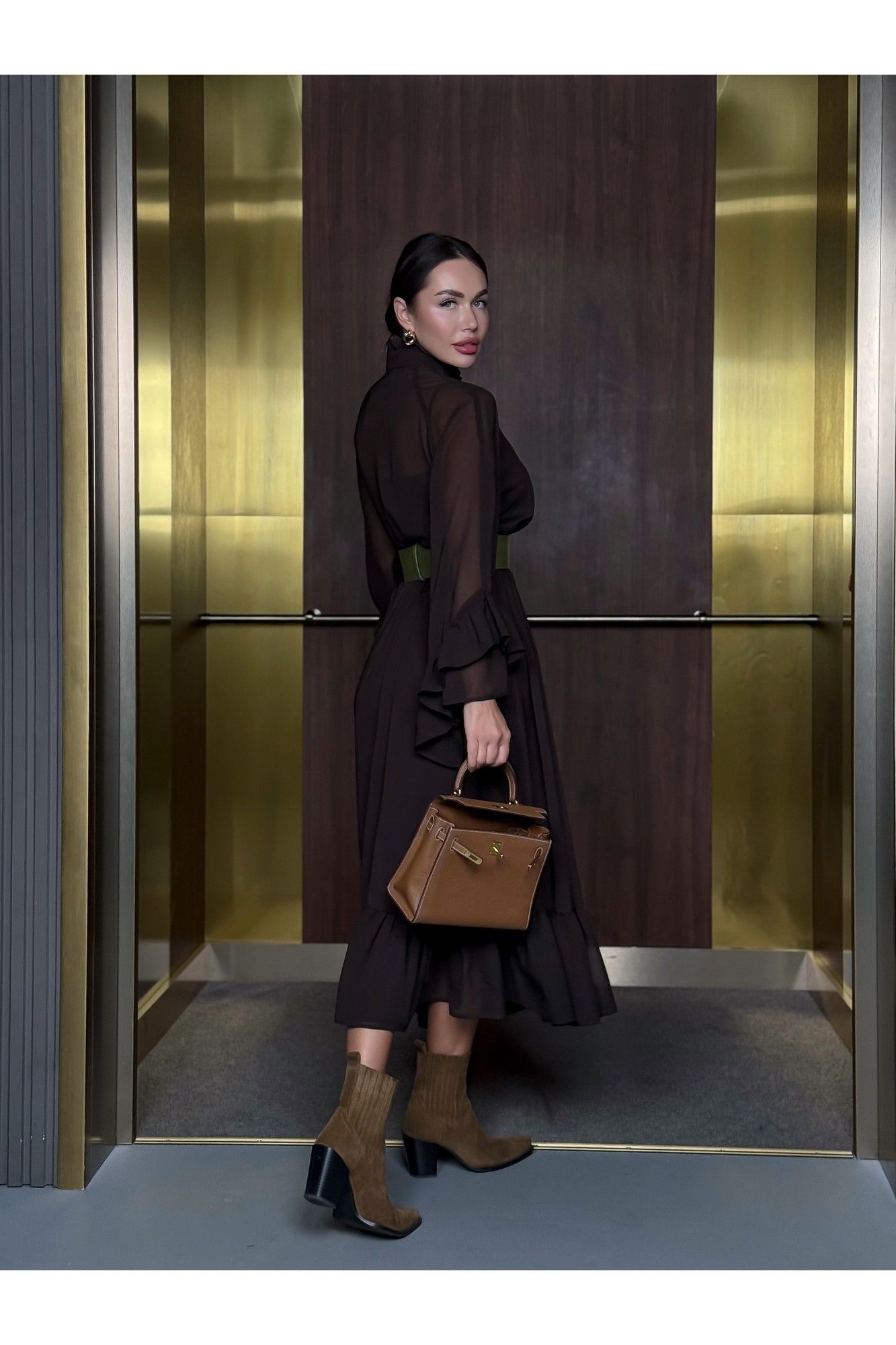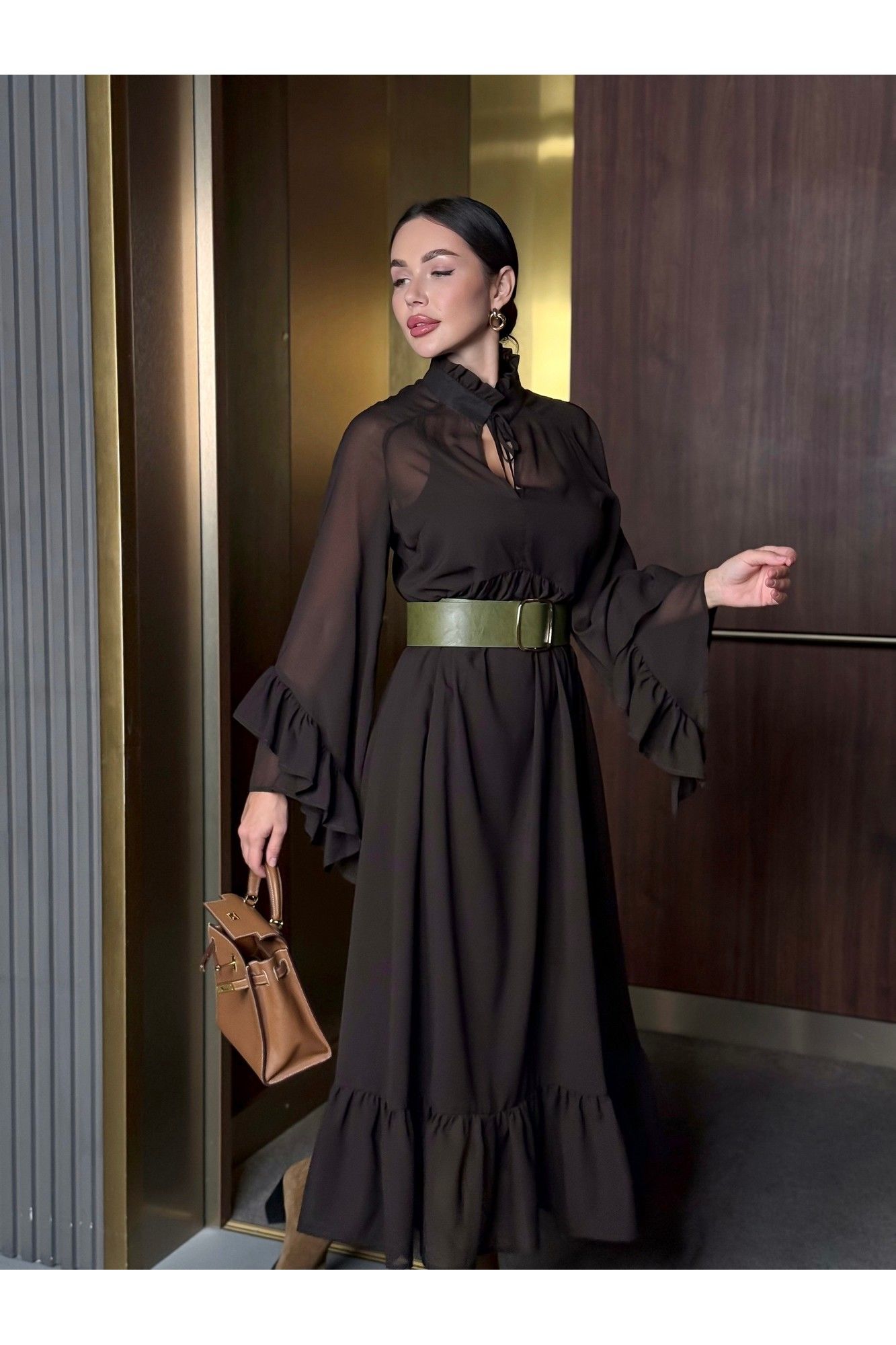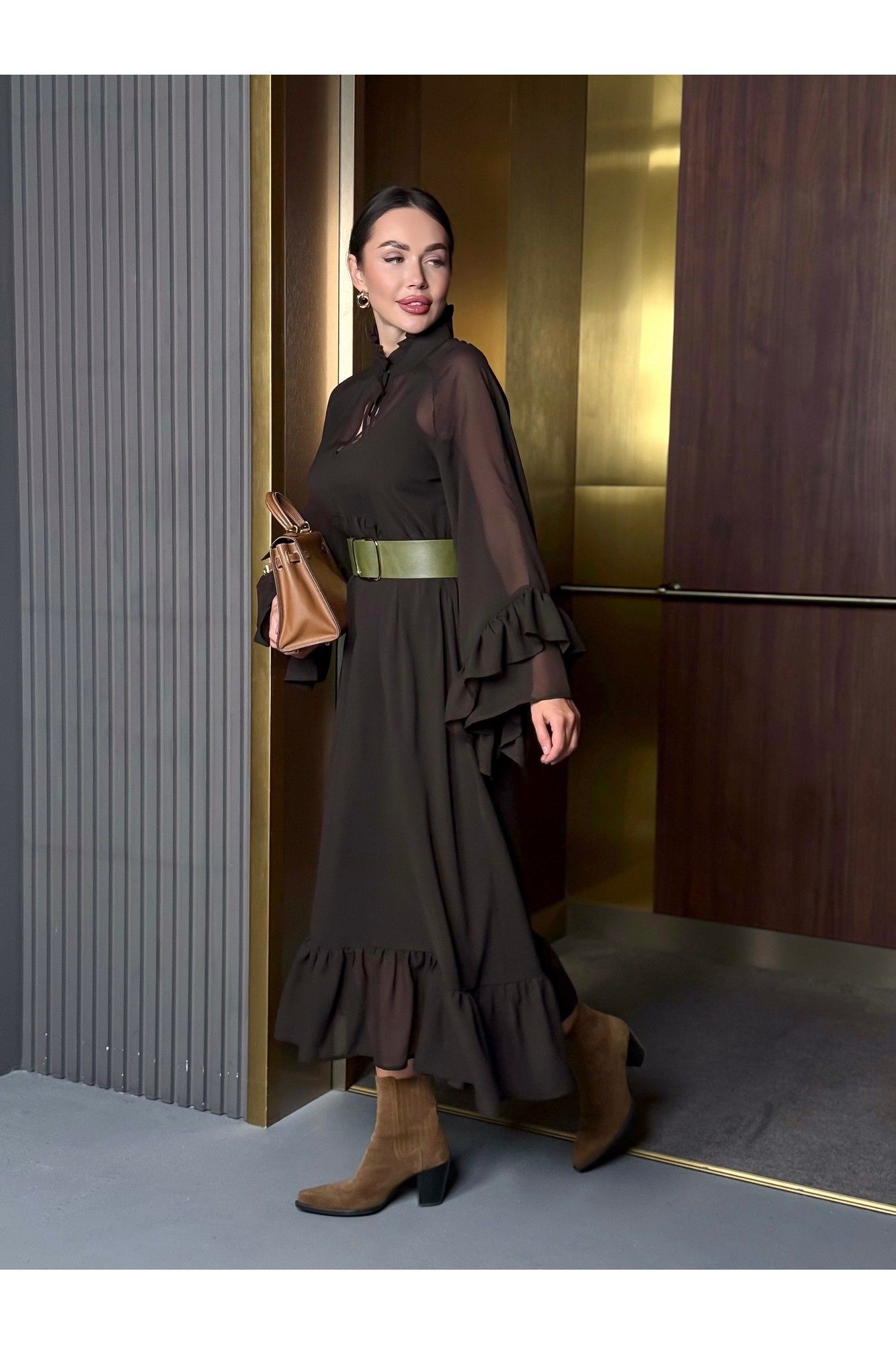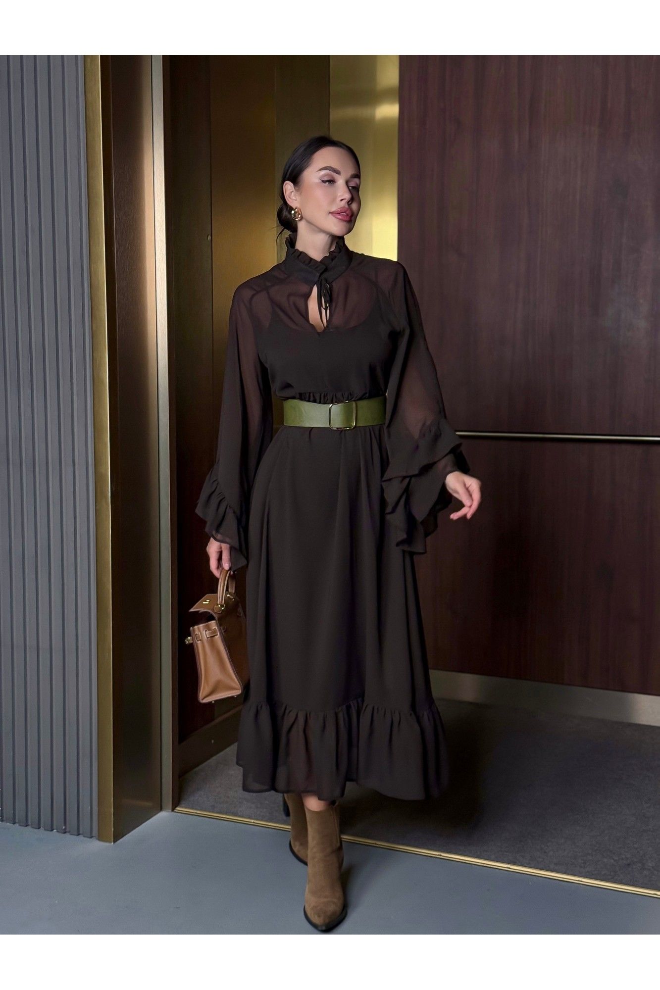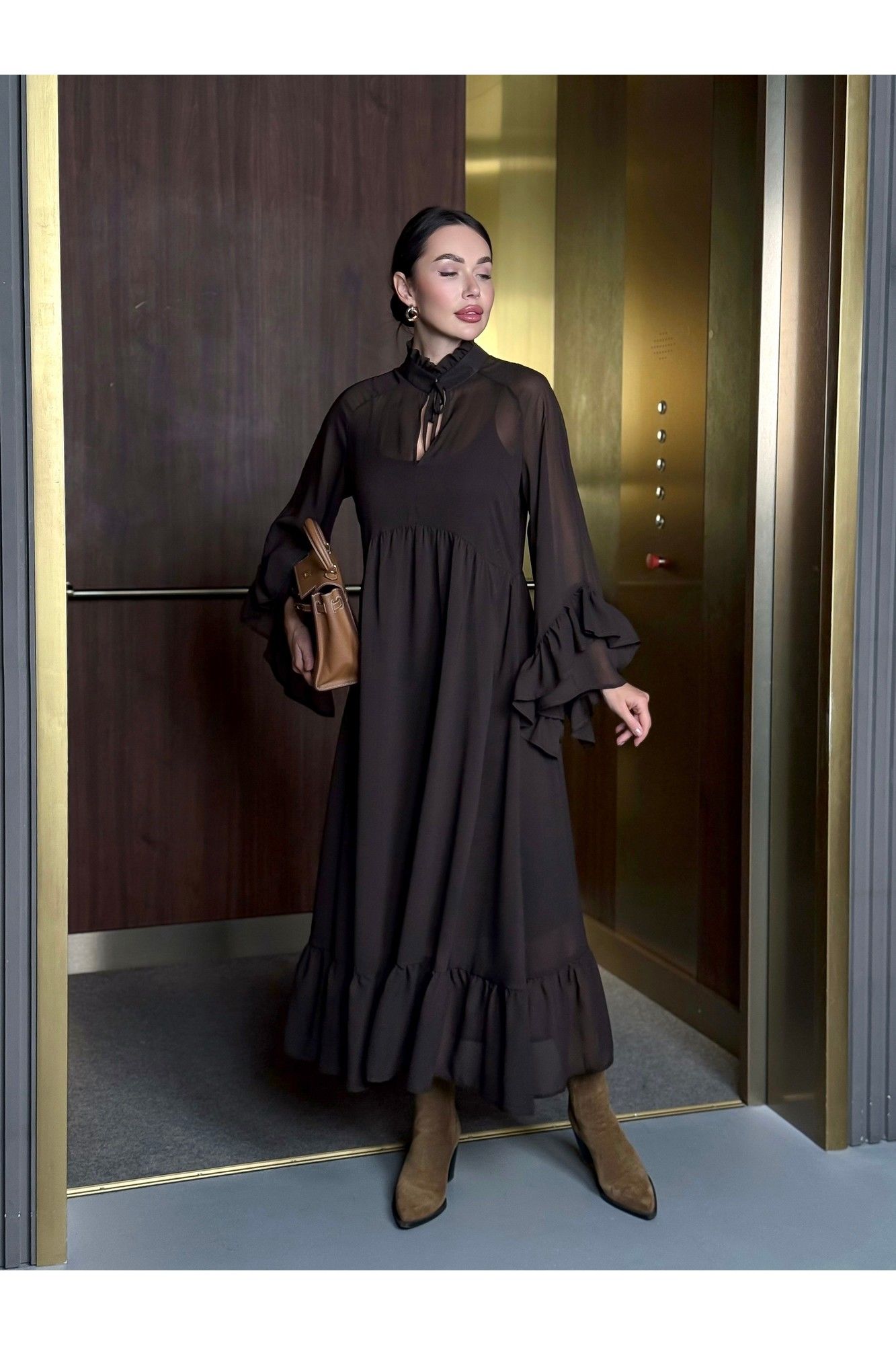 Уникальное платье, которое займет особое место в вашем гардеробе. Платье, с которым модно создать потрясающие варианты на каждый день и шикарные образы на вечер. Благодаря своему универсальному стилю и глубокому шоколадному цвету, платье подойдет для любого времени года. Сочетается как с теплыми аксессуарами осенью и зимой, так и с легкими дополнениями в весенние и летние дни. В комплекте нижнее платье-комбинация и верхнее платье шифоновое. Ремень идёт в комплекте с платьем. Можно носить с поясом и без него. Стиль: Богемный. Длина: Миди. Материал: Премиальный бархатный шифон. Цвет: Горький шоколад. Размер 42 Полуобхват по груди 49 см По талии 45 см Размер 44 Полуобхват по груди 51 см По талии 46 см Размер 46 Полуобхват по груди 52 см По талии 47 см Размер 48 Полуобхват по груди 54см По талии 50 см Размер 50 Полуобхват по груди 55 см По талии 52 см Размер 52 Полуобхват по груди 57 см По талии 53 см Размер 54 Полуобхват по груди 60 см По талии 53 см Длина 126 см.