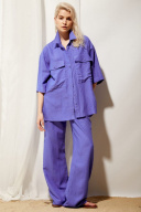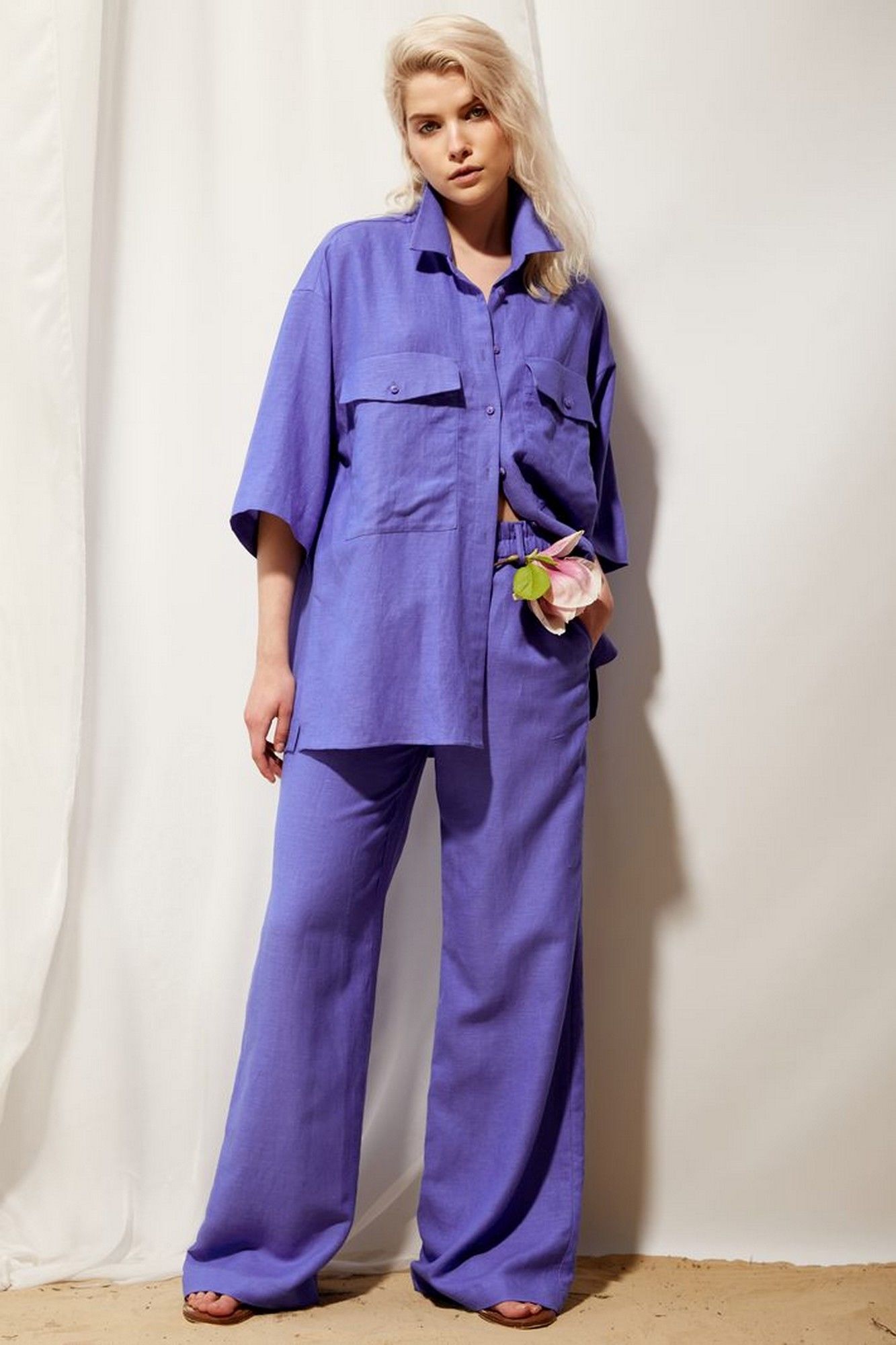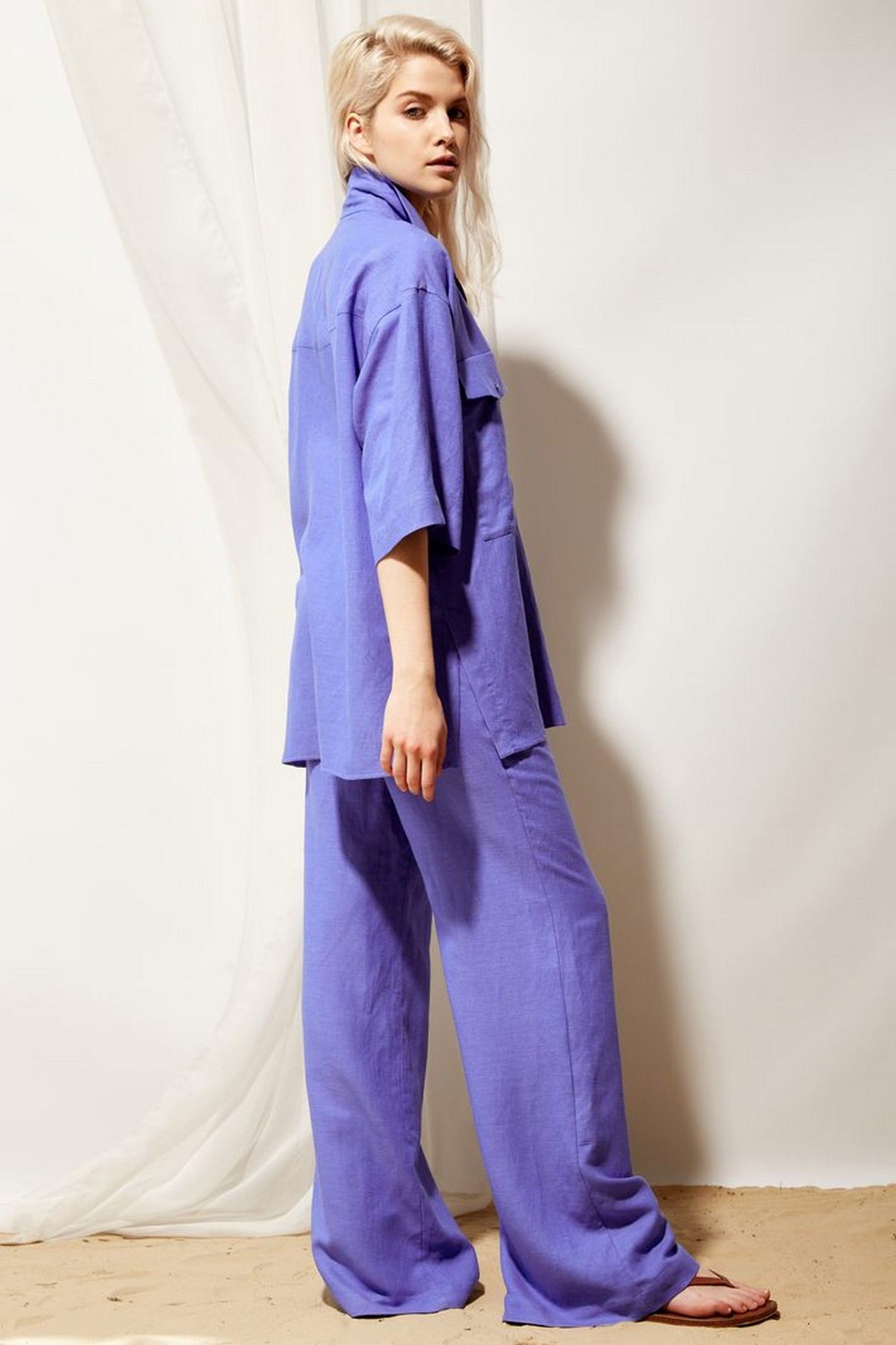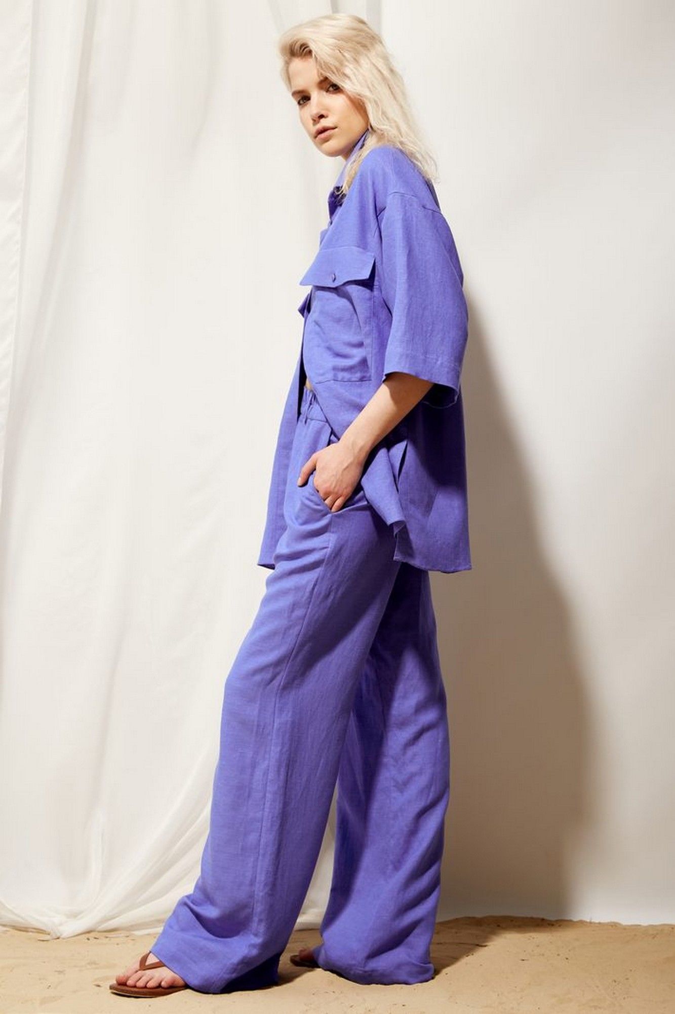 Брюки женские палаццо из льняной ткани в цвете кобальт. Посадка высокая на талии, пояс на резинке, имеются шлевки для продевания ремня. Спереди обработаны боковые наклонные карманы, а также имитация гульфика по шву сидения.