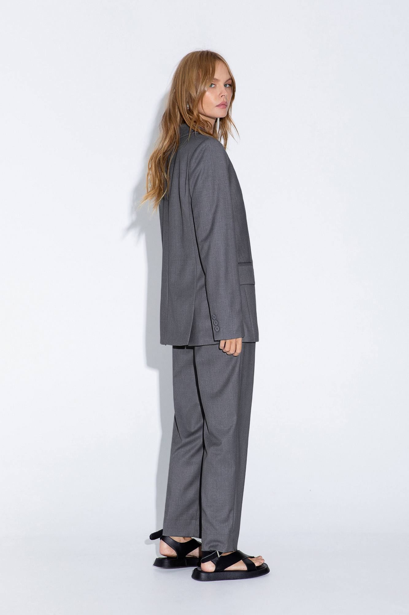 Текстильный костюм-двойка из свободного жакета со шлицами и брюк со складками Детали: жакет полуприлегающего силуэта, талиевые вытачки, пиджачный воротник, застежка на две петли и пуговицы, функциональные карманы, рукава и спинка со шлицами, жакет на подкладке из 100% вискозы. Брюки с высокой посадкой, притачной пояс со шлевками, задняя часть пояса эластичная- с резинкой, застежка на молнию и пуговицу, боковые карманы, передние половины с двумя складками Длина жакета по спинке около 70 см в размерах 40-46 и около 73 см в размерах 48-52 Длина рукавов около 63 см Длина брюк по боковому шву с поясом около 99,5 см в размерах 40-46 и около 101 см в размерах 48-52, длина по внутреннему шву около 70 см