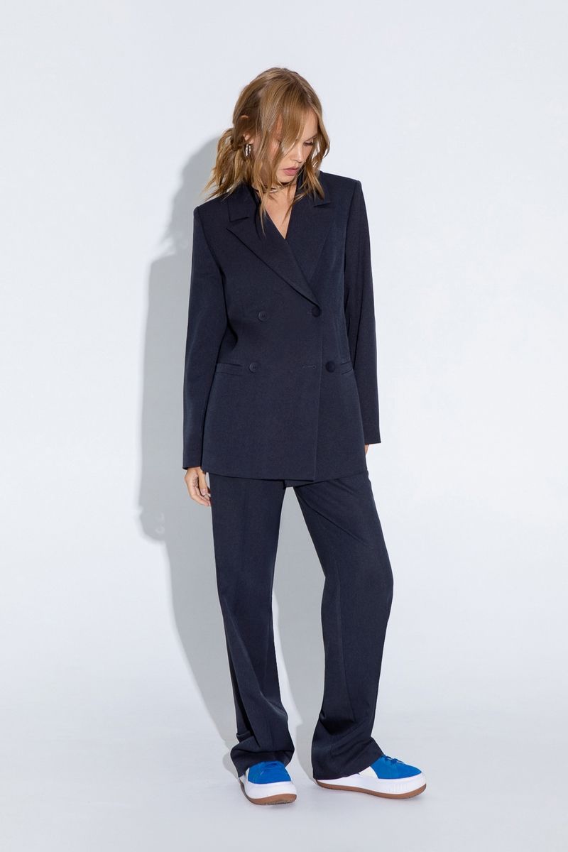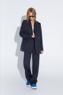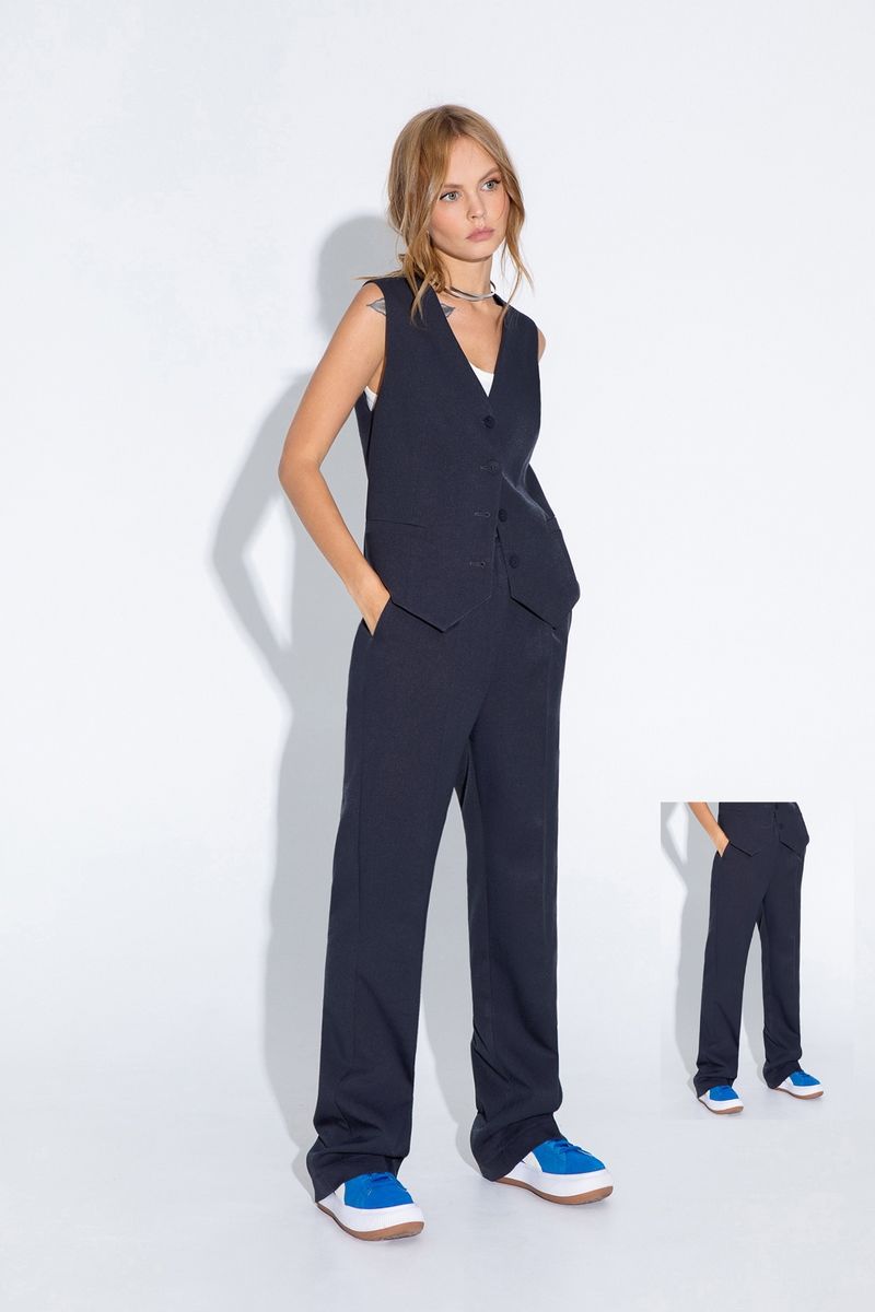Классические прямые брюки из текстильной ткани. Детали: брюки с высокой посадкой, притачной пояс со шлевками, передние половины с небольшими мягкими складками и заутюженными стрелками, застежка на молнию и пуговицу, боковые карманы. Длина по боковому шву с поясом около 112,5 в размерах 40-46 и около 114 см в размерах 48-52 Длина по внутреннему шву около 80 см