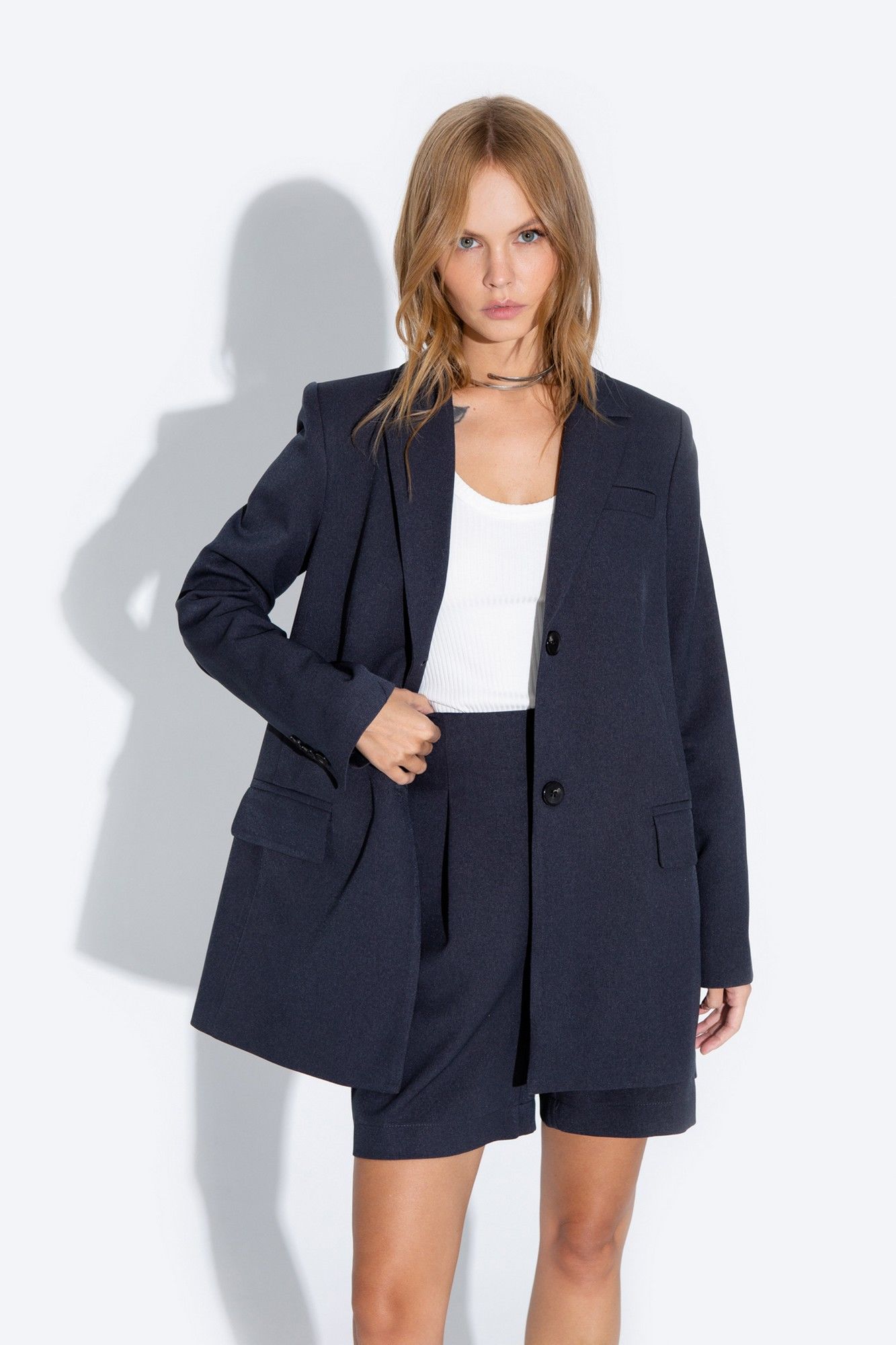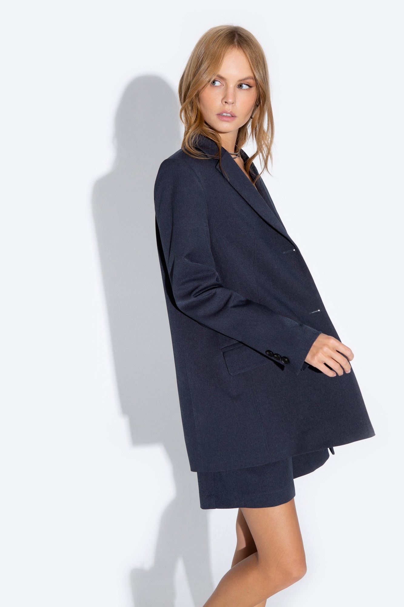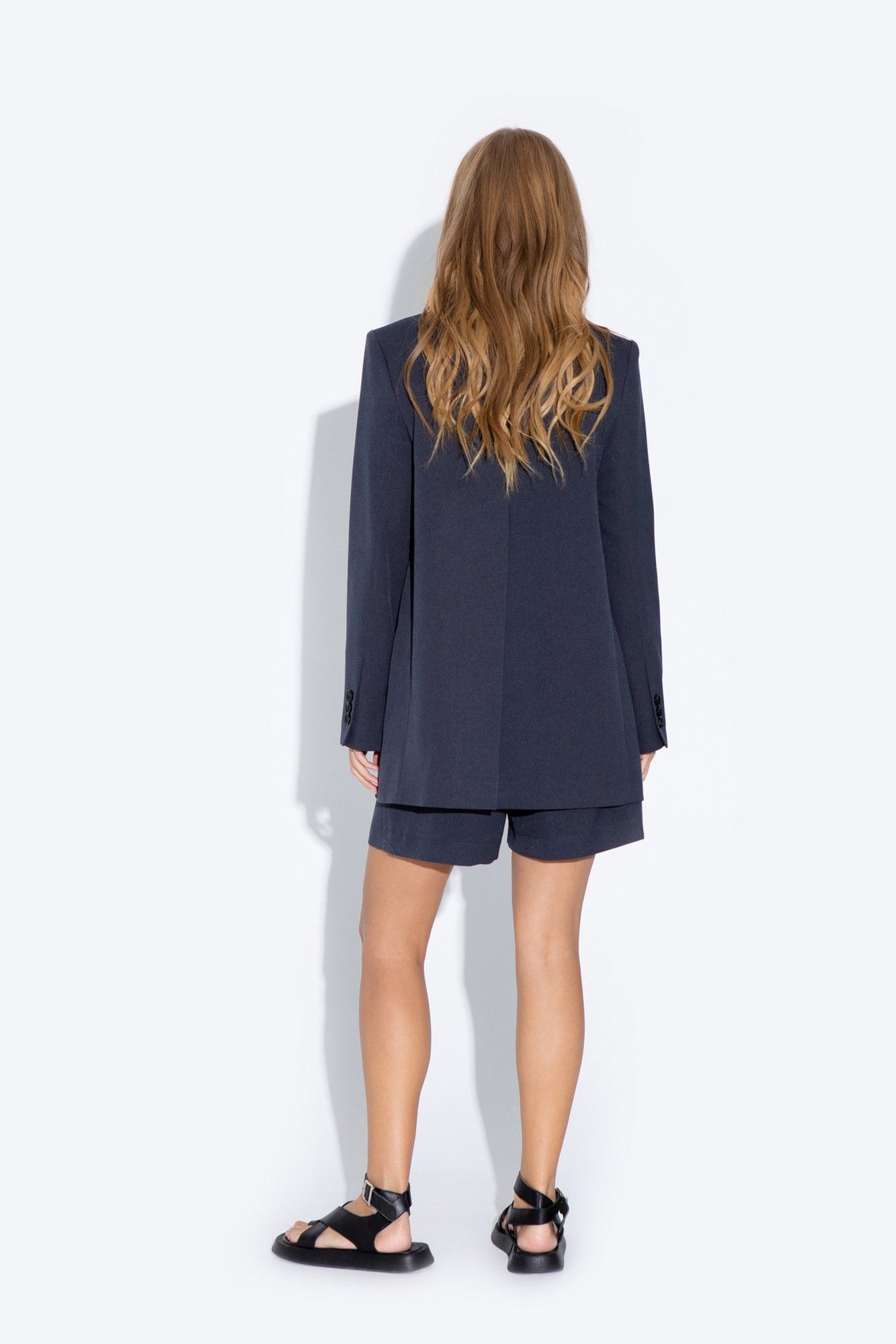 Трапециевидный жакет свободного покроя из текстильной ткани. Детали: пиджачный воротник, талиевые вытачки, функциональный нагрудный карман, прорезные карманы с клапанами, застежка на пуговицы, спинка со средним швом и высокой шлицей, рукава втачные двухшовные, жакет на подкладке Длина по спинке около 75 в размерах 40-46 и около 78 см в размерах 48-52, длина рукавов около 61 см