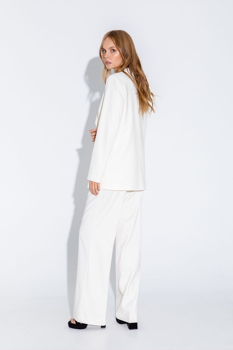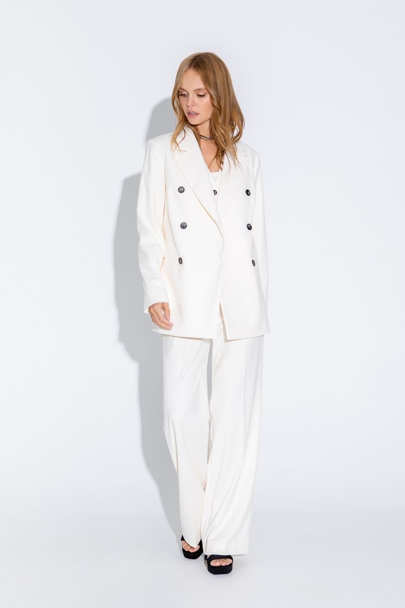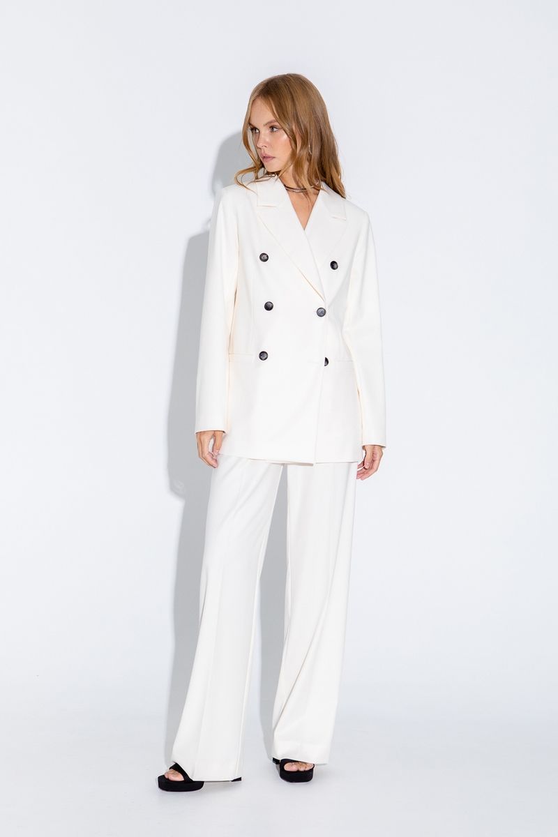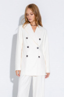 Текстильный оверсайз жакет прямого кроя. Детали: жакет полуприлегающего силуэта, пиджачный воротник, перед с прорезными карманами, двубортная застежка на петли и пуговицы, спинка со средним швом, рукава втачные двухшовные, жакет на подкладке Длина по спинке около 69 см в размерах 40-46 и около 71 см в размерах 48-52, длина рукавов около 61,5 см