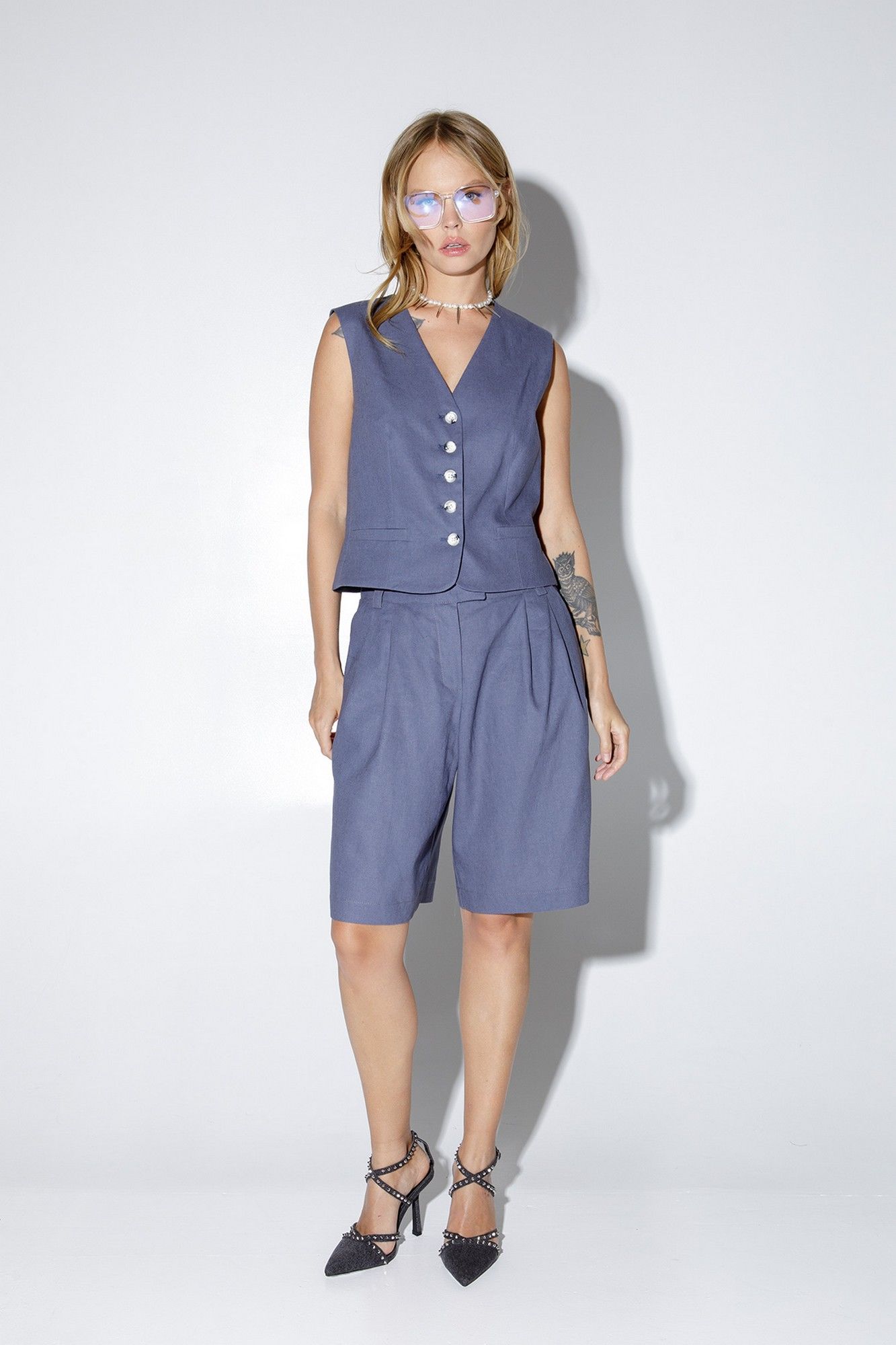 Льняной костюм-двойка из свободного жилета полуприлегающего силуэта и шорт-бермуд с широкими складками. Детали: жилет с талиевыми вытачками, спинка со средним швом и рельефами, застежка на петли и пуговицы, функциональные карманы, на подкладке 100% хлопок, прилегание по талии регулируется хлястиками на спинке. Шорты с притачным поясом со шлевками, застежка на молнию и брючный крючок, боковые карманы. Задние части шорт с вытачками и имитацией карманов. Длина жилета по спинке около 46 см в размерах 40-46 и около 49 см в размерах 48-52. Длина шорт по боковому шву с поясом около 51 см в размерах 40-46 и около 54 см в размерах 48-52. Длина шорт по внутреннему шву около 23 см в размерах 40-46 и около 25 см в размерах 48-52