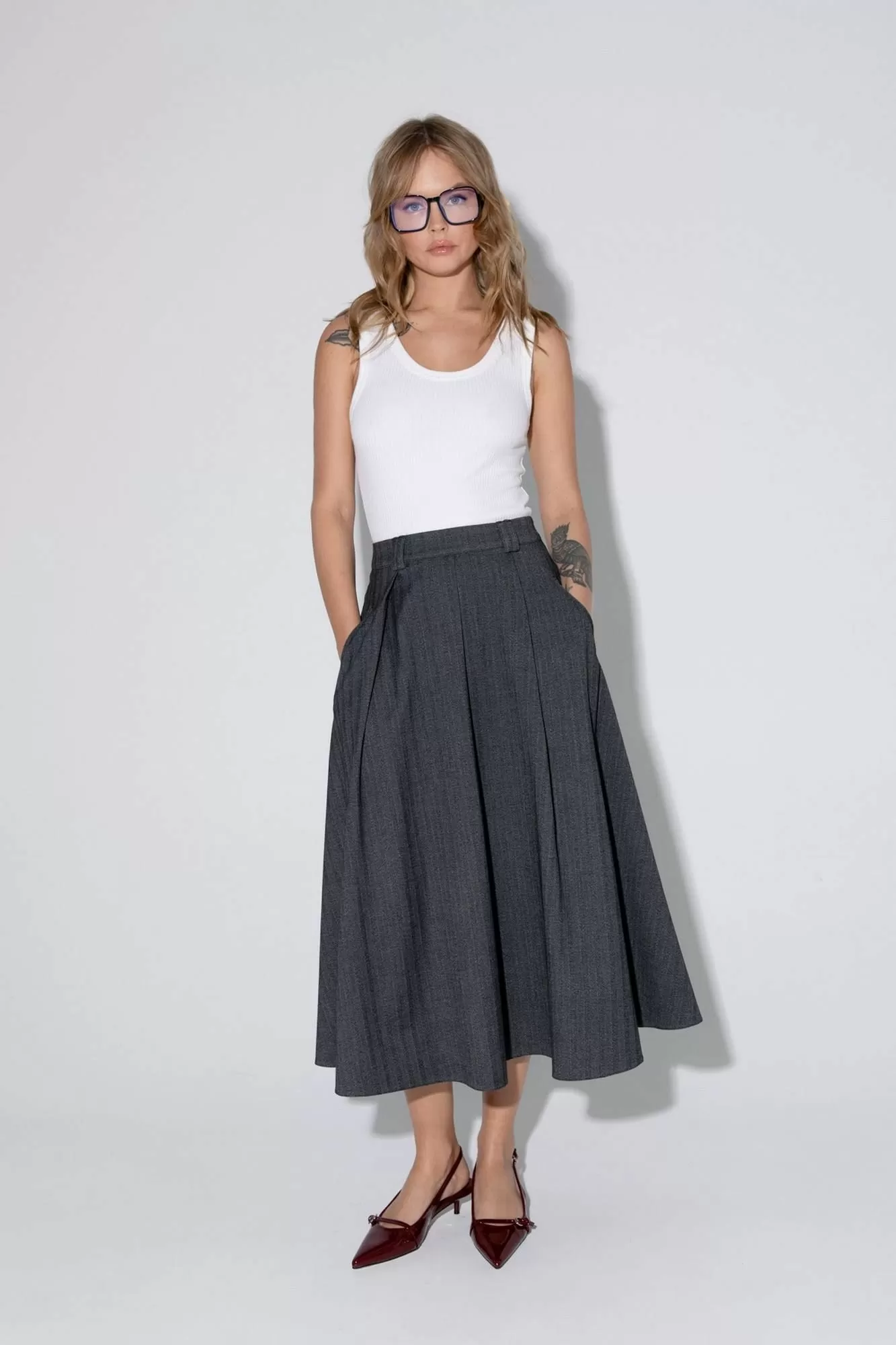 Детали: юбка на притачном поясе со шлевками, прорезные карманы, застежка на потайную молнию в левом боковом шве, на подкладке.