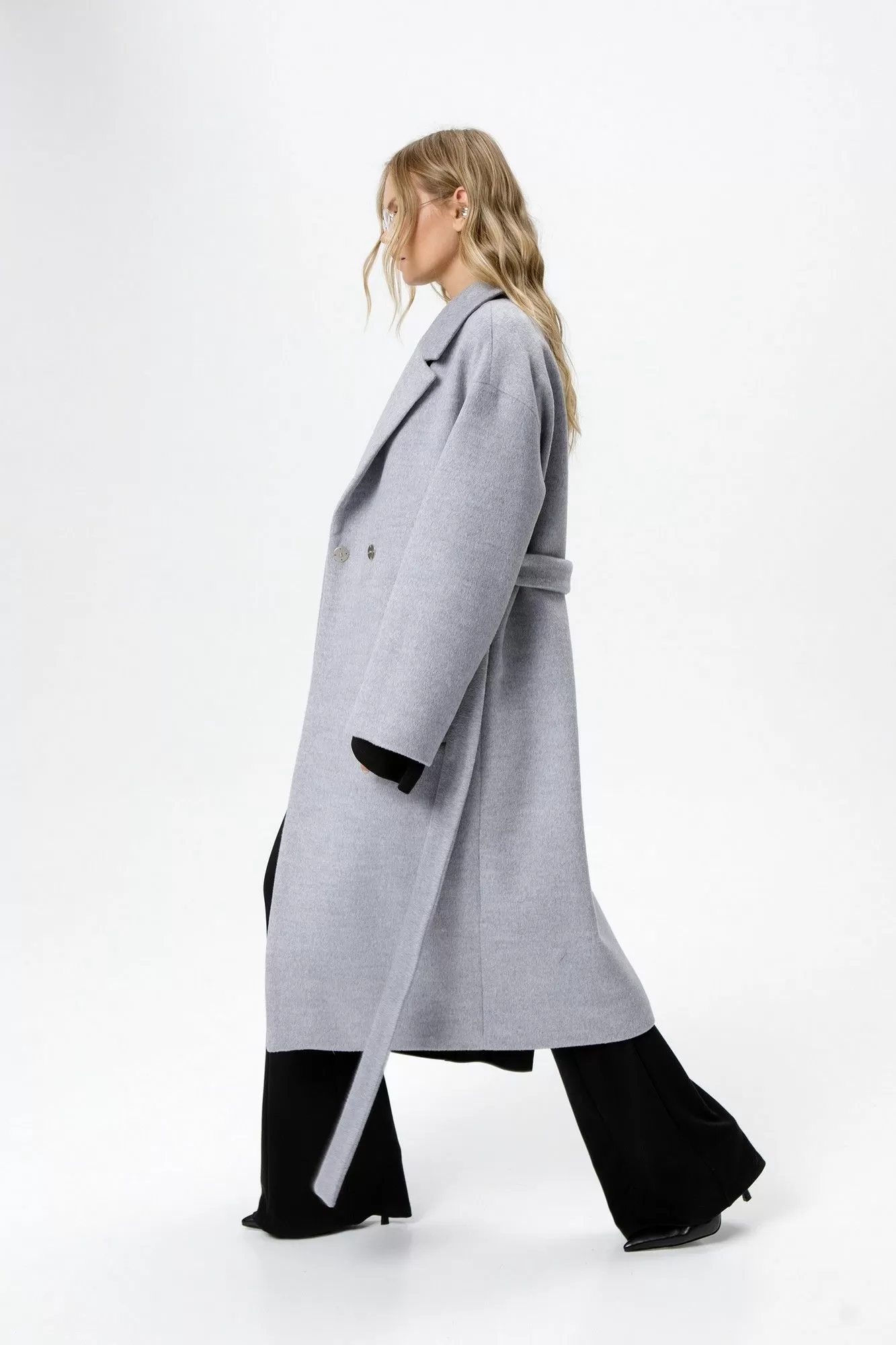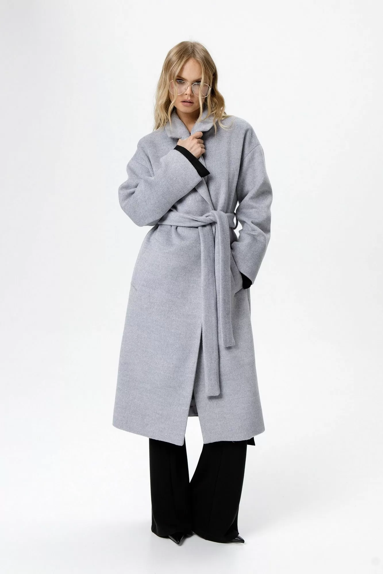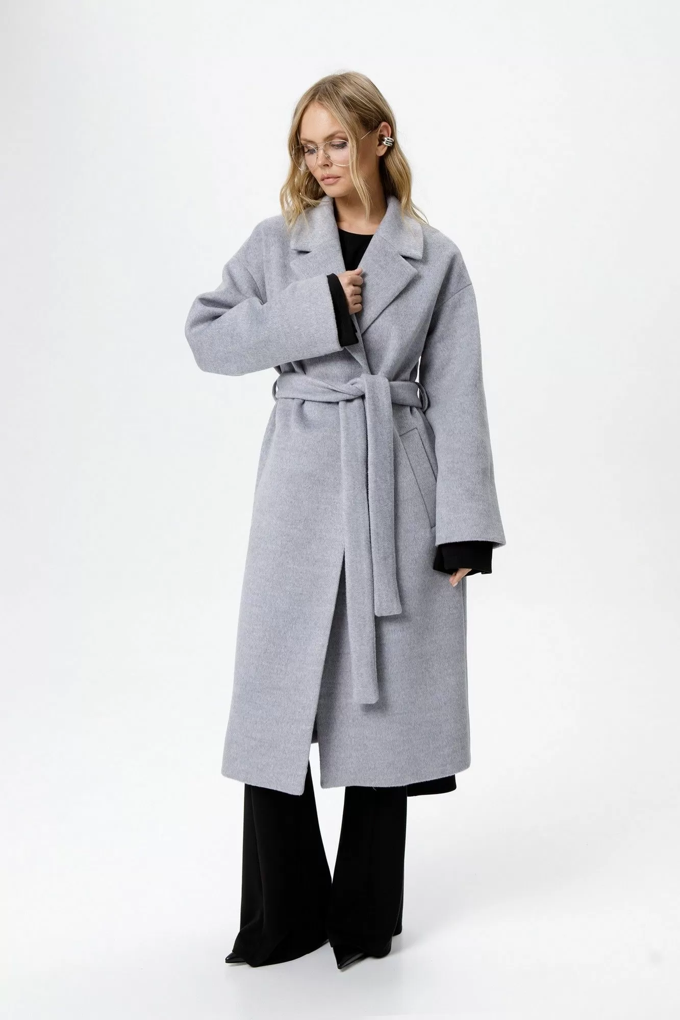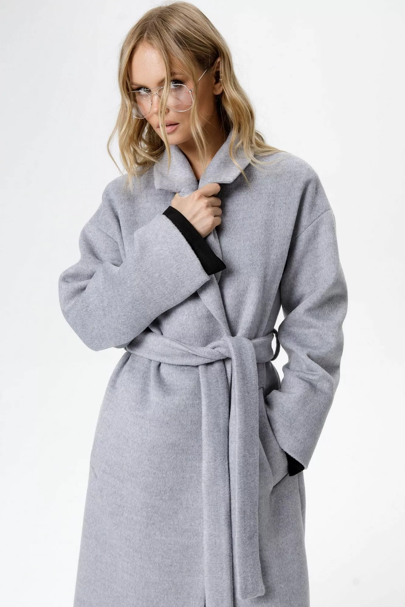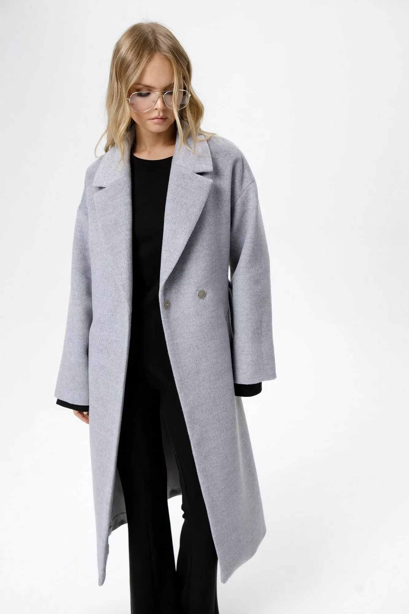 Детали: прямой силуэт, спущенная линия плеча, перед с прорезными карманами, пиджачный воротник, двубортная застежка на пришивные кнопки, рукава длинные, съемный пояс со шлевками, пальто на подкладке.