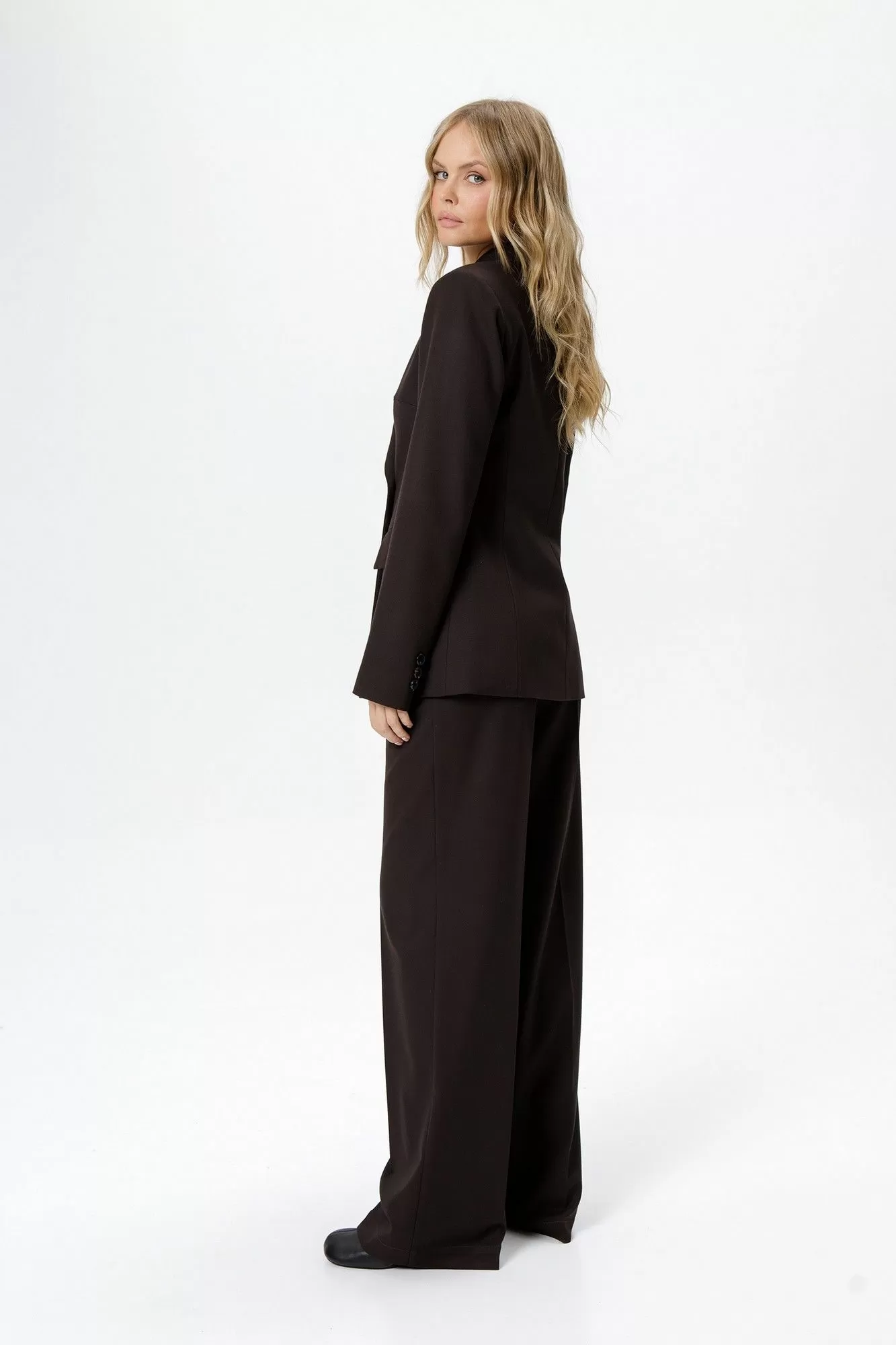 Детали: приталенный силуэт, пиджачный воротник, функциональные карманы, двубортная застежка на петли и пуговицы, спинка со средним швом, втачные двухшовные рукава, жакет на подкладке.
