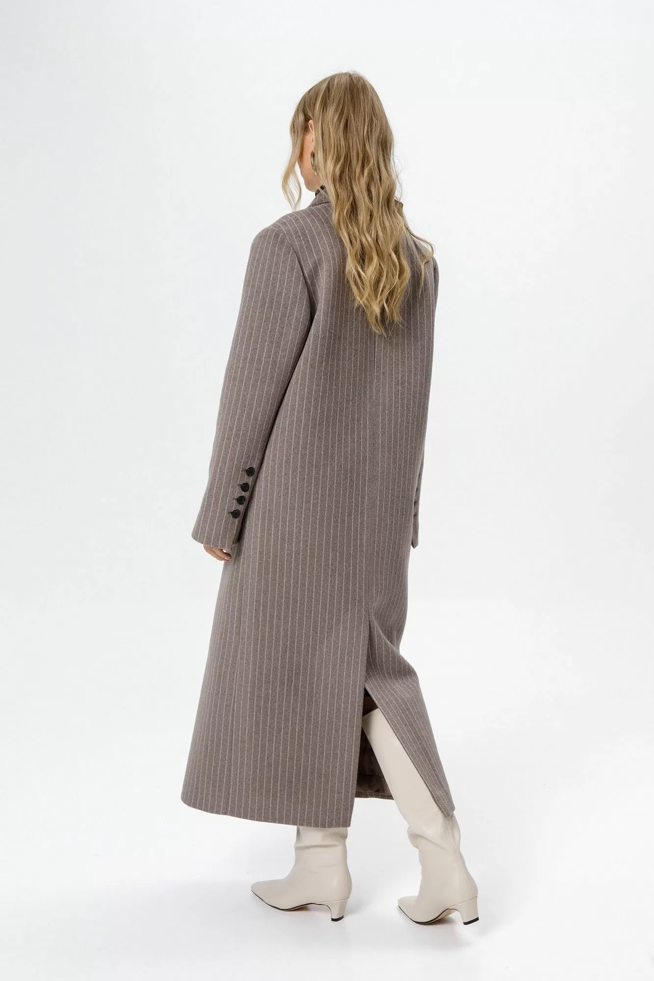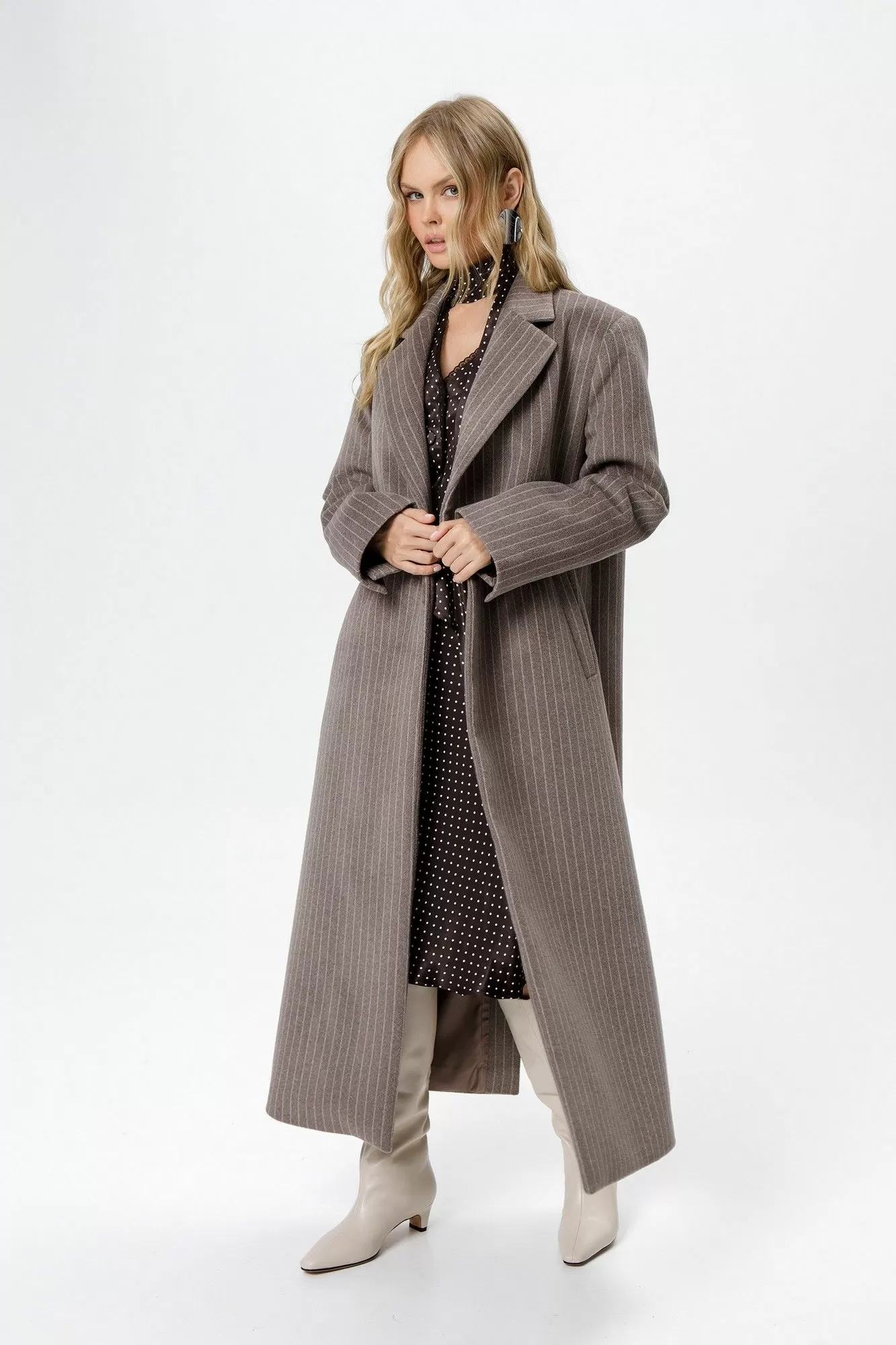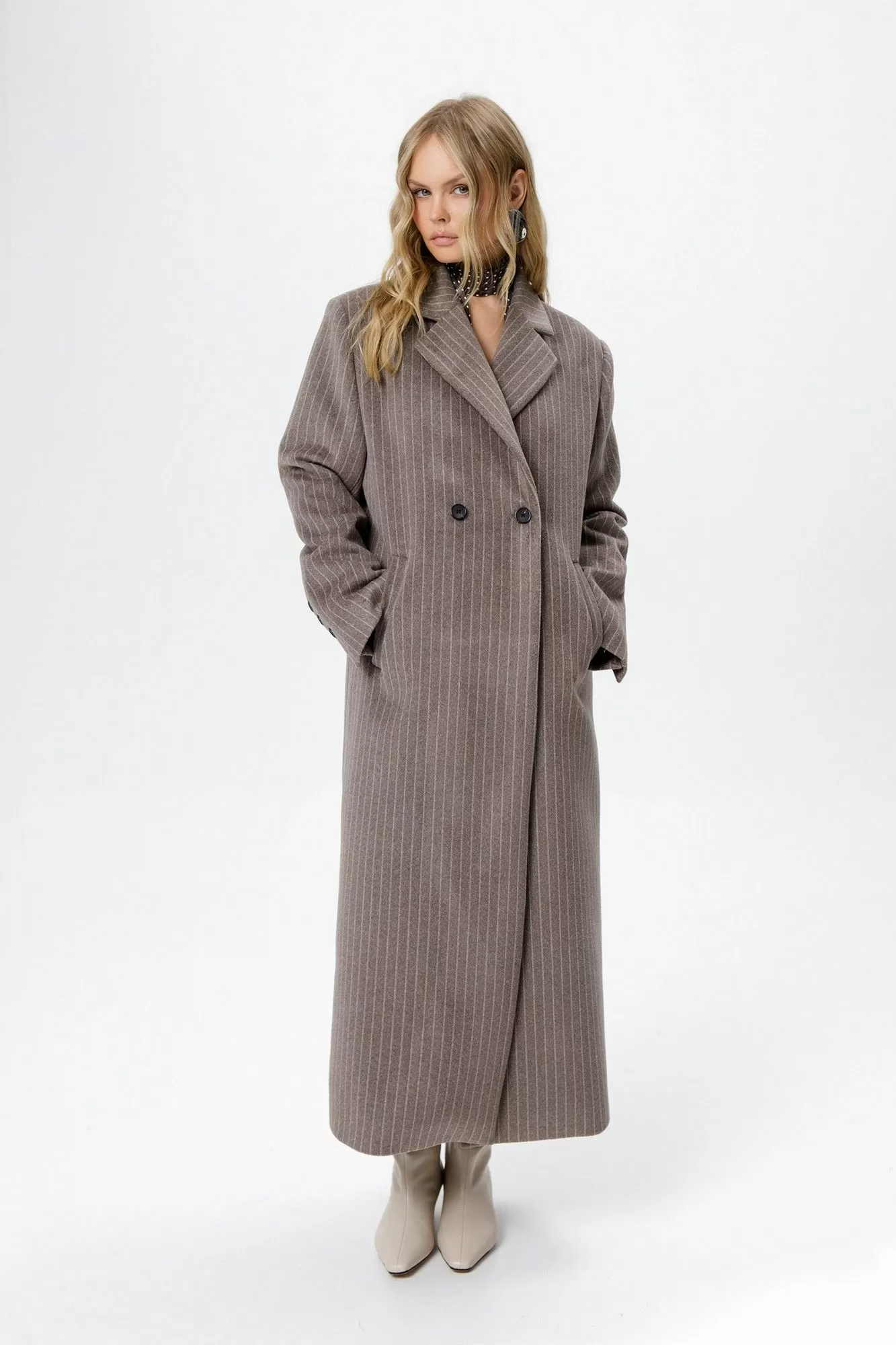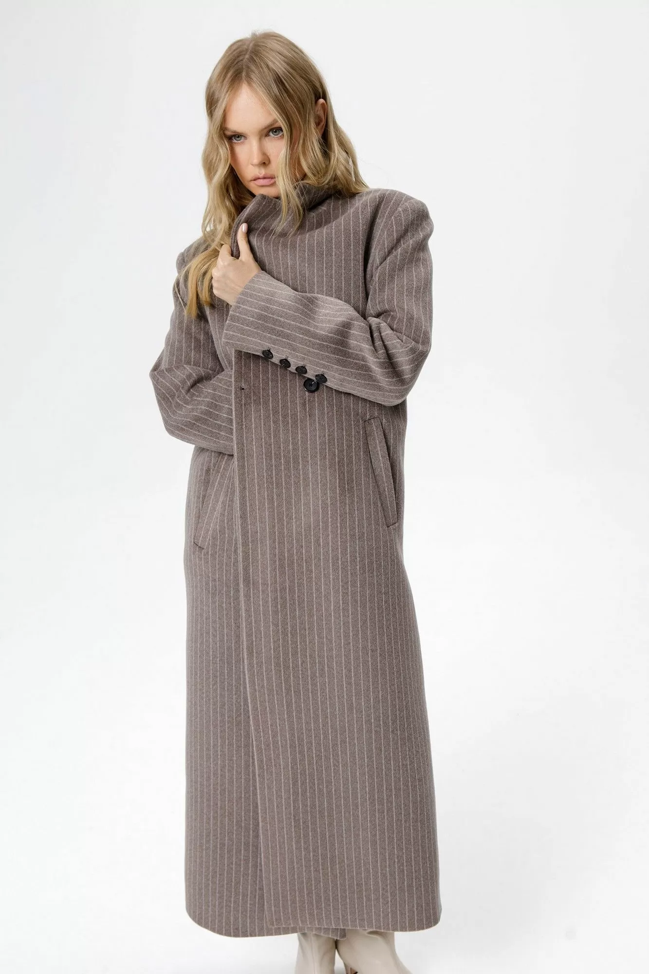 Детали: прямой силуэт, свободный покрой, расширенная линия плеч, пиджачный воротник, двубортная застежка на петли и пуговицы, рукава втачные со шлицей, функциональные карманы, спинка со средним швом и высокой шлицей, пальто на подкладке.