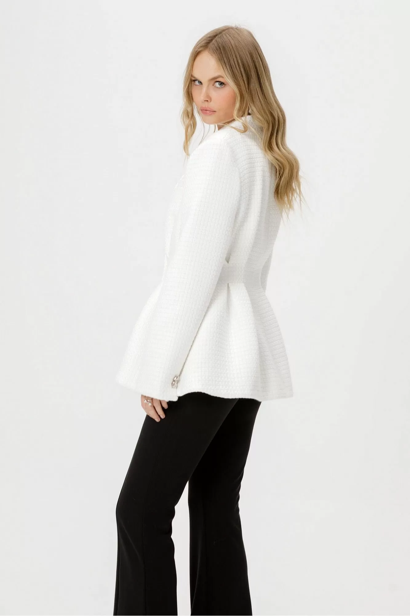 Комплект-двойка из текстильного приталенного жакета со складками и трикотажных облегающих брюк-клеш.