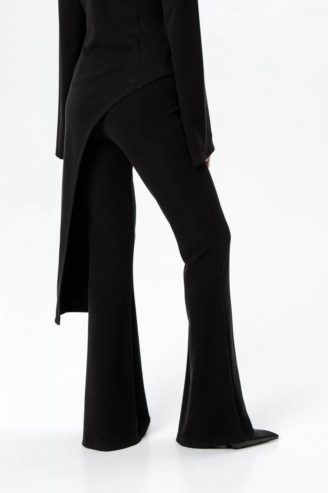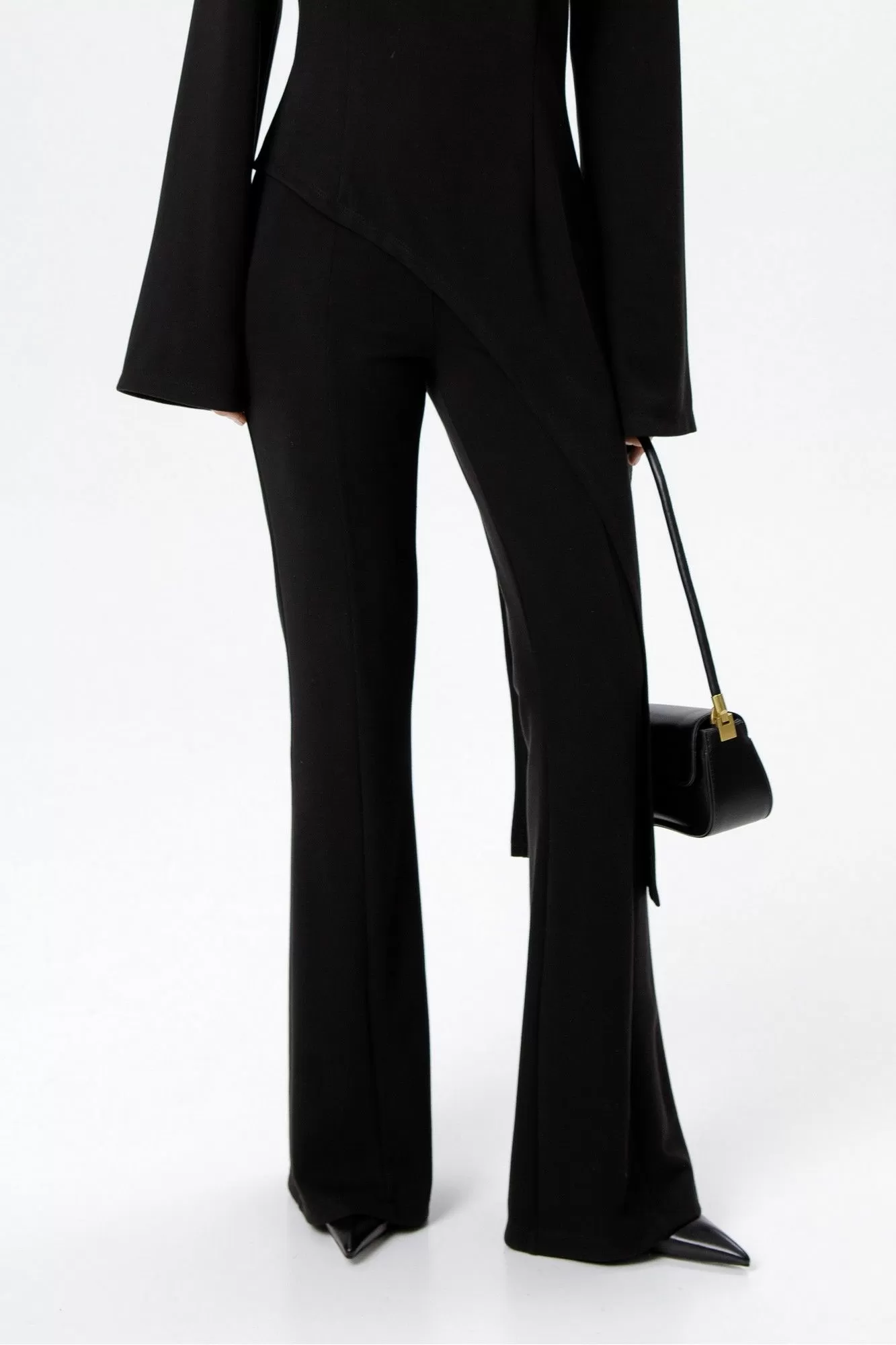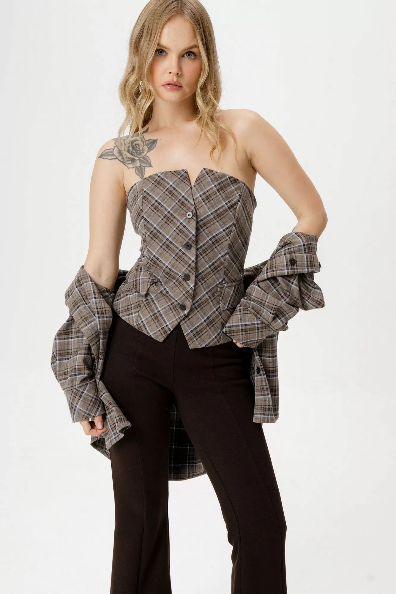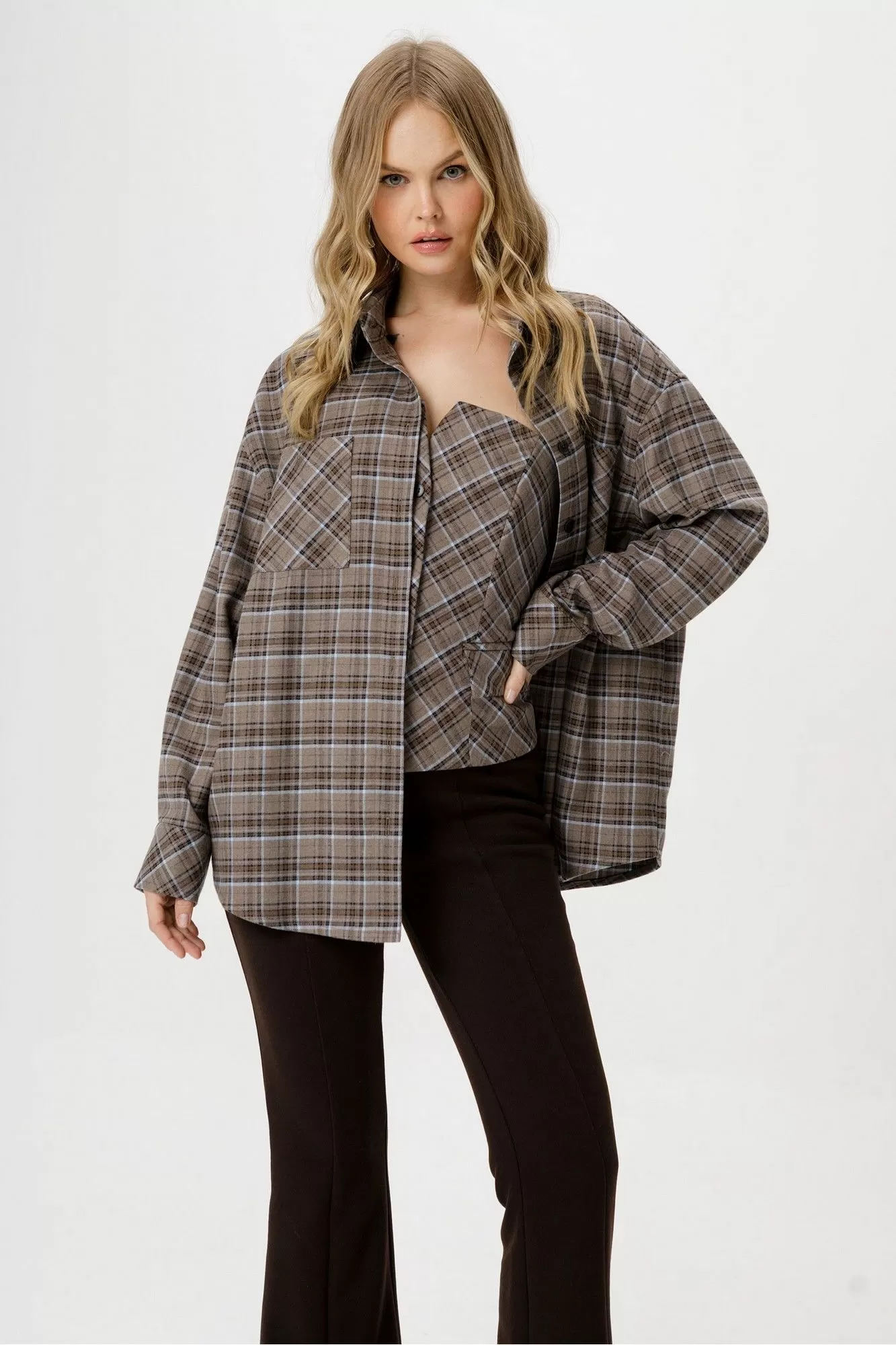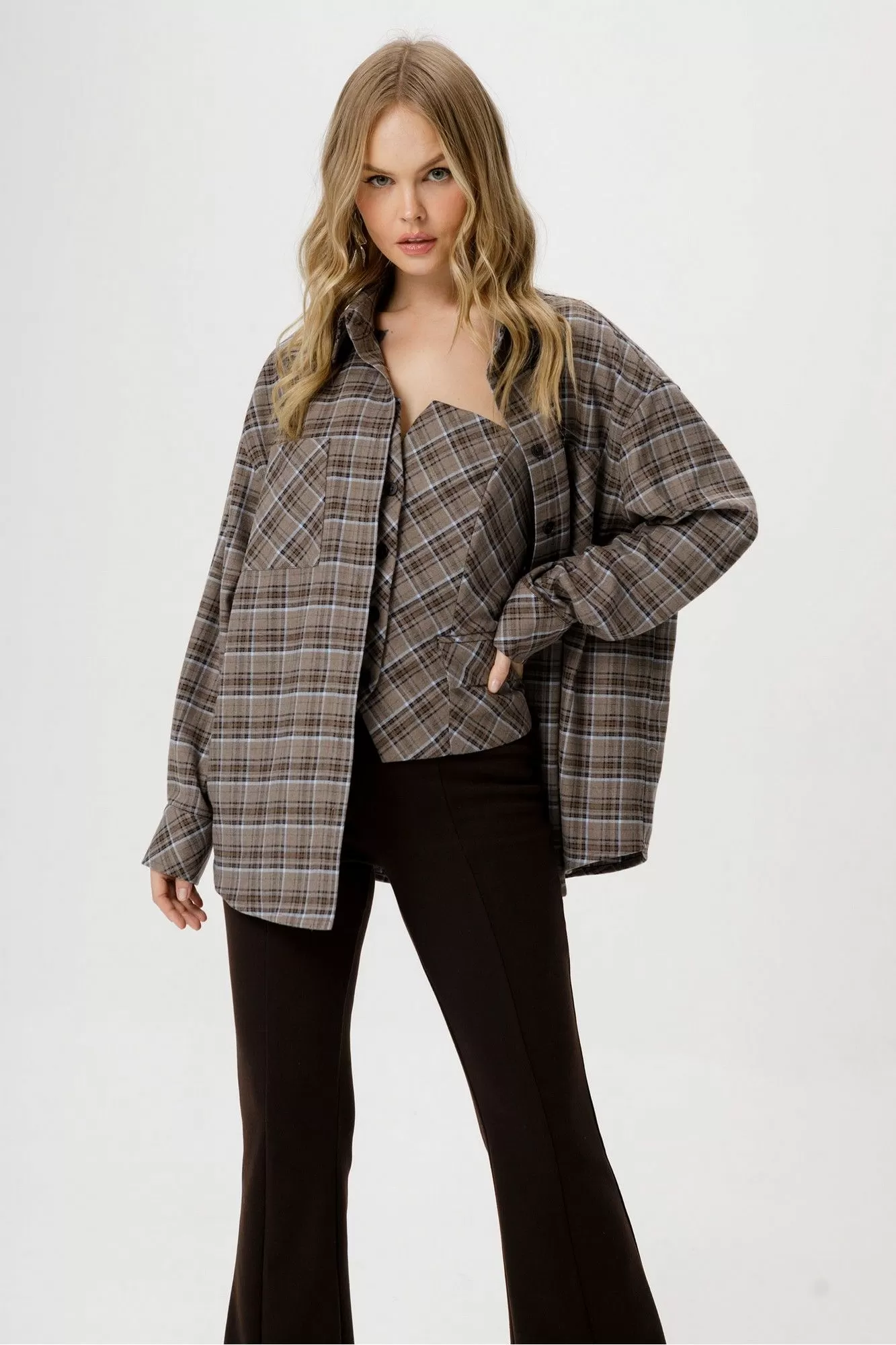 Комплект-тройка из текстильной оверсайз рубашки, топа-корсета в клетку и трикотажных облегающих брюк-клеш.