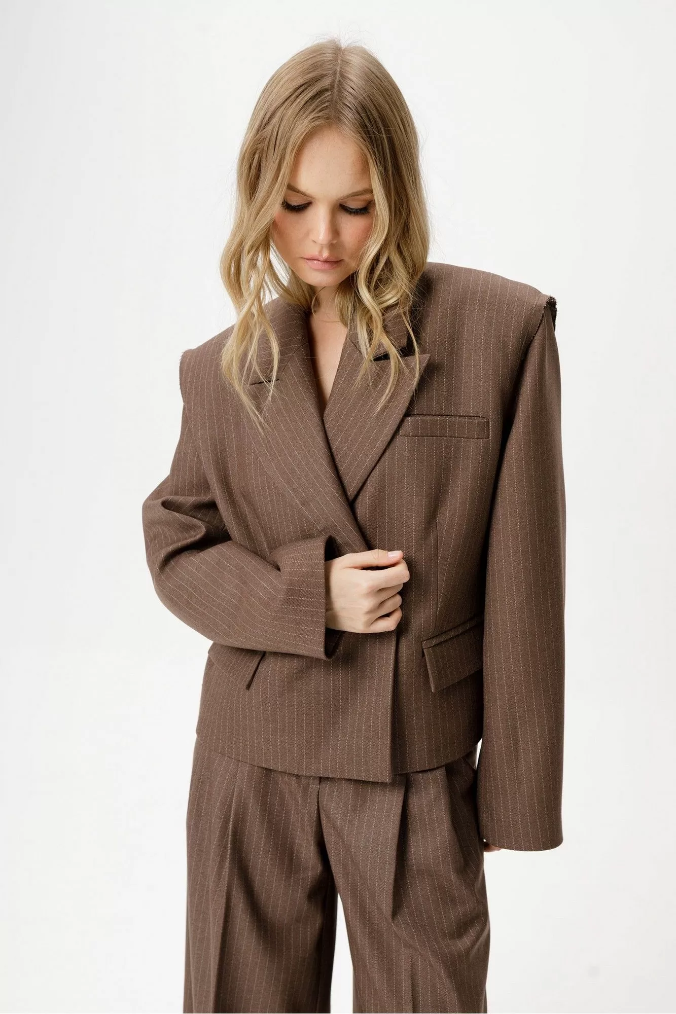 Костюм-тройка из укороченного оверсайз жакета с необработанными проймами, широких брюк-палаццо и съемной юбки-баски килт из текстильной ткани в полоску.