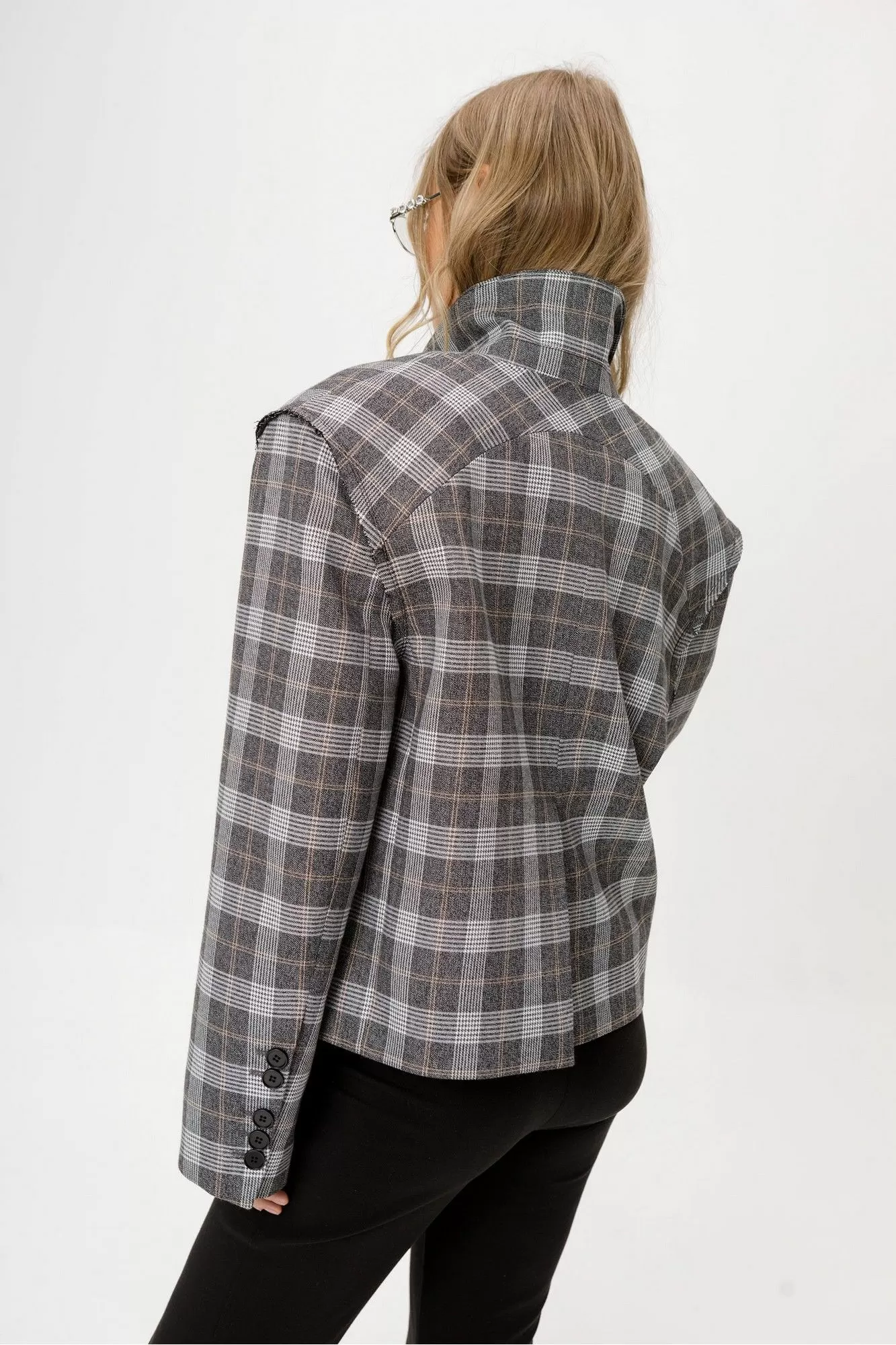 Комплект-тройка из укороченного оверсайз жакета в клетку с необработанными проймами, трикотажных облегающих брюк-клеш и юбки-баски килт.