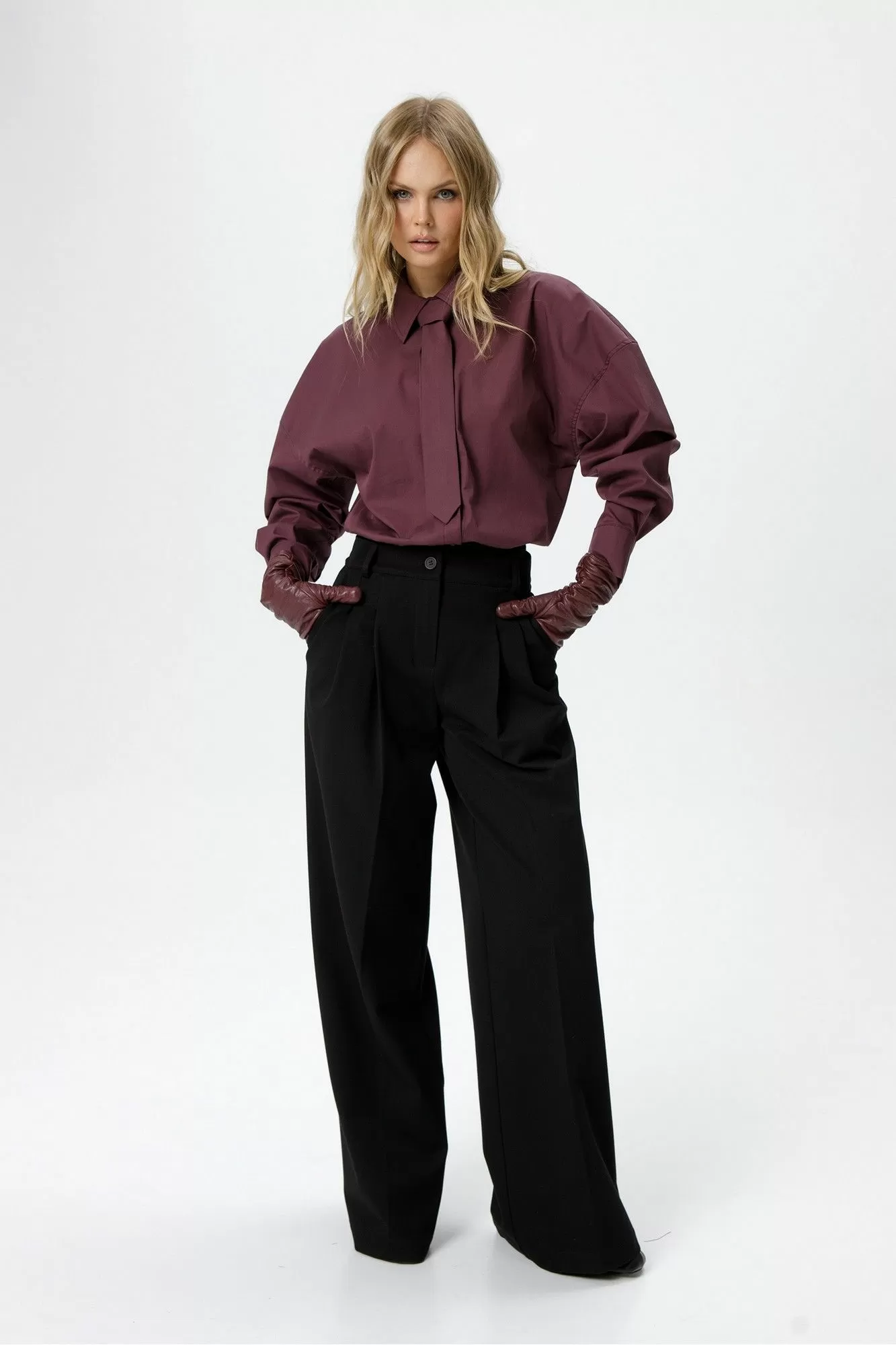 Детали: боди свободного кроя, рубашечный воротник, застежка на петли и пуговицы, съемный галстук в комплекте. Брюки с притачным поясом со шлевками, складки у пояса, застежка на молнию и пуговицу, боковые карманы, заутюженные стрелки. Задние части брюк с вытачками и имитацией карманов.