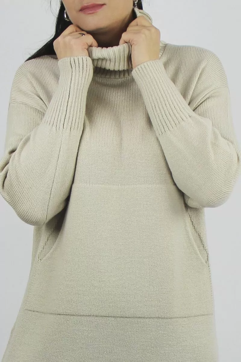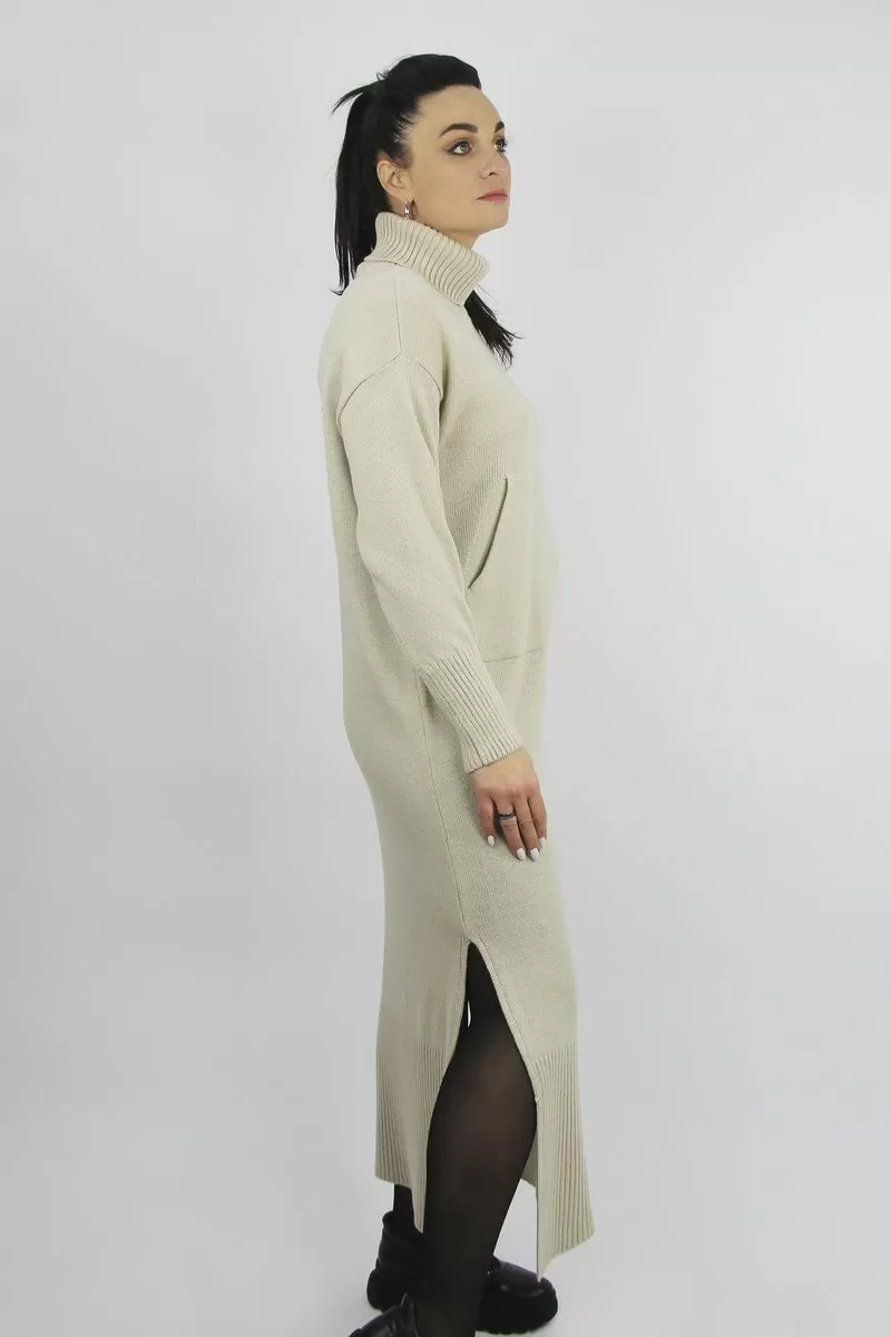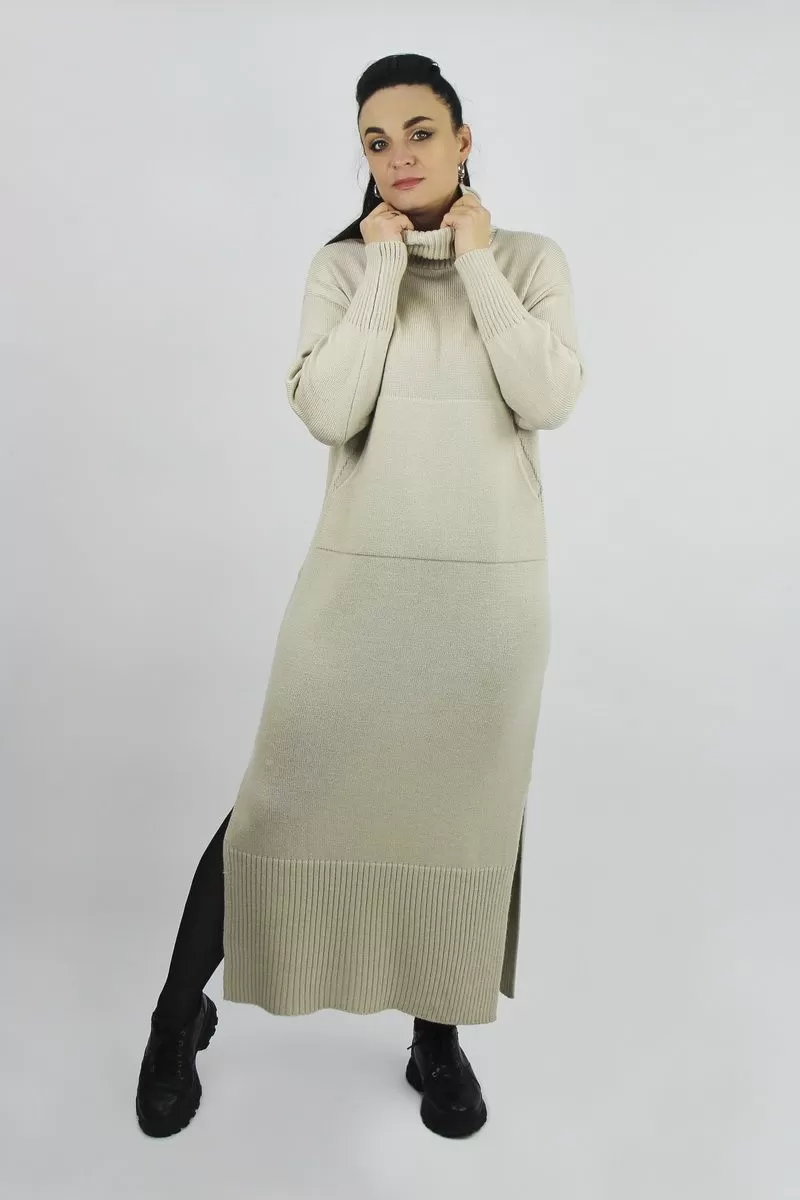 Платье женское второго слоя одежды,с боковыми разрезами , длина миди. Со спущенной линией плеча. Высота воротника 22+-0,5 см. С целновывязанным карманом "кенгуру".