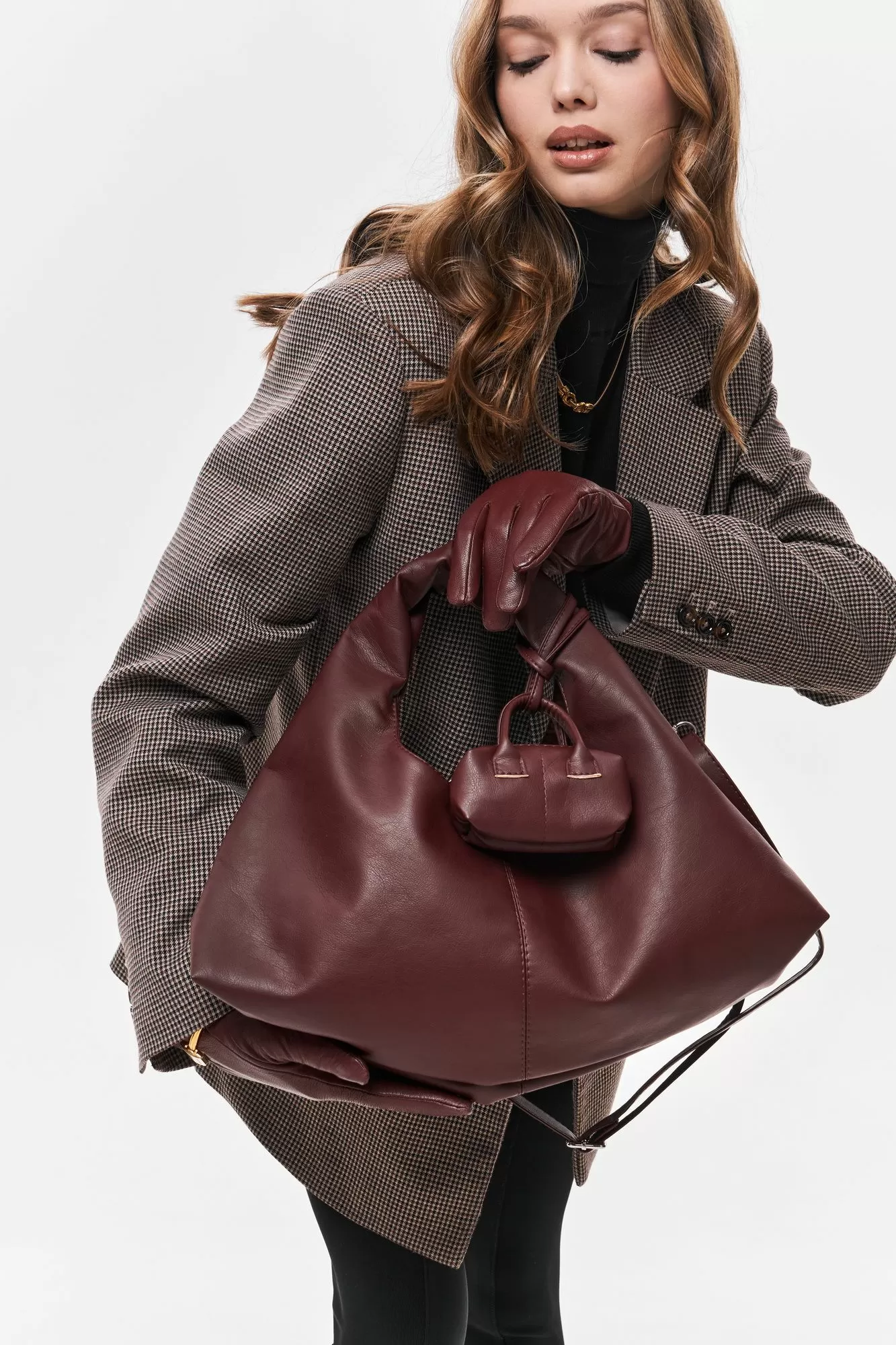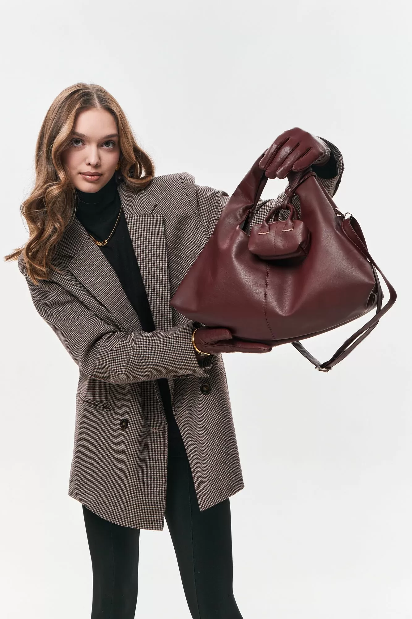 Глубокий оттенок делает модель похожей на бордовую кожаную сумку, но при этом она лёгкая и износостойкая.