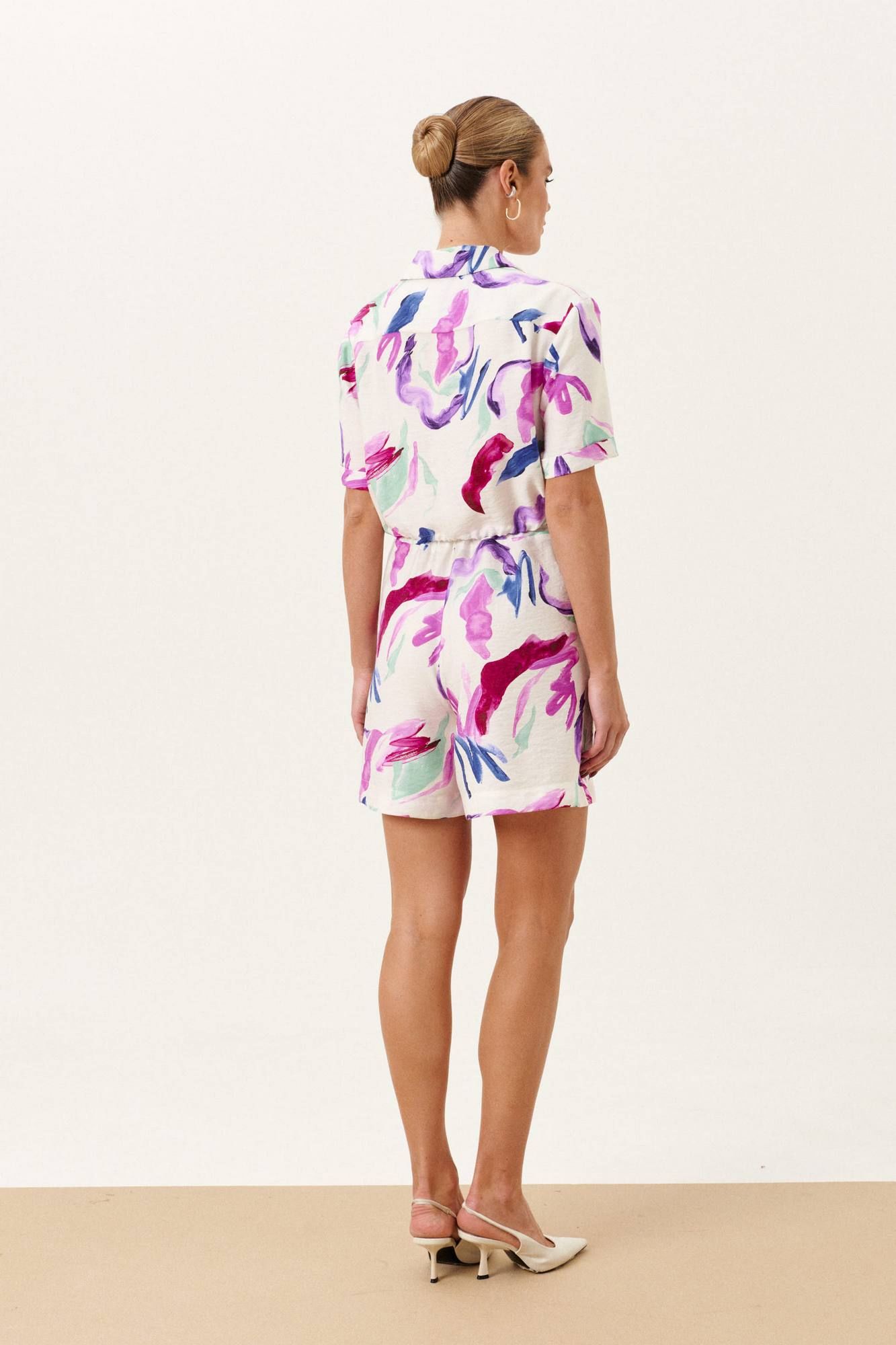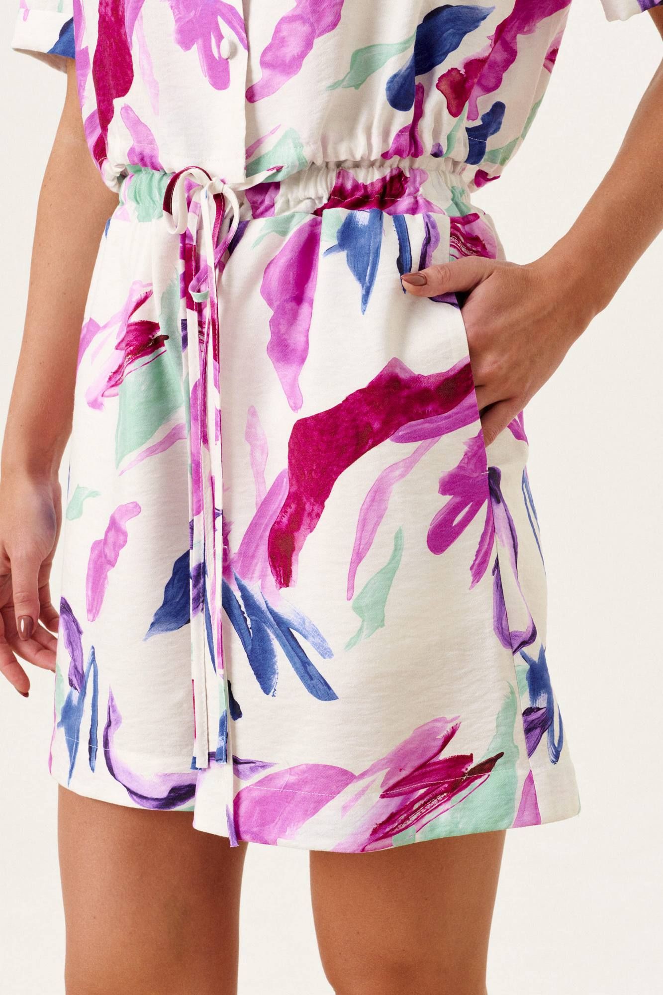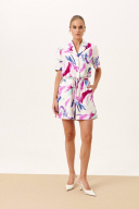Укороченная блузка прямого силуэта, однобортный с застежкой на навесные петли и пуговицы. По переду настрочены накладные карманы с клапаном.Воротник рубашечного типа. Спинка с отрезной кокеткой. Ракав втачной короткий с отложной манжетой. По низу кулиска из основной ткани. Льняные шорты на притачном поясе с резинкой. По бокам накладные карманы.