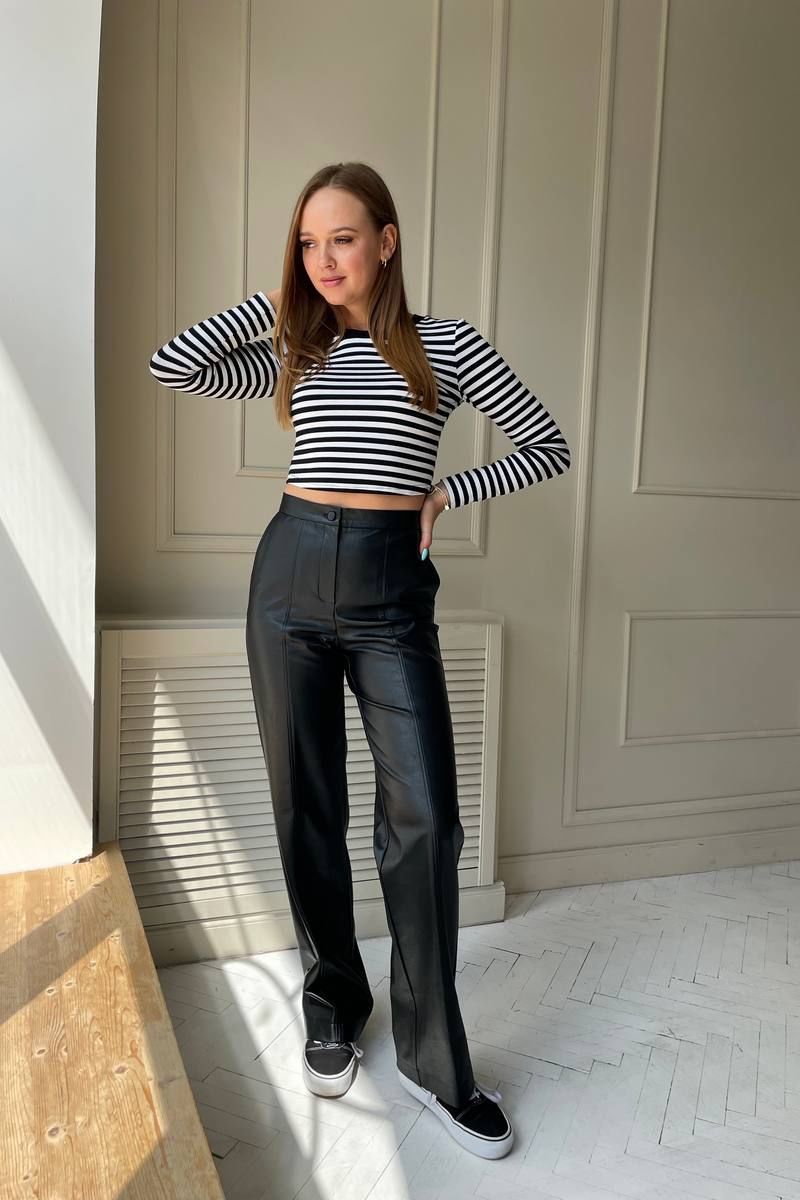 Комплект двойка: топ и брюки. Брюки прямые, из мягкой экокожи, не твердой, не трещит. С изнаночном стороны брюки обработаны хлопковой подкладкой. Длина брюк 119 см. По бокам карманы, застегиваются на молнию и пуговицу спереди, сзади нефункционирующие декоративные карманы. Топ выполнен из трикотажного полотна, трехнитка, средней плотности.