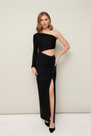 Вечернее платье прилегающего силуэта в длине макси, отрезное по линии талии, выполнено из эластичного полотна бифлекс. Ассиметричный вырез лифа с присборенным боковым швом по левой стороне. По линии талии обработан вырез, переходящий на спинку. Одно плечо открыто. Рукав длинный втачной. Юбка с драпировкой по рельефу, который переходит в высокий разрез по левой стороне.