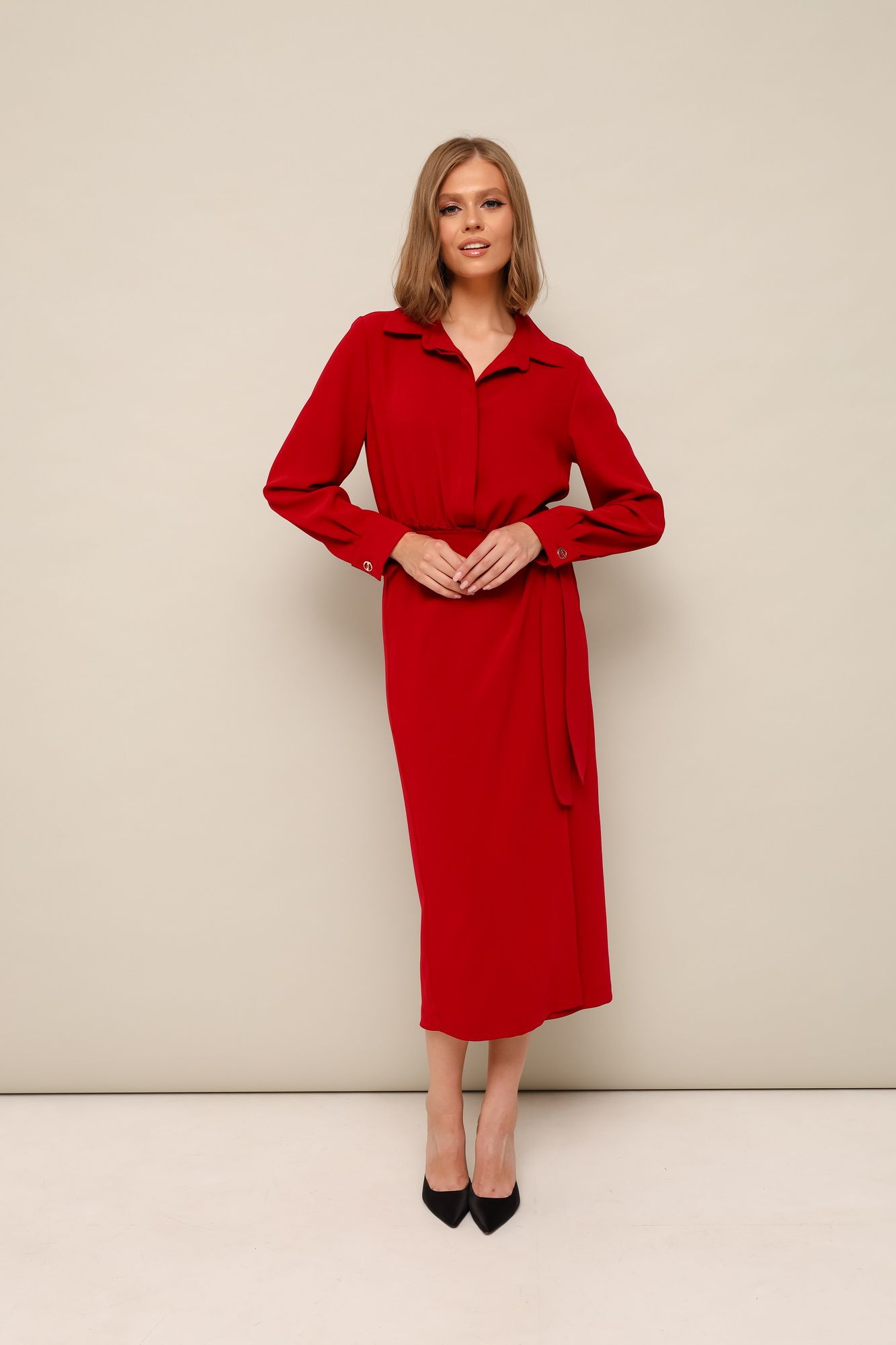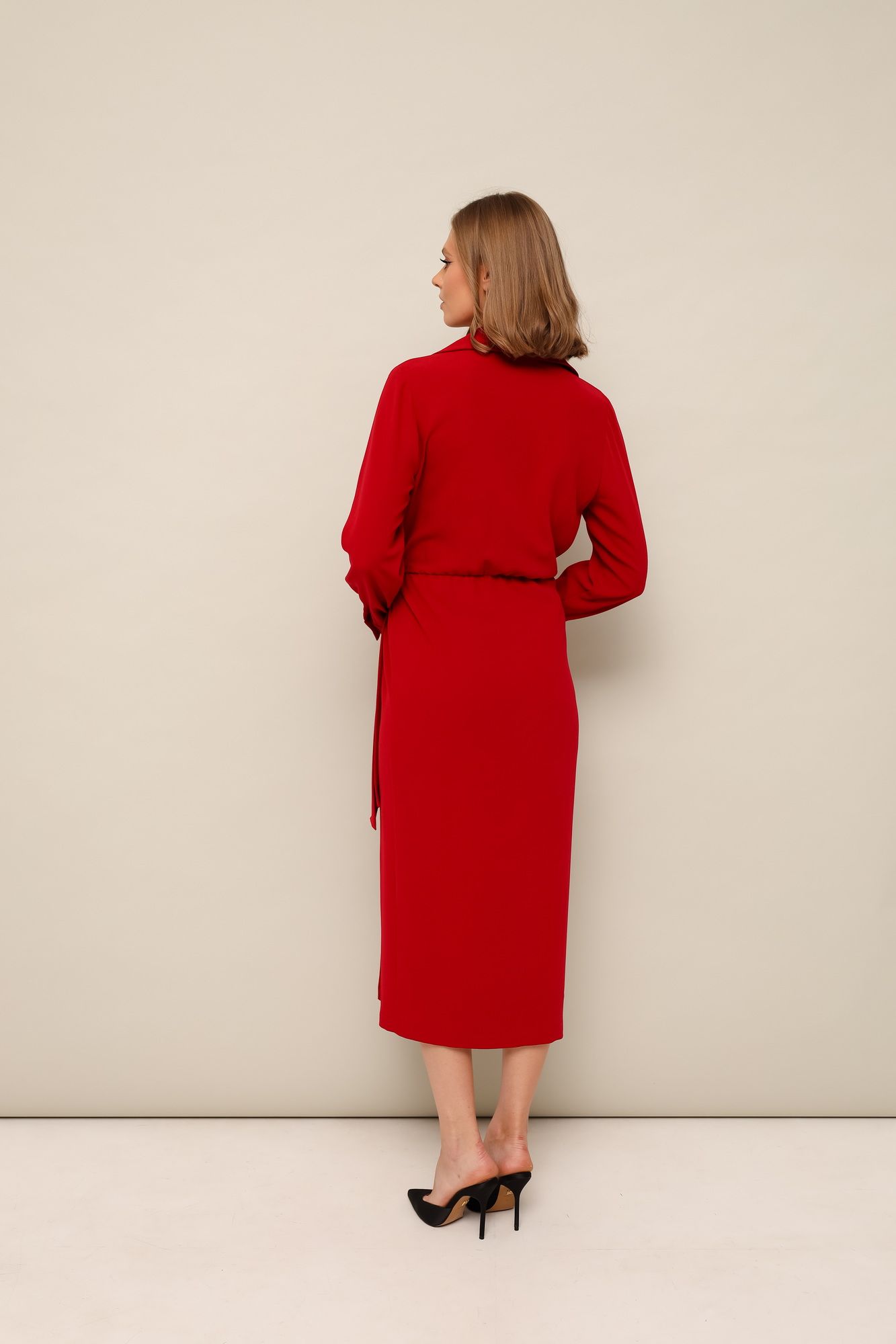 Платье отрезное по линии талии, полуприлегающего кроя, выполнено из плательной струящейся ткани. Горловина с рубашечным воротником на притачной стойке. Лиф с центральной застежкой на потайную планку на петли и пуговицы. По талии обработана резинка для регуляции размера. Юбка с имитацией запаха с застежкой на притачной пояс из основной ткани, который фиксируется на бант. Рукава длинные с притачной манжетой с застежкой на пуговицы.