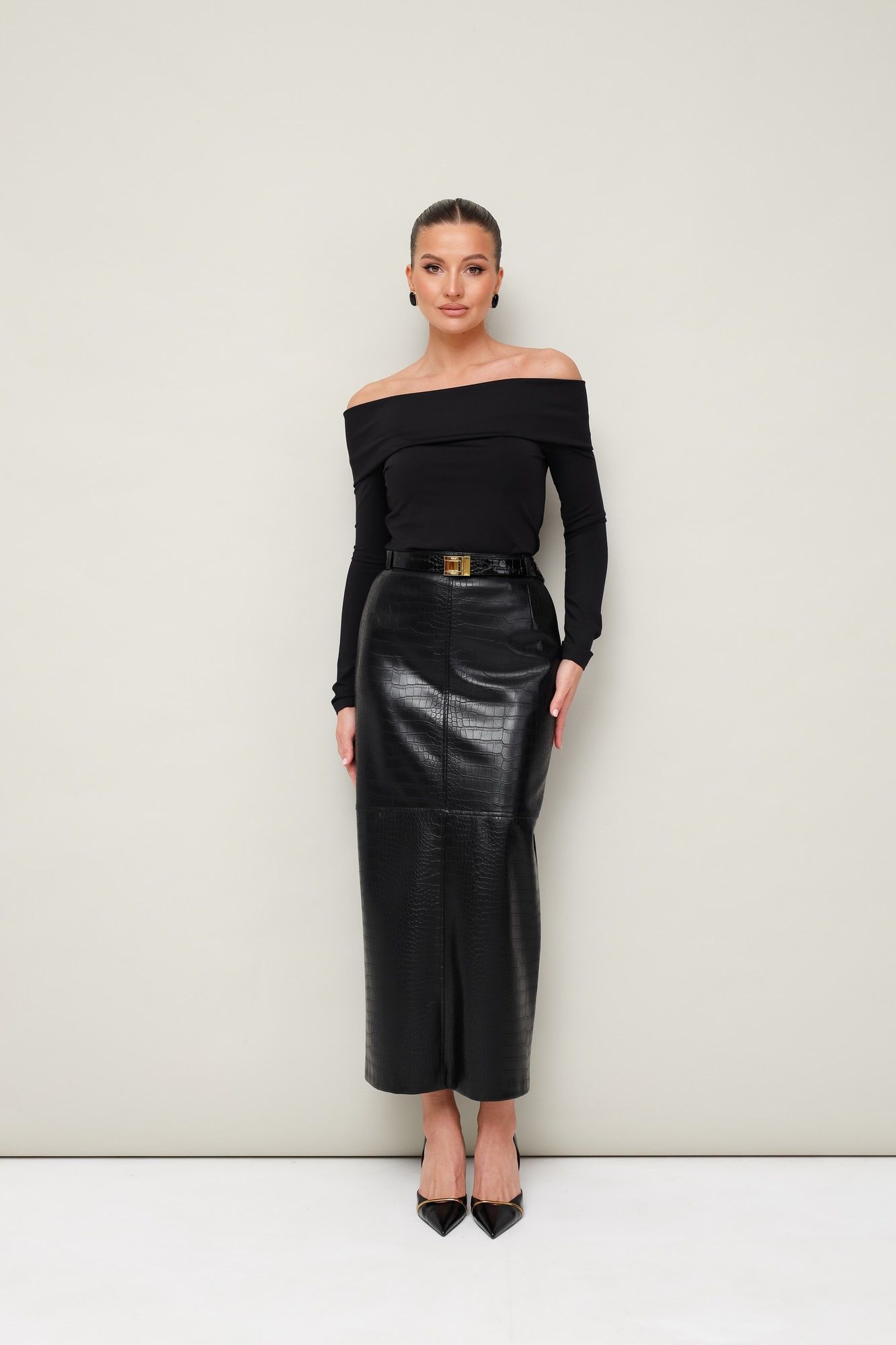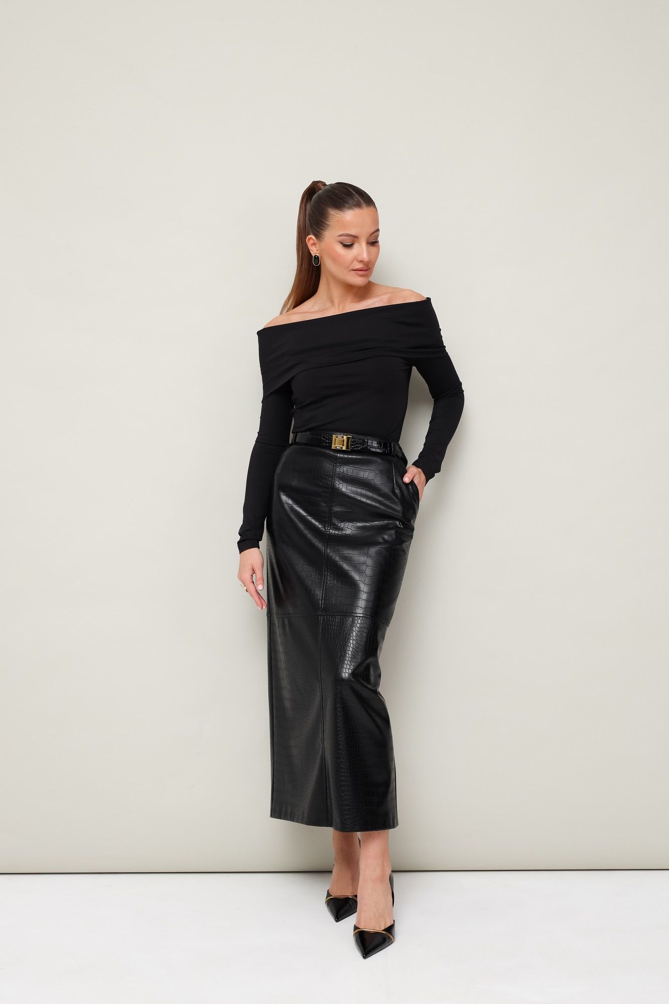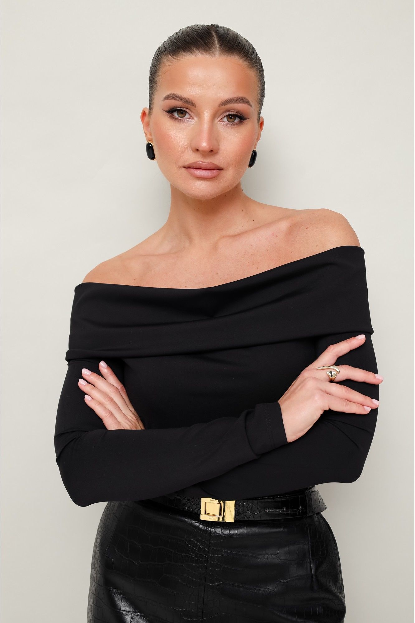 Блуза с открытыми плечами прилегающего силуэта, выполнен из эластичного полотна - бифлекс. По верхнему срезу обработан широкий отворот. Рукава втачные длинные.