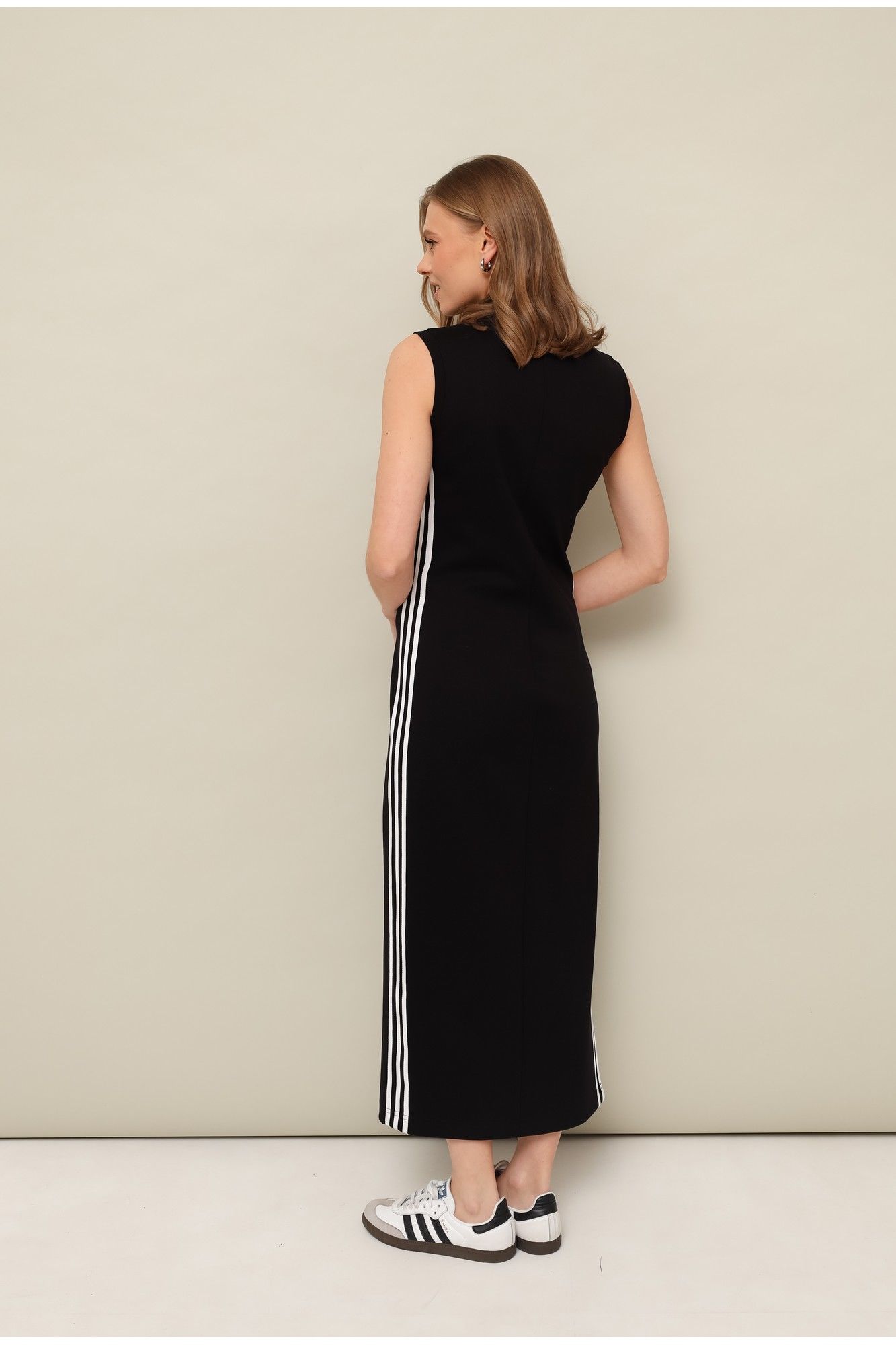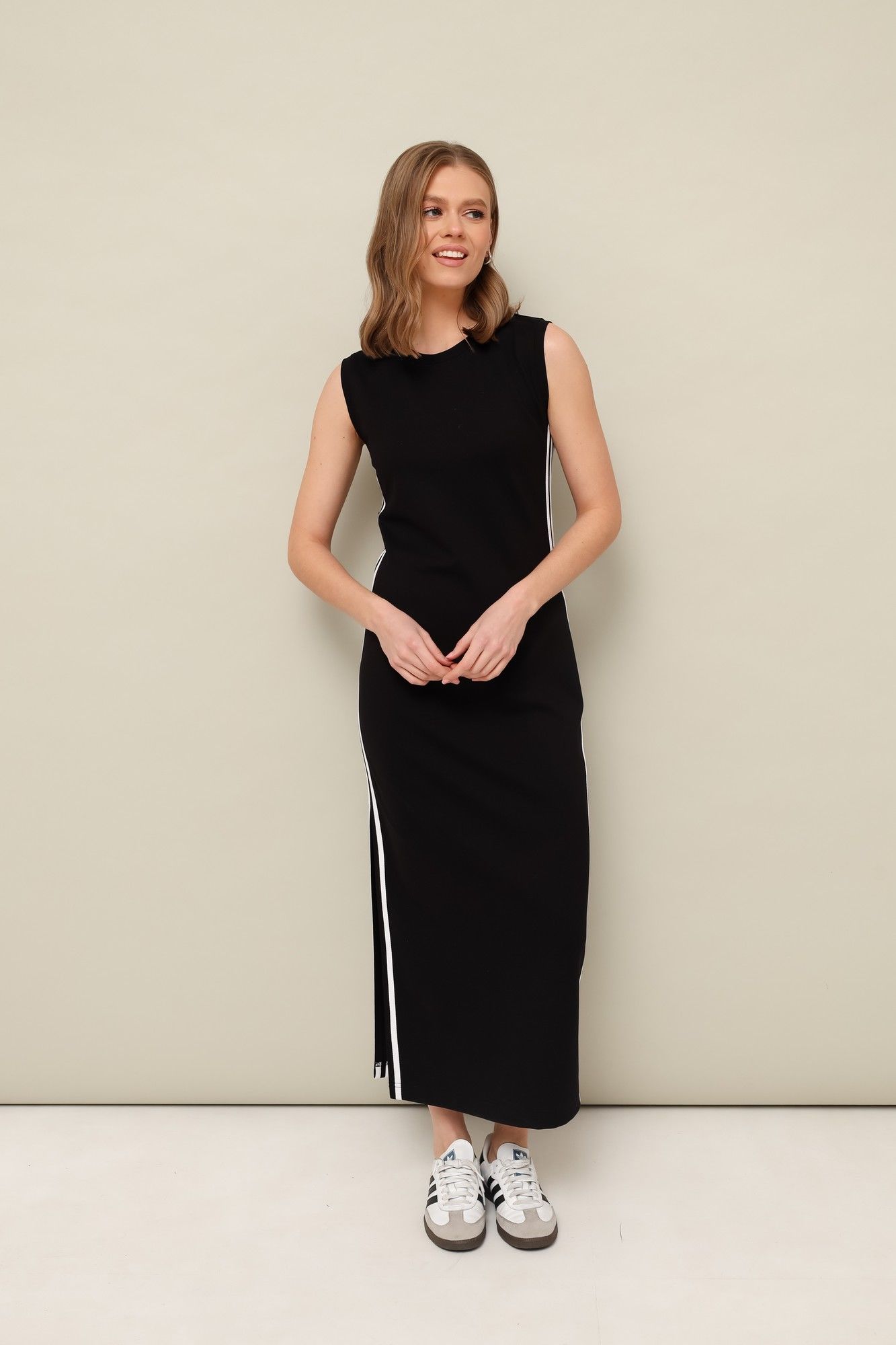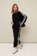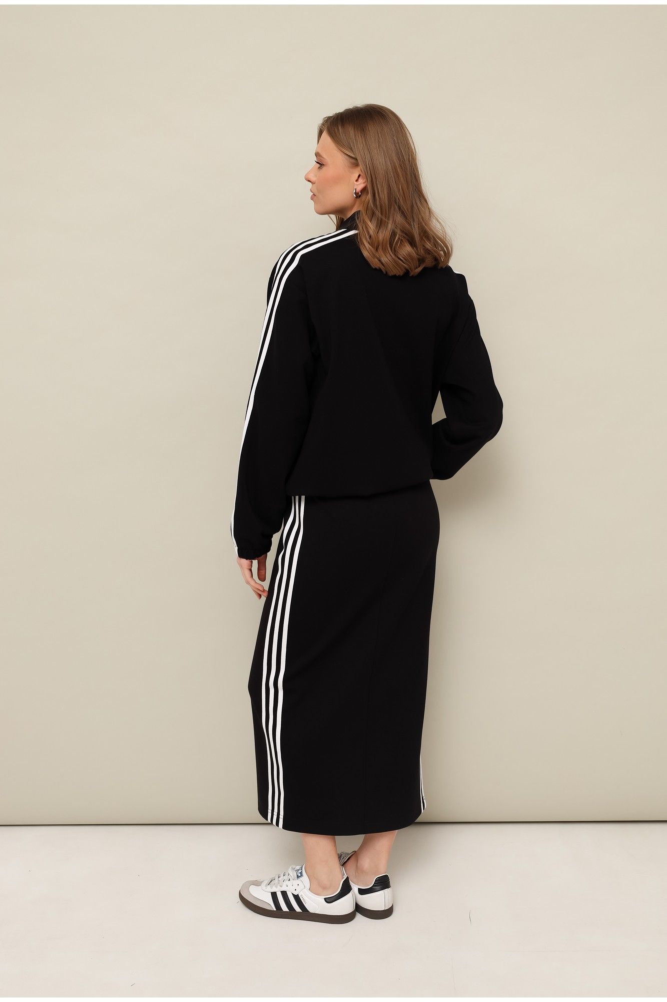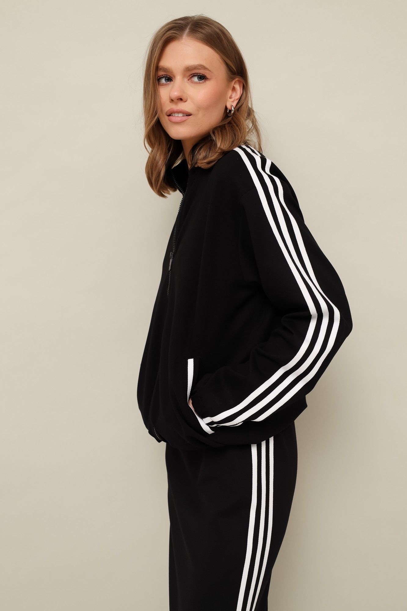 Костюм в стиле спорт-шик, выполнен из качественного трикотажого нейлона. Бомбер свободного кроя. Горловина с воротником-стойкой. Центральная застежка на тесьму-молнию. Спереди обработаны наклонные карманы-листочки. Рукава длинные, со спущенной линией втачивания плеча с манжетой на резинке. Низ бомбера собирается на эластичную тесьму с регулятором для формирования силуэта. Платье полуприлегающего силуэта в длине миди. Округлый вырез горловины. В боковом шве обработан высокий разрез. По плечевому шву, рукавам, карманам бомбера и боковым швам платья настрочен декоративный элемент в виде хлопковой тесьмы контрастного цвета.