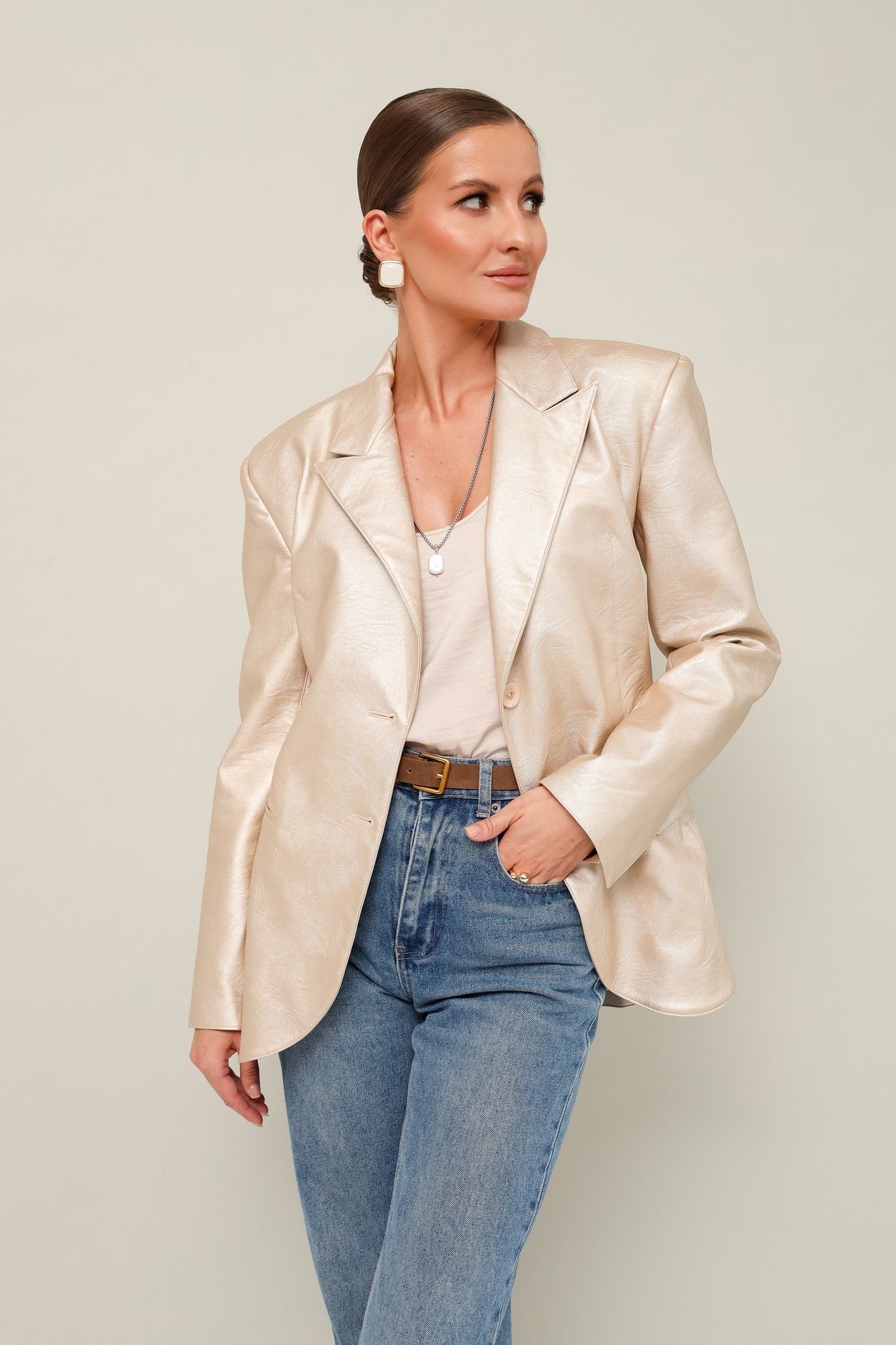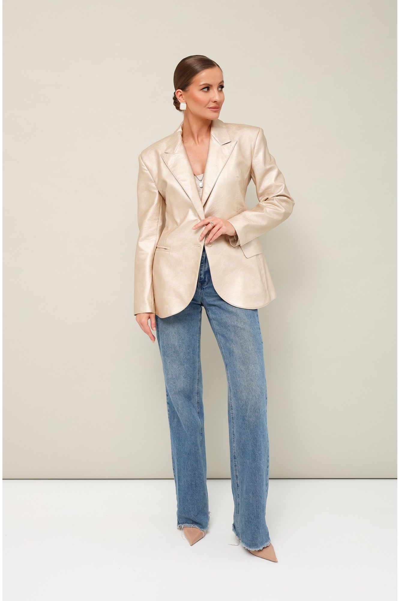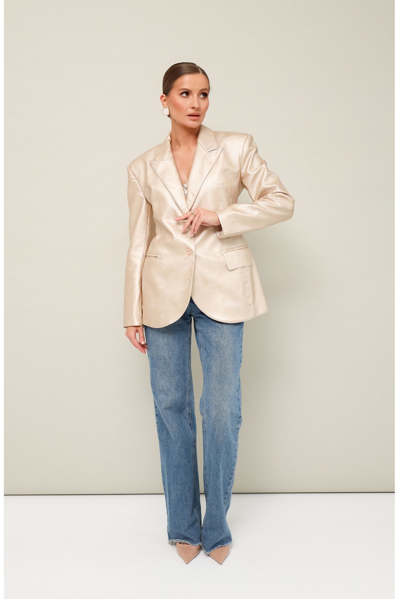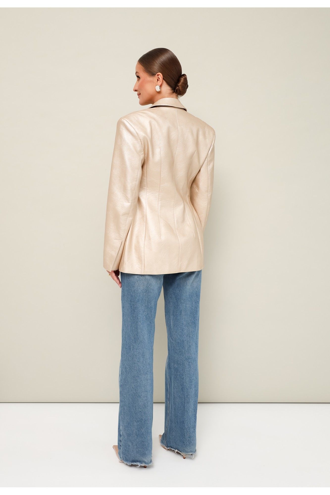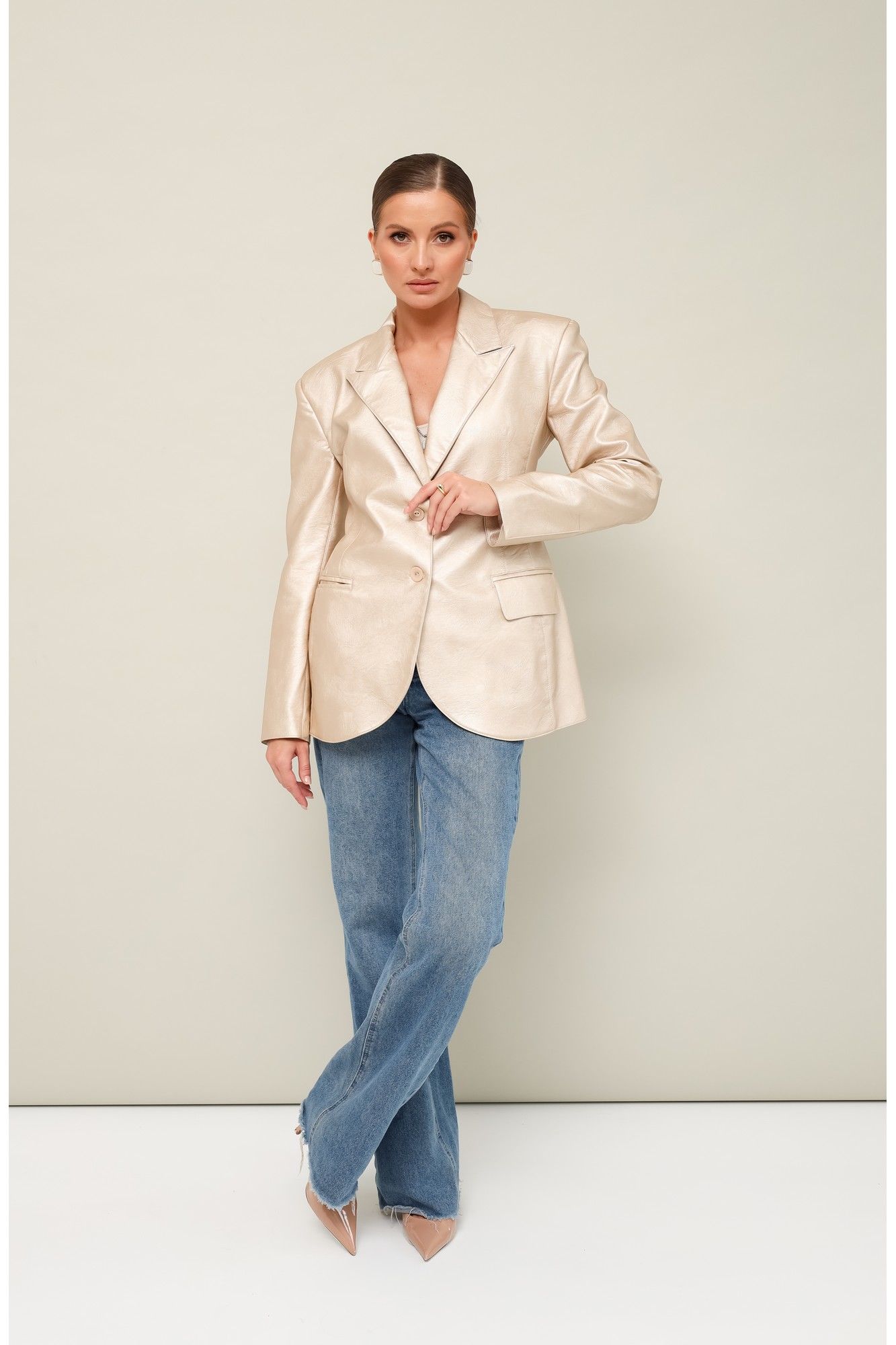 Силуэтный жакет с подчеркнутой линией талии, в ыполнен из качественной матовой экокожи в золотистом оттенке. Центральная застежка на петли и пуговицы. Воротник пиджачного типа с отложными лацканами, край борта скругленный по низу жакета. Спереди обработаны прорезные карманы в рамку с клапанами. Рукава втачные, двухшовные со шлицами. Спинка с рельефами и средним швом. Жакет на подкладке.