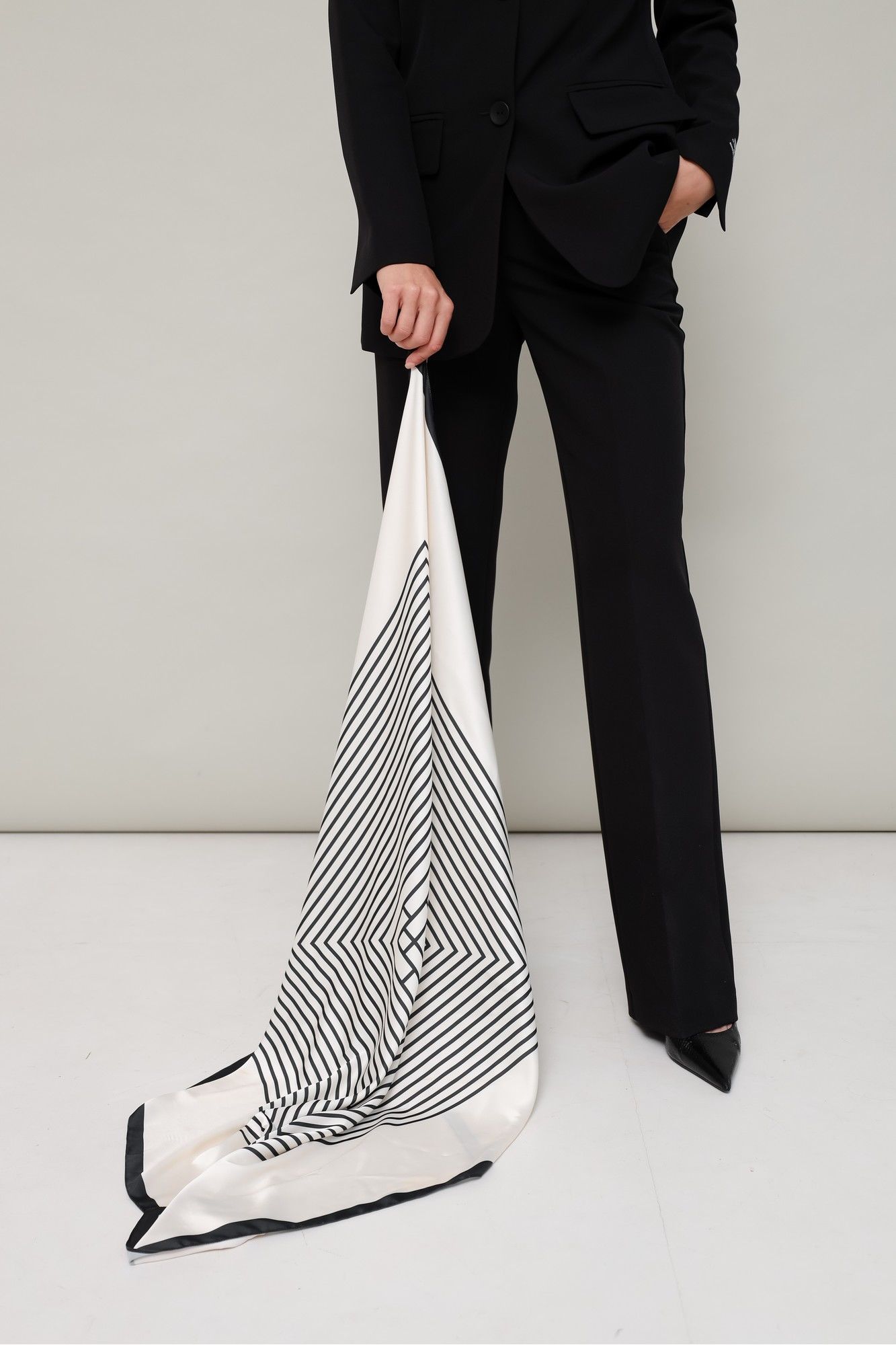 Платок с геометричным принтом. Выполнен из струящейся ткани с благородным матовым блеском. Вариант стилизации: аксессуар можно носить как пояс, завязав в узел два противоположных угла. Размер: 90*90см.