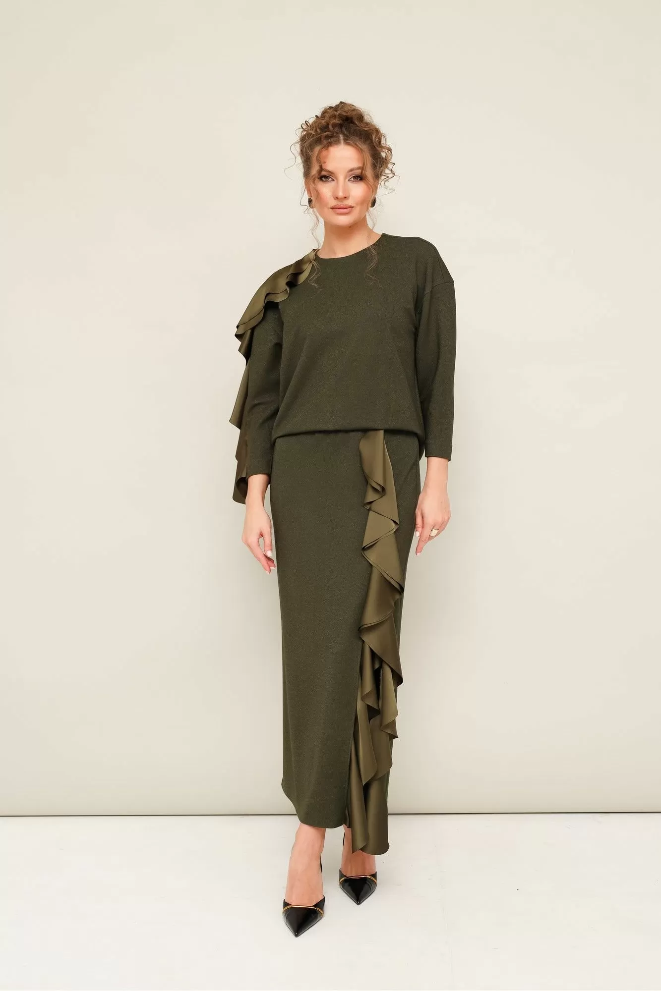 Комплект декорирован двойным сатиновым воланом по плечевому шву, рукаву и по вертикальному подрезу в юбке.
