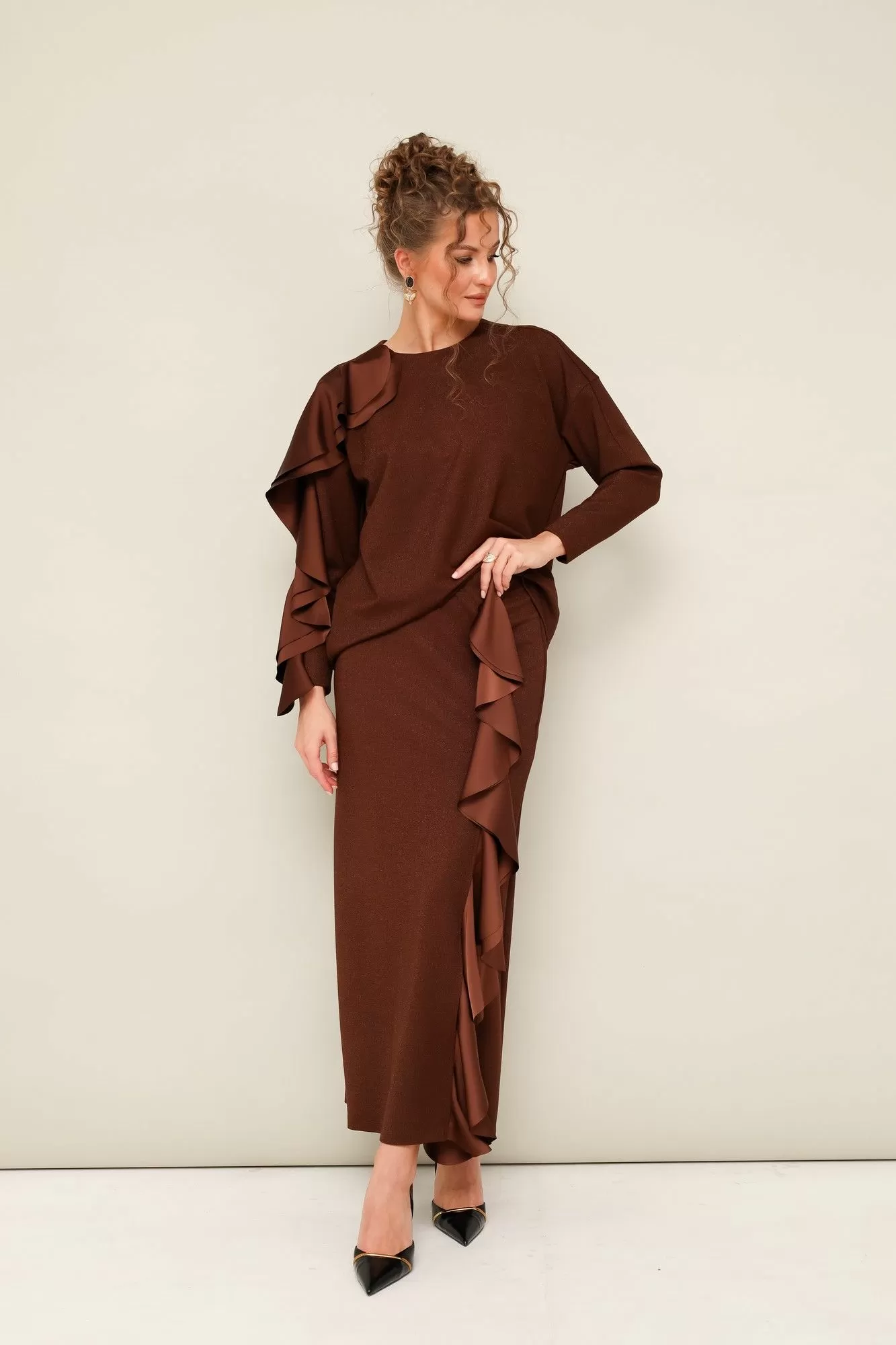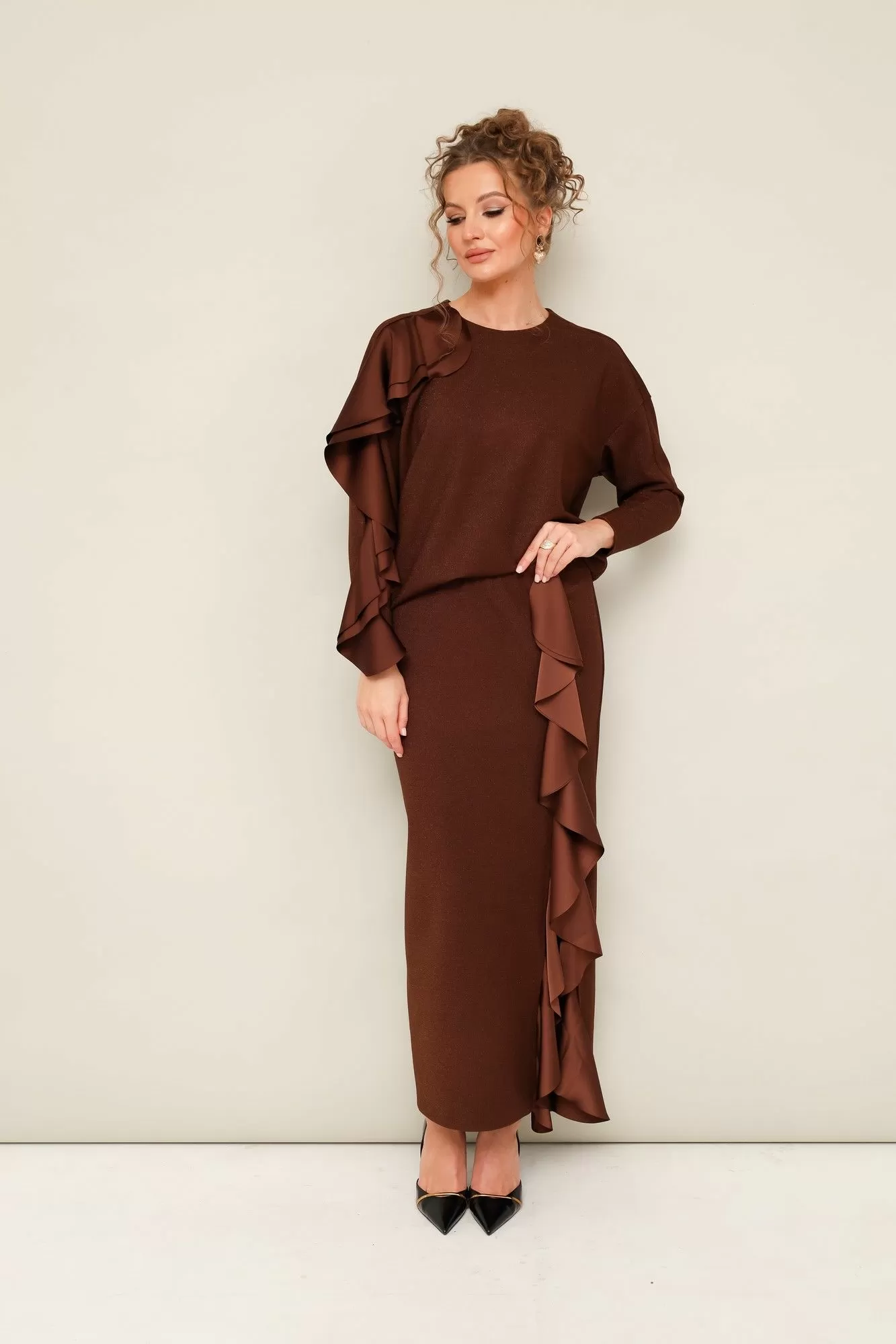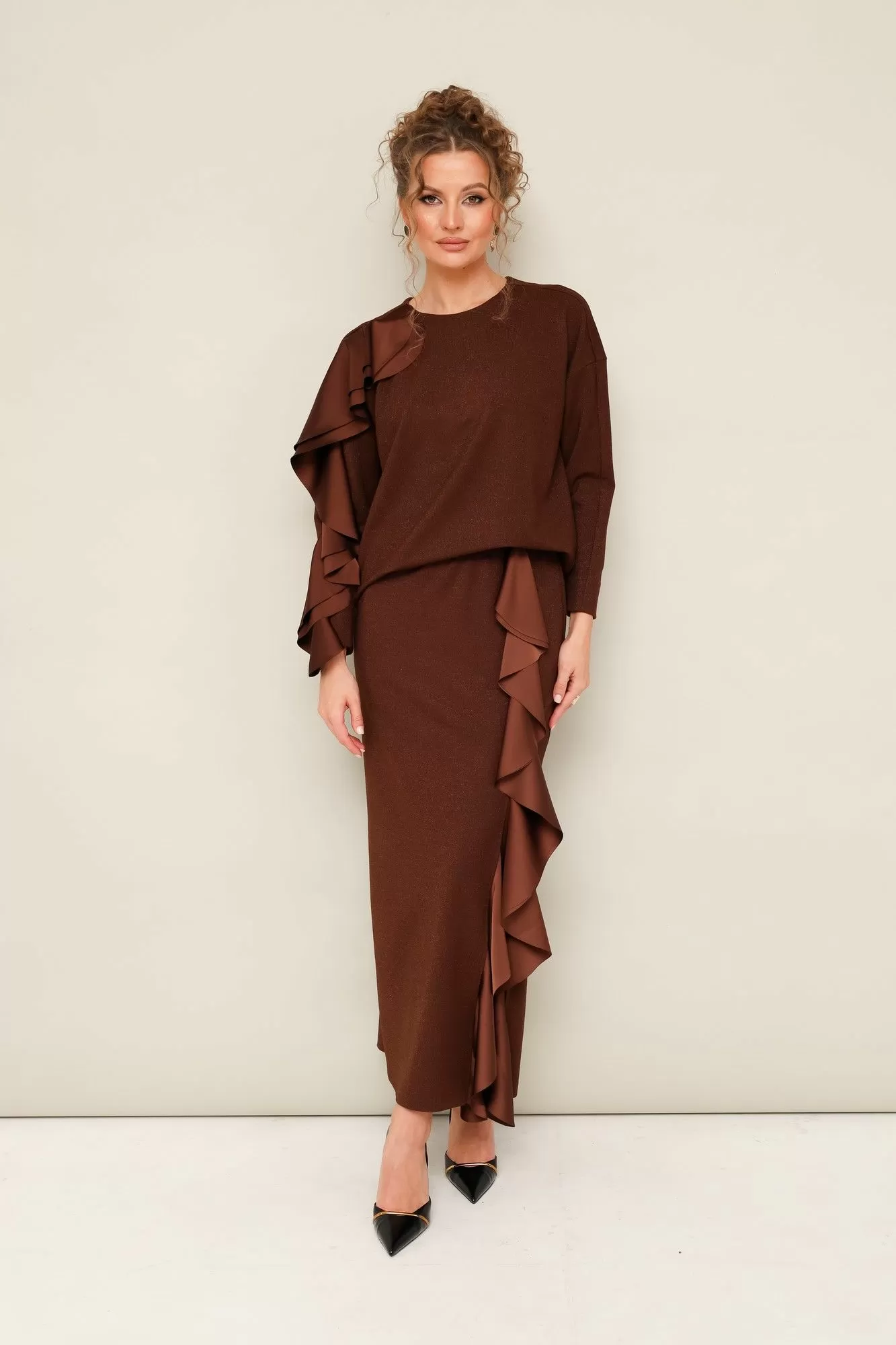 Комплект декорирован двойным сатиновым воланом по плечевому шву, рукаву и по вертикальному подрезу в юбке.