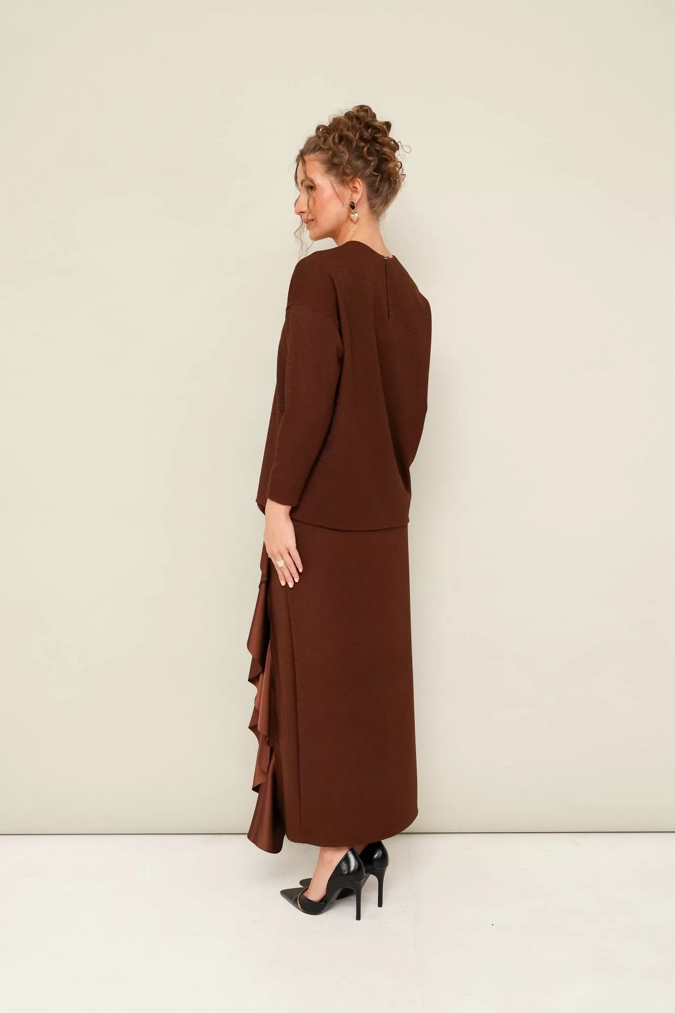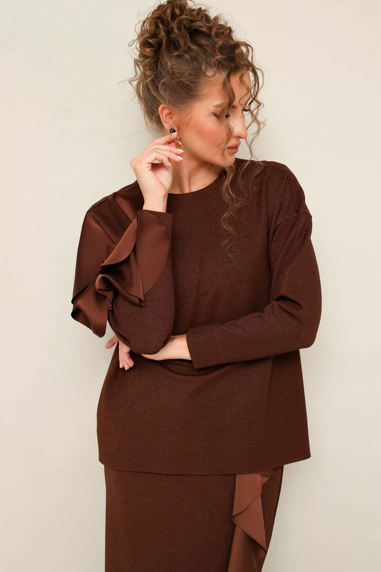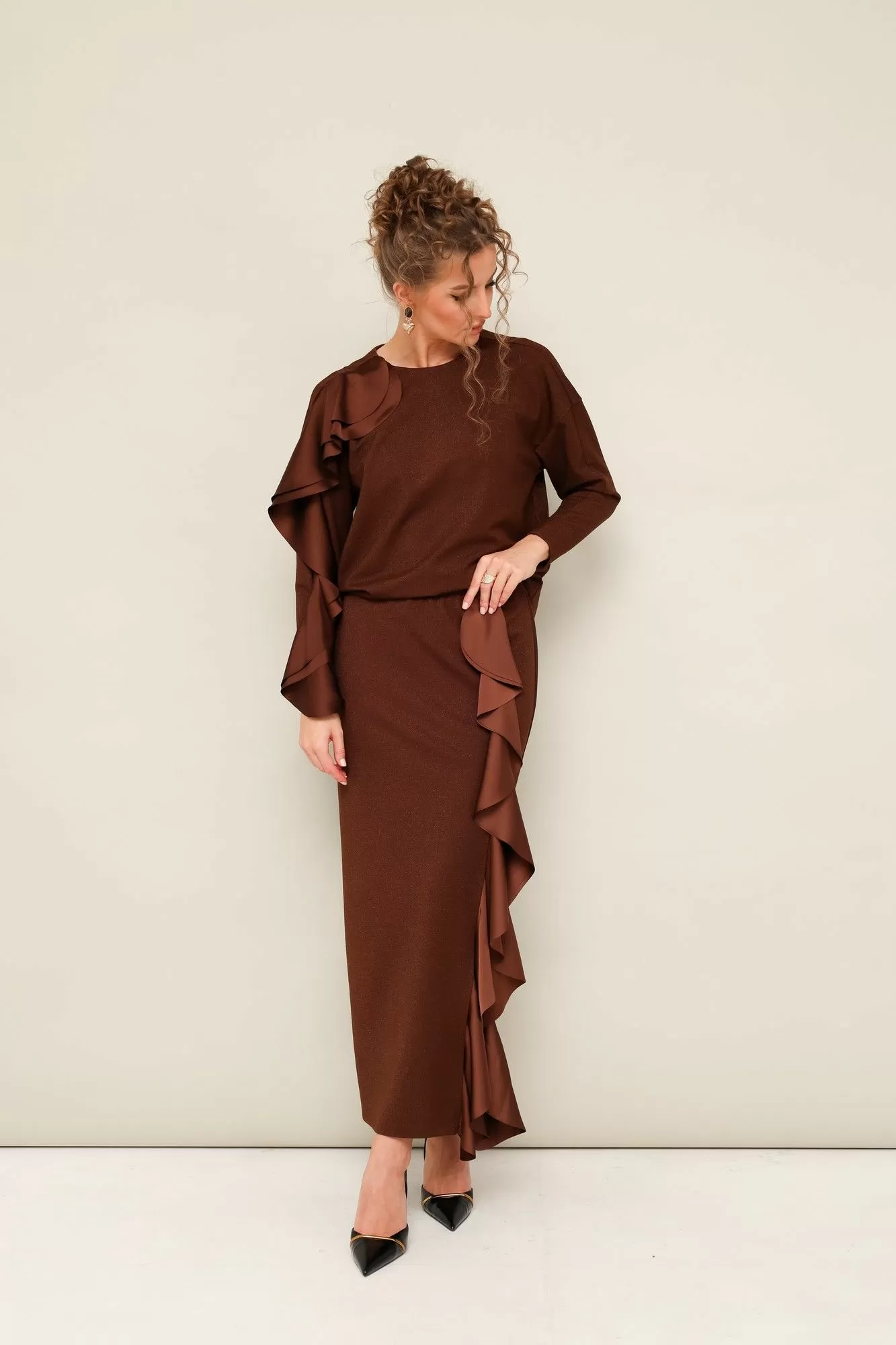Комплект декорирован двойным сатиновым воланом по плечевому шву, рукаву и по вертикальному подрезу в юбке.