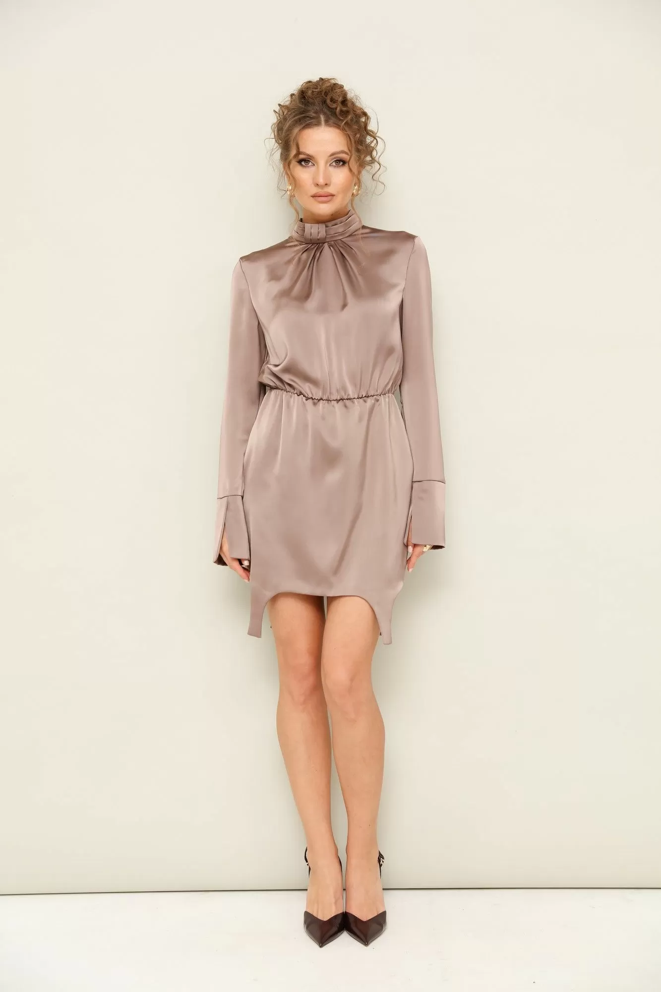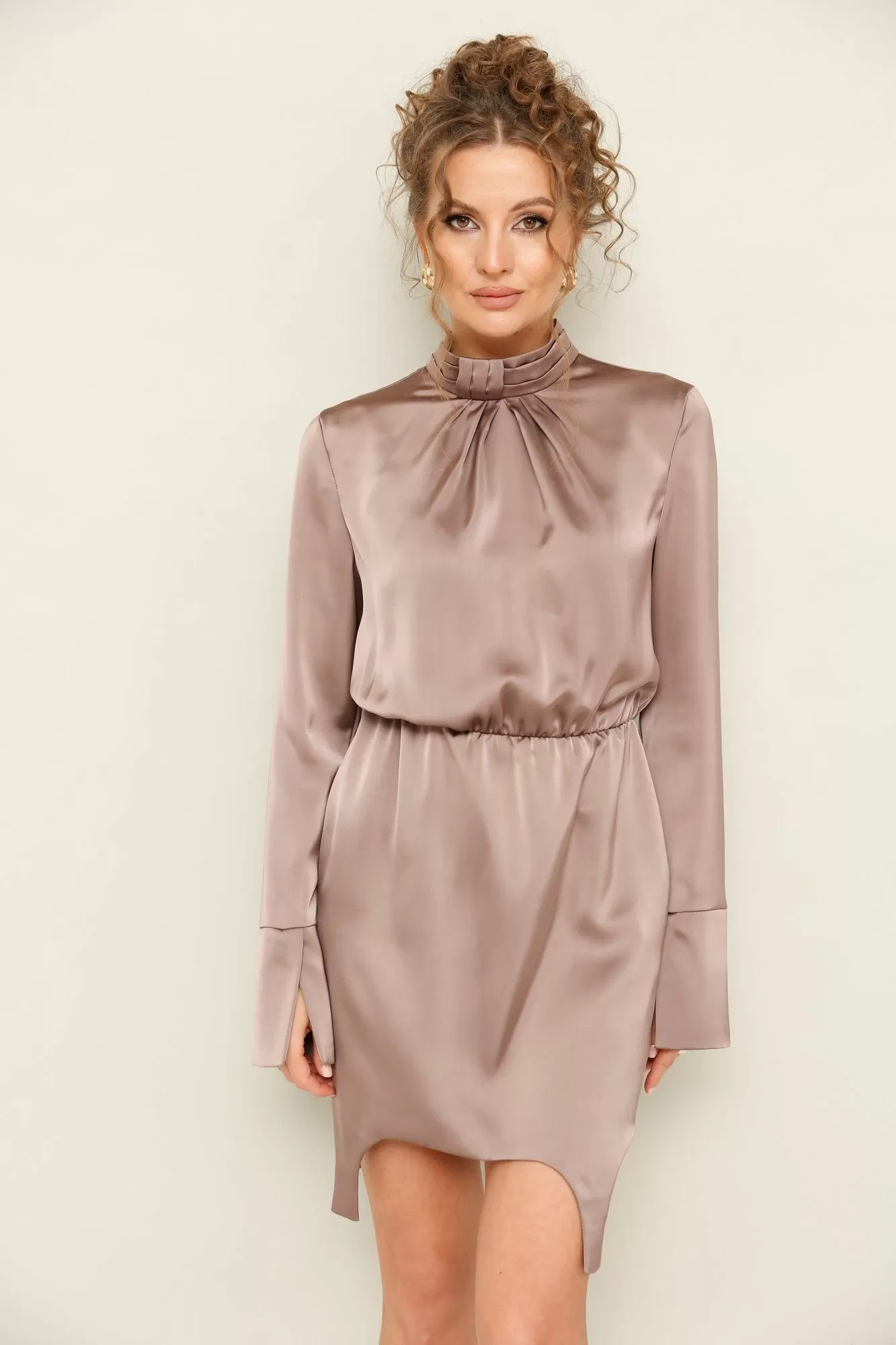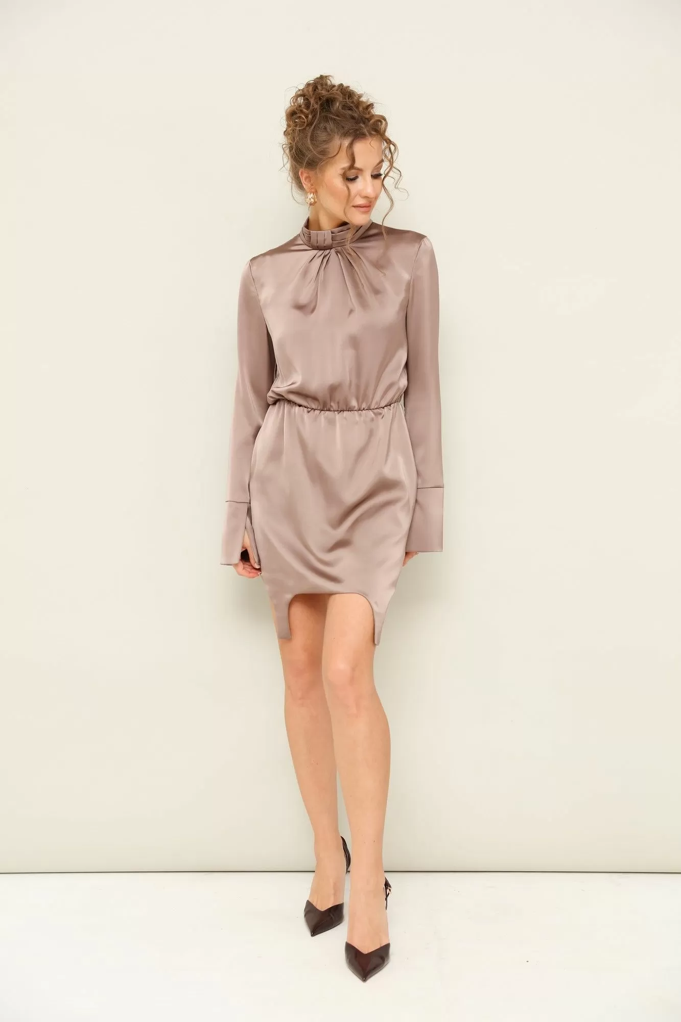 Стильное платье полуприлегающего силуэта, выполнено из струящейся ткани с матовым блеском. Платье отрезное по линии талии на резинке. Горловина с отрезной стойкой и лиф переда декорированы складками. Втачные длинные рукава с манжетами. В среднем шве спинки обработана застёжка на стойке на пуговицы и навесные петли. Низ платья фигурной формы.